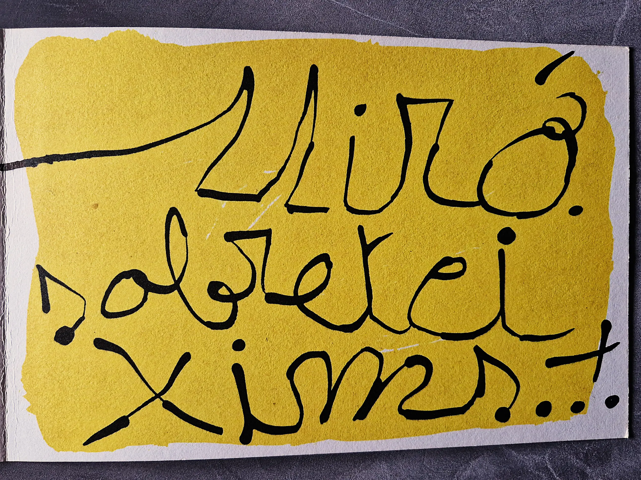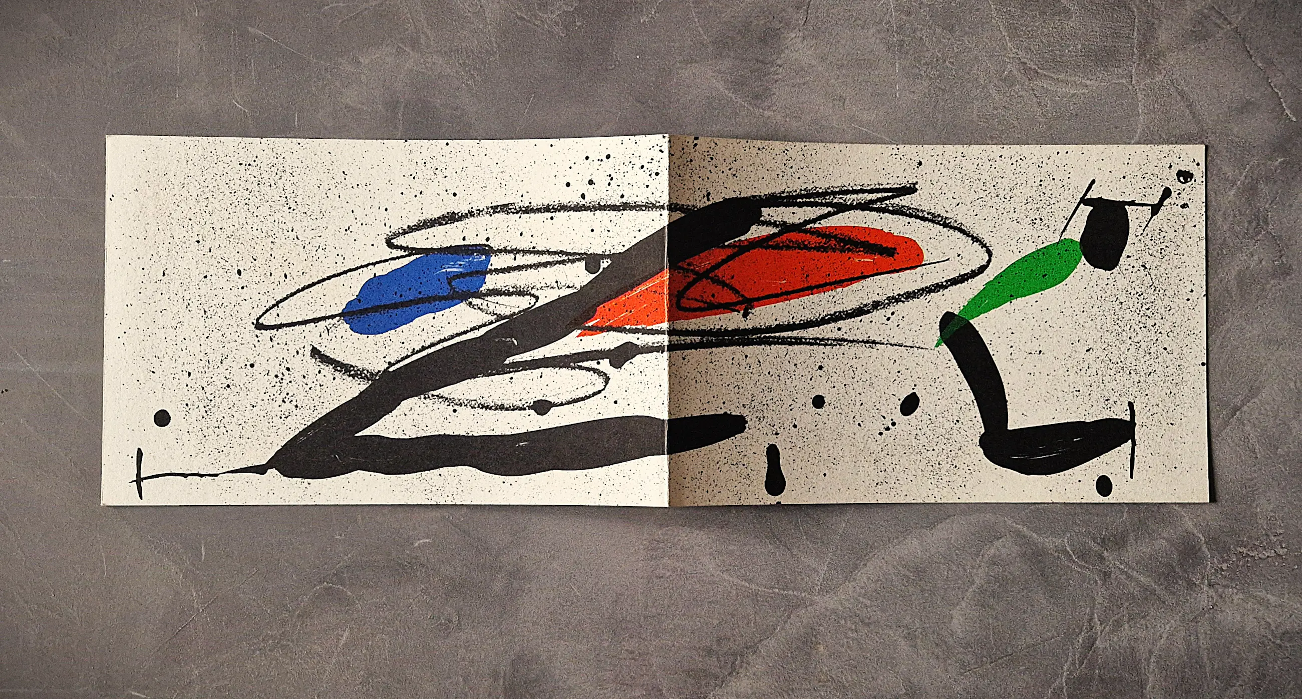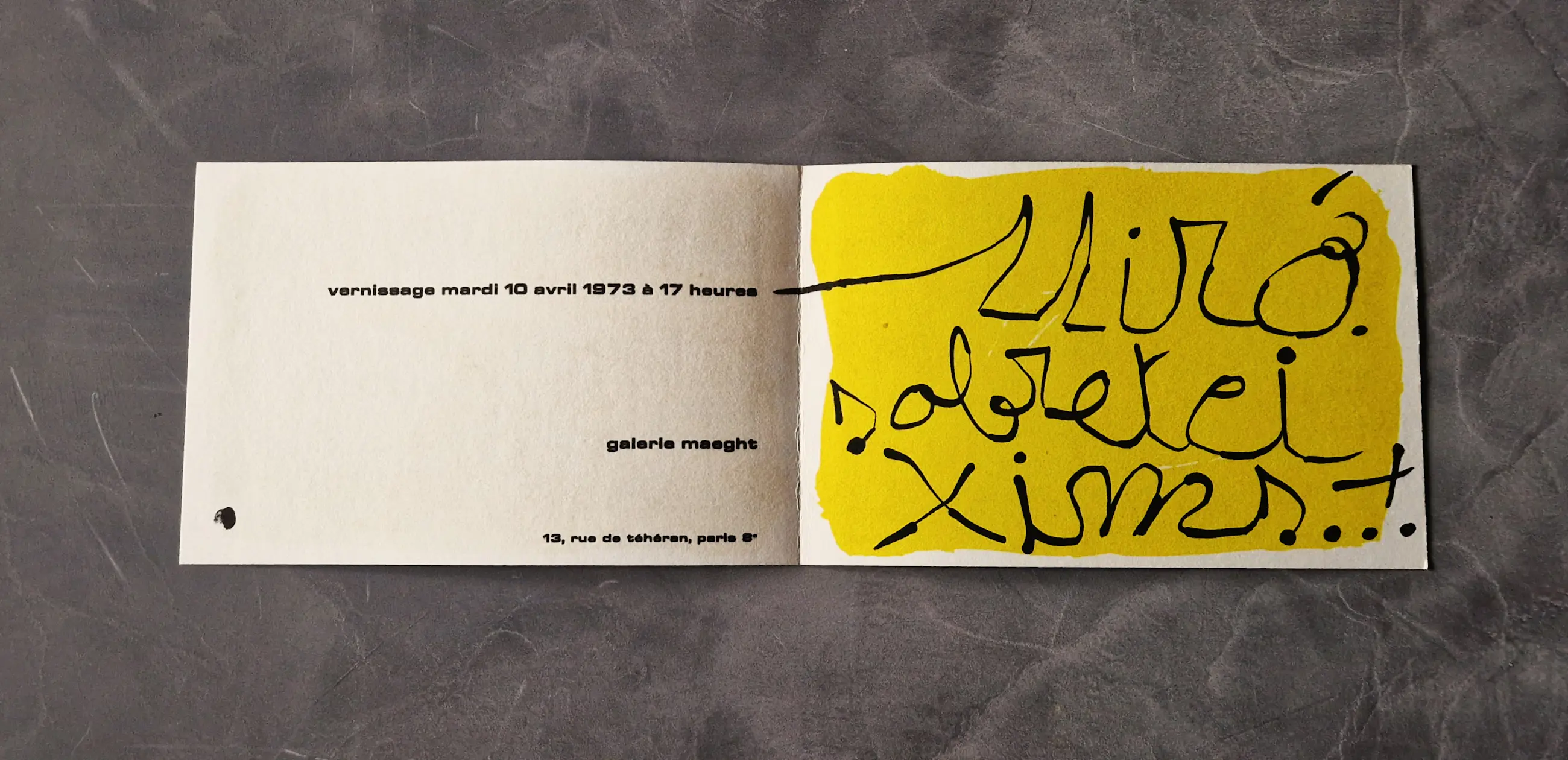 RARE! This original single-sheet April 10 1973 invitation "joan Miro - Sobreteixims" , containing an original joan Miro lithograph folded evenly in half, and produced by the formidable Galerie Maeght of Paris. Bright and Near Fine.