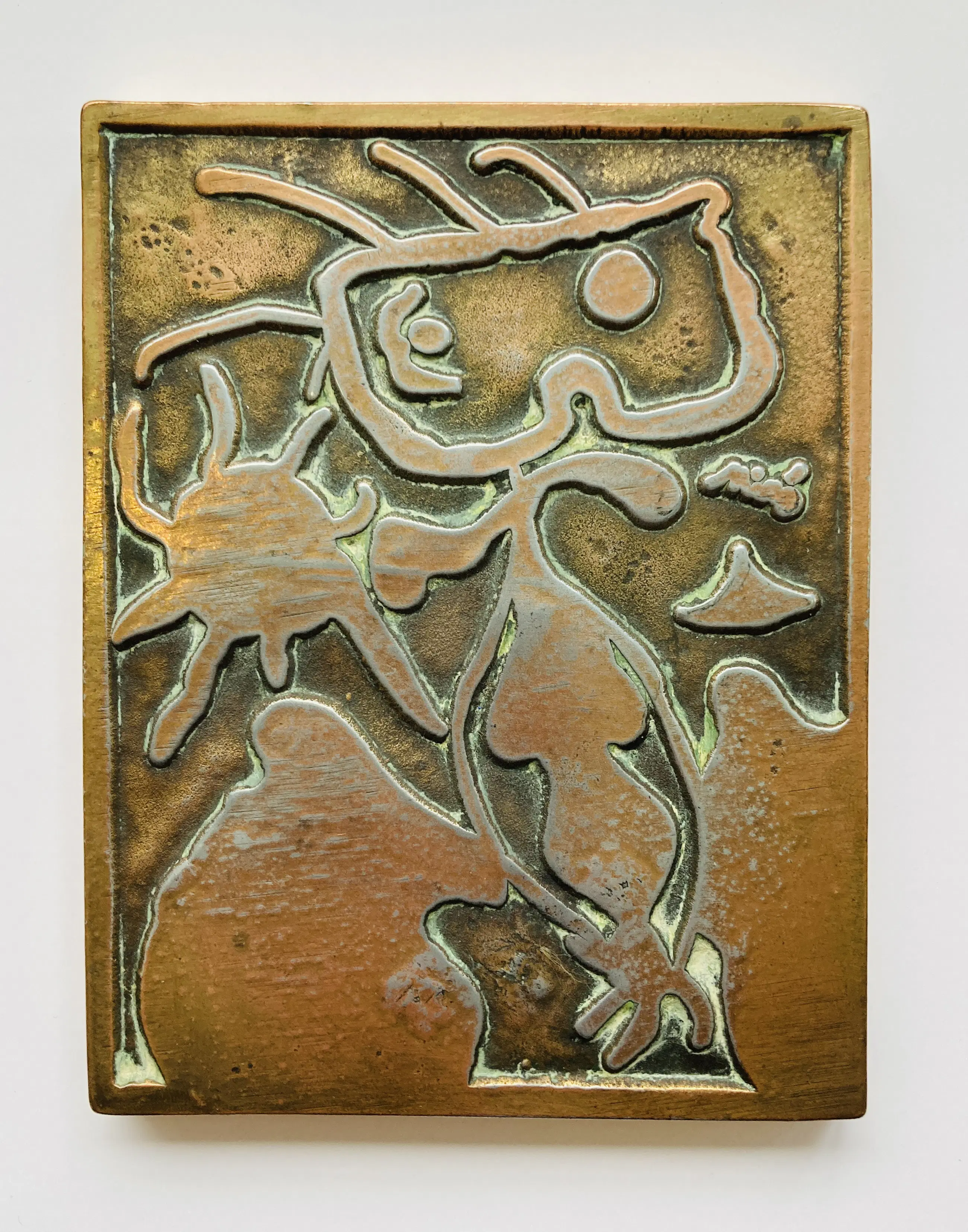 Zeldzame bronzen reliëf plaquette naar de linoleum snede " Femme el oiseau devant la lune " uit 1938 van Joan Miro. Het werk is in zeer goede staat. Op de achterzijde gesigneerd, betiteld en gedateerd. (zoals de linoleum snede).