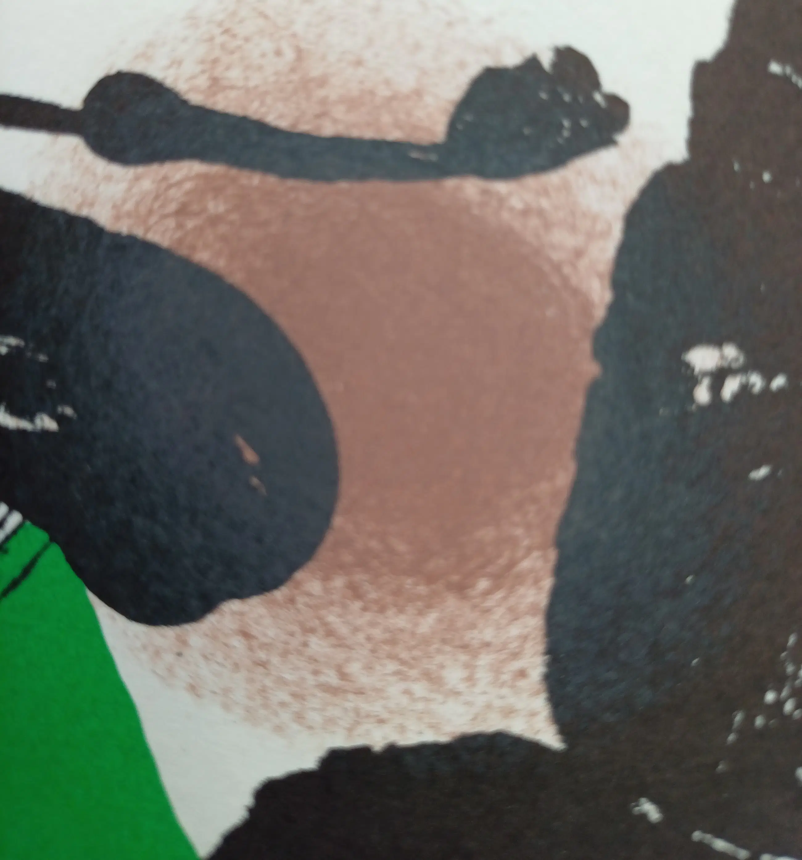 Ook hier weer is de lithografische druk van buitengewone kwaliteit. Dat is, zoals steeds, goed te zien in de superpositie van de kleuren (in twee bewegingen dus), in het bijzonder hier van zwart over de andere kleuren. Zie bijvoorbeeld linksboven onder de poten van het vogeltje (mengeling van zwart en purper), of rechtsonder (zeer uitgesproken: zwart over oker), of nog: linksonder (zwart over mauve). Zoiets ziet men nooit op een kunstdruk. Dat is alleen mogelijk als gedurende de lithografische arbeid de kleuren vrij snel na elkaar worden aangebracht en elkaar als het ware overschilderen. Dit geeft het werk een bijzondere charme en tegelijk is het een onmiskenbaar teken van originalteit.