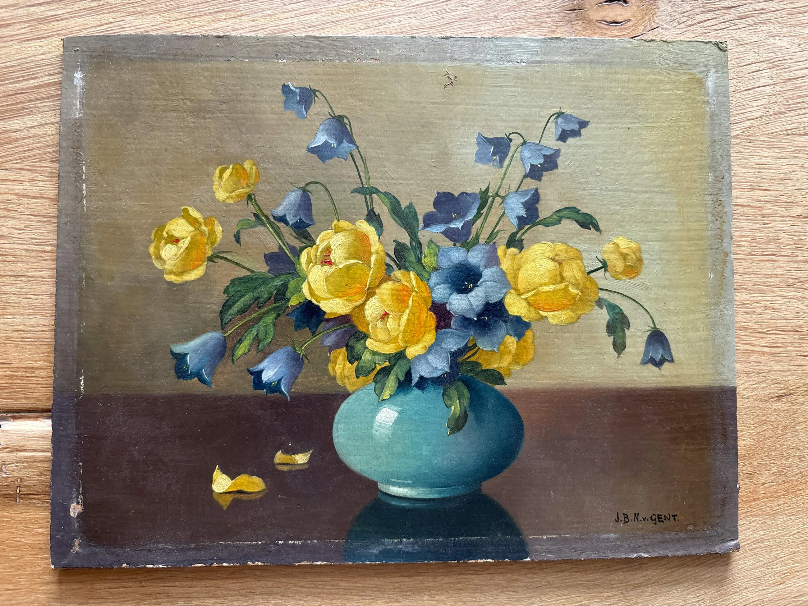 Het schilderij betreft een realistisch stilleven van joannes baptist Nicolaas van Gent. Het schilderij toont een boeket van gele en blauwe bloemen (mogelijk rozen en klokjesbloemen) in een ronde, blauwe vaas tegen een tweekleurige achtergrond. Geschilderd op hout en op de achterzijde staat de tekst: “ter herinnering aan uw huwelijk 1946”.