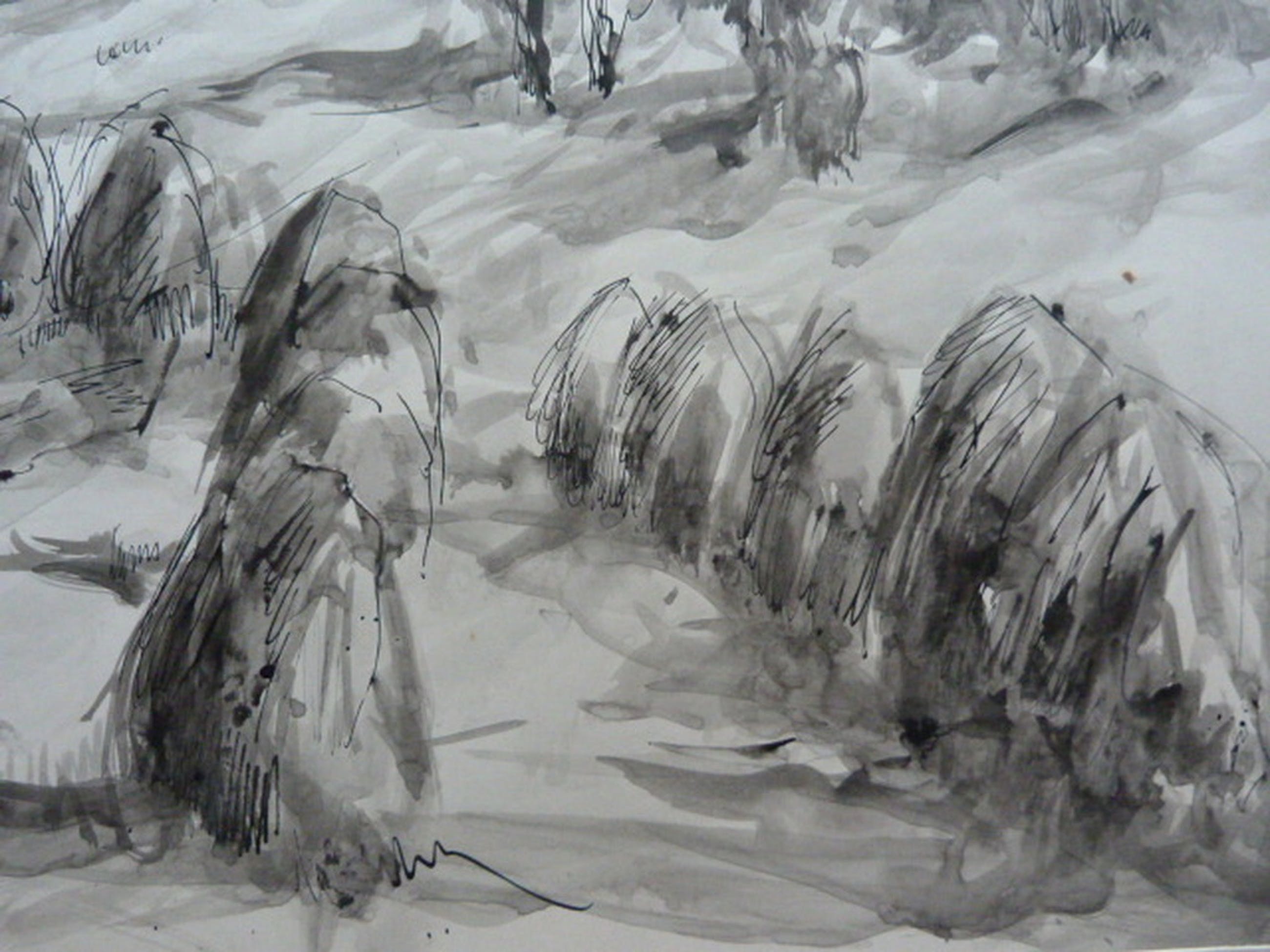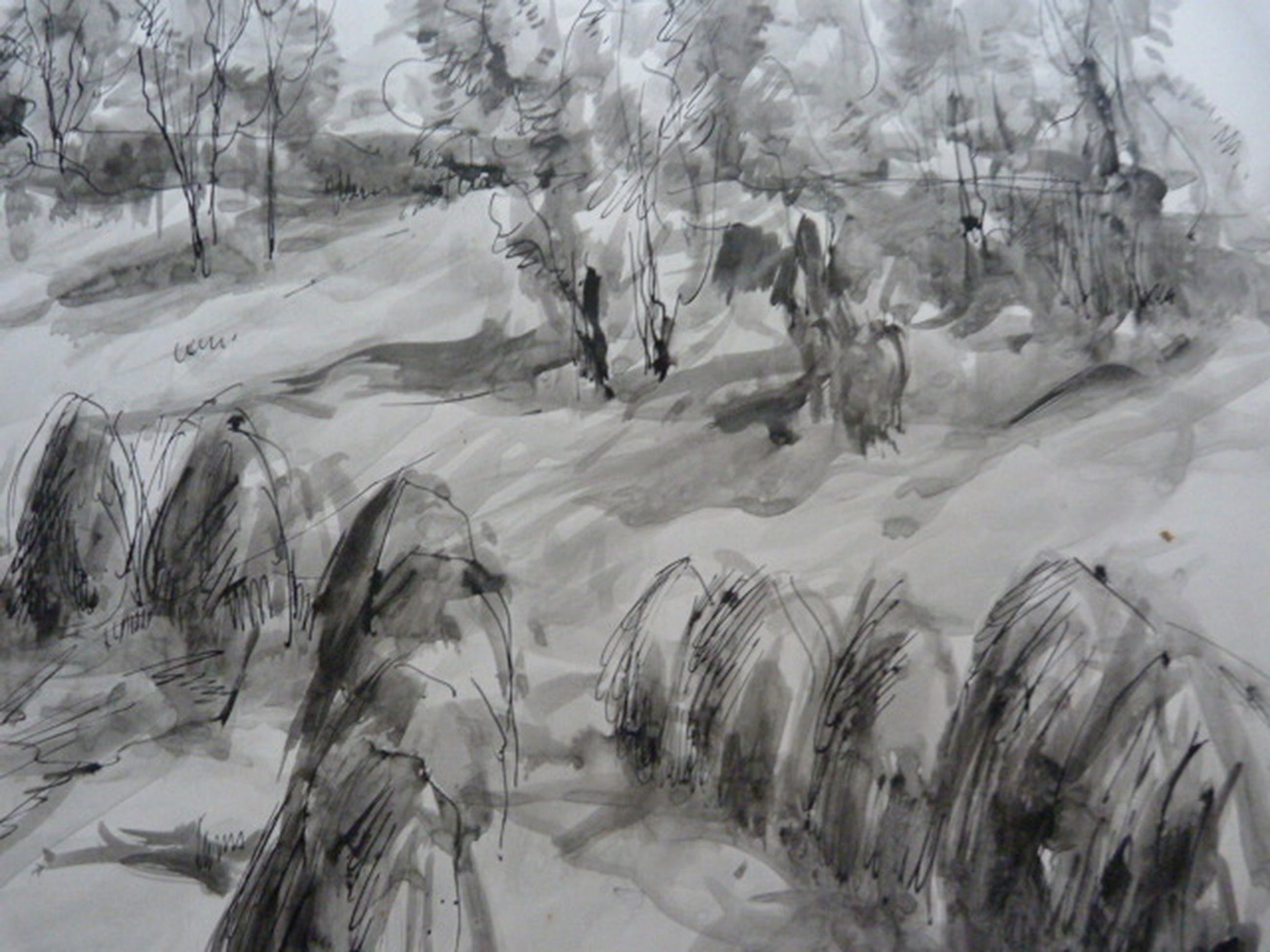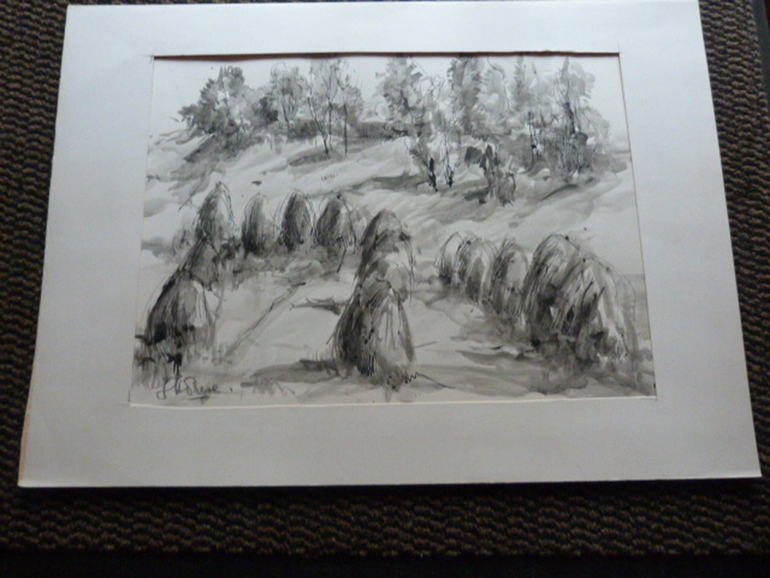Uit nalatenschap = tekening/aquarel - hooimijten. =