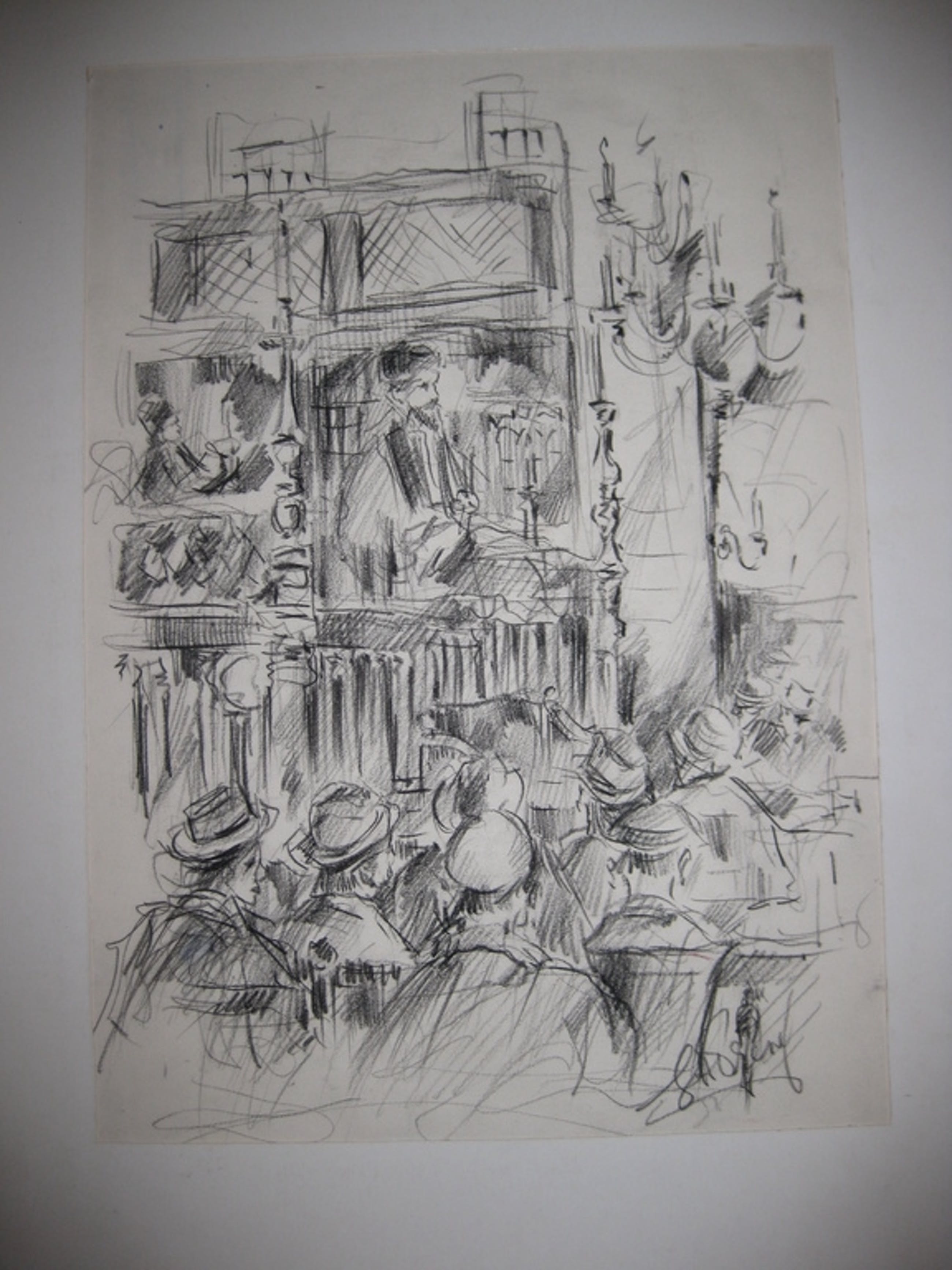 Schets met voorstelling van een Joodse bijeenkomst in de Portugese Synagoge