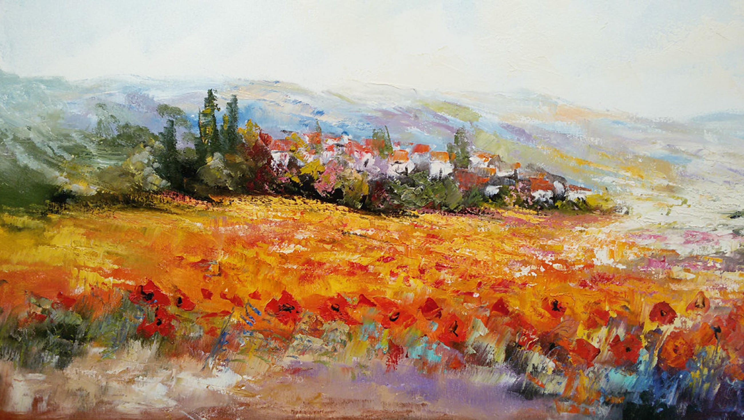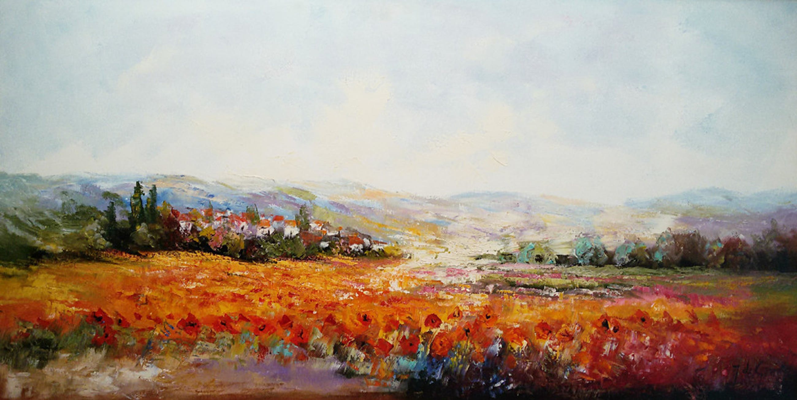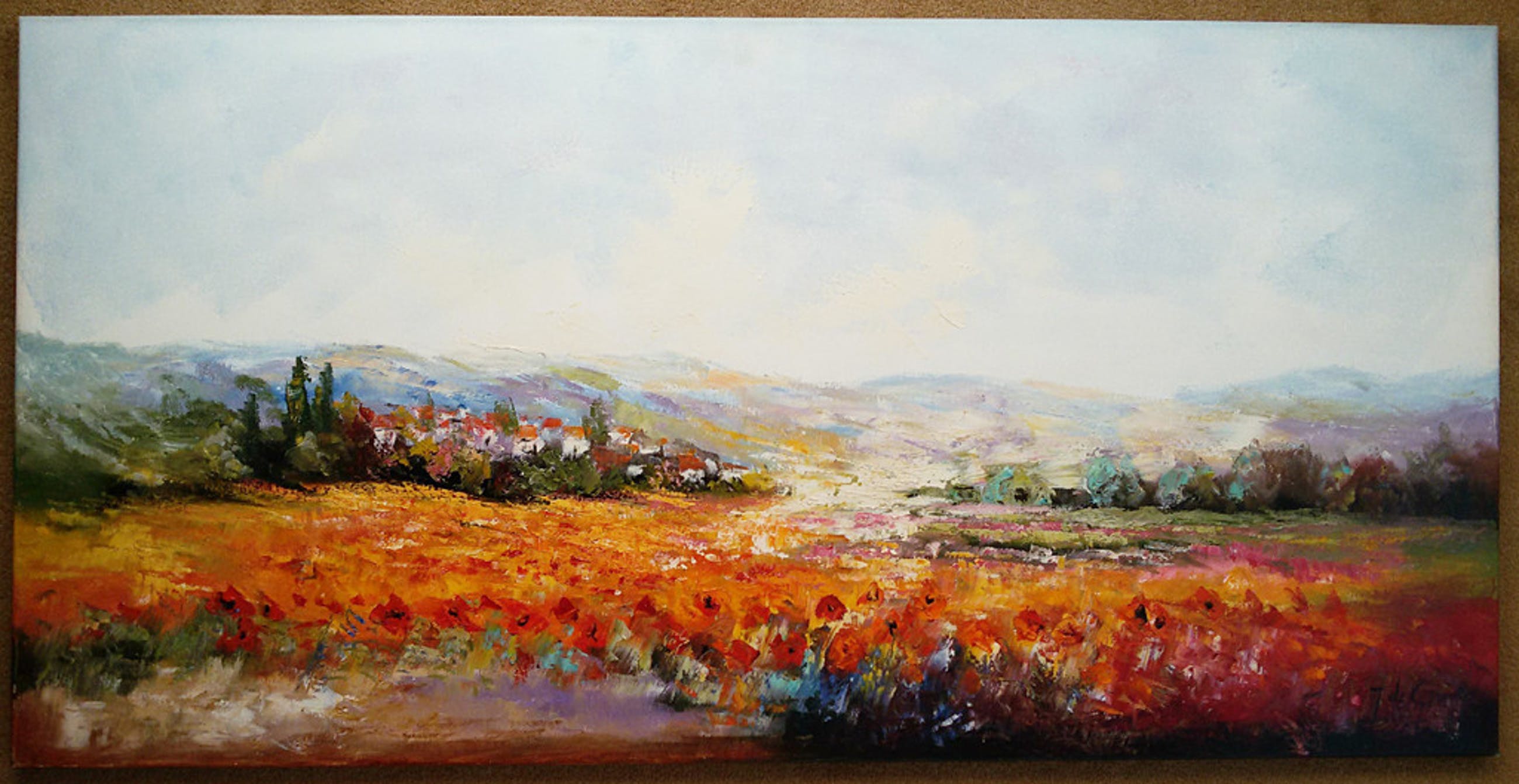 Mooi, weids opgezet landschap van Jochem de Graaf. Olieverf op doek, gesigneerd rechtsonder. In uitstekende conditie. Het werk is ook aan de zijkanten beschilderd en kan/moet dus zonder lijst worden opgehangen.