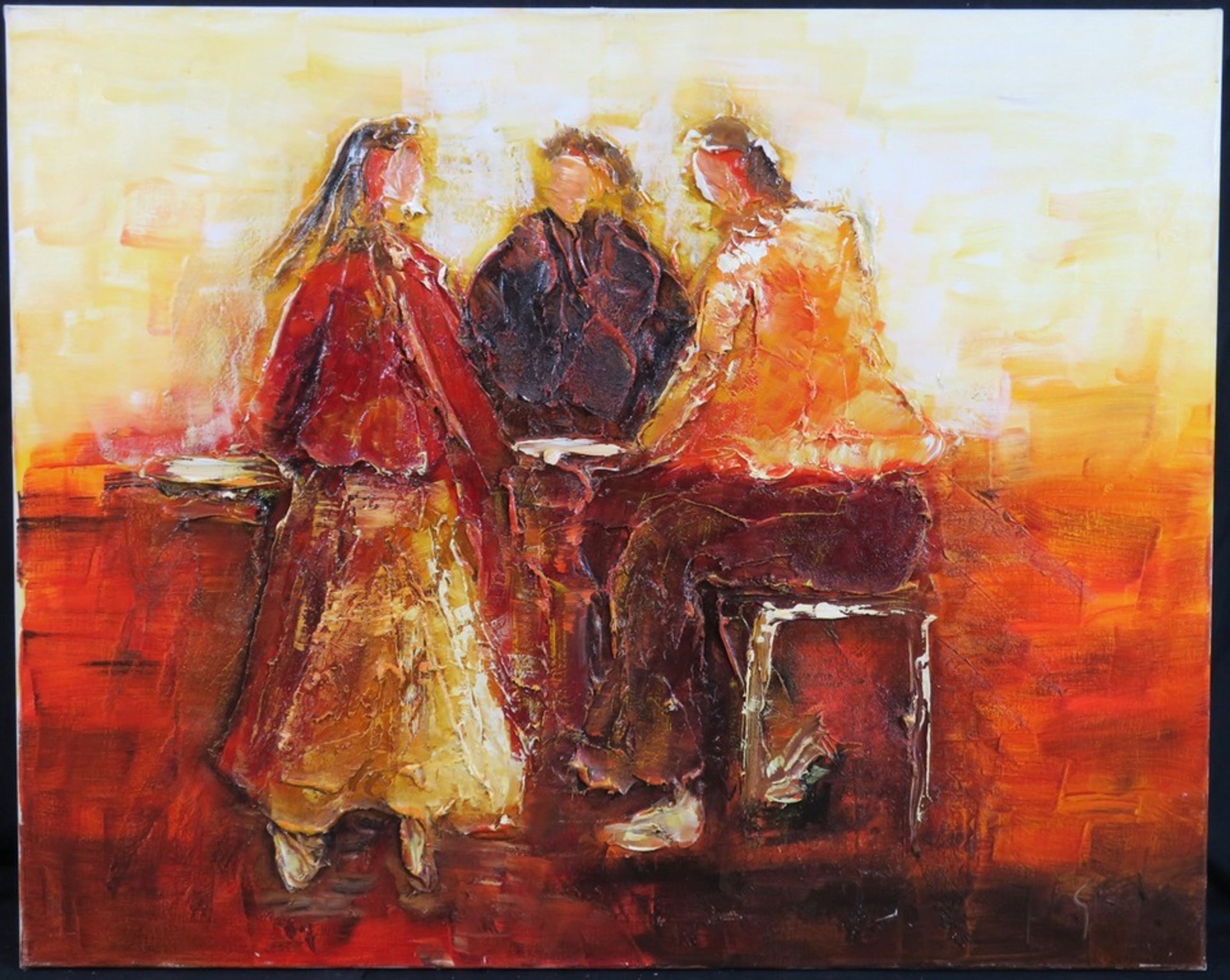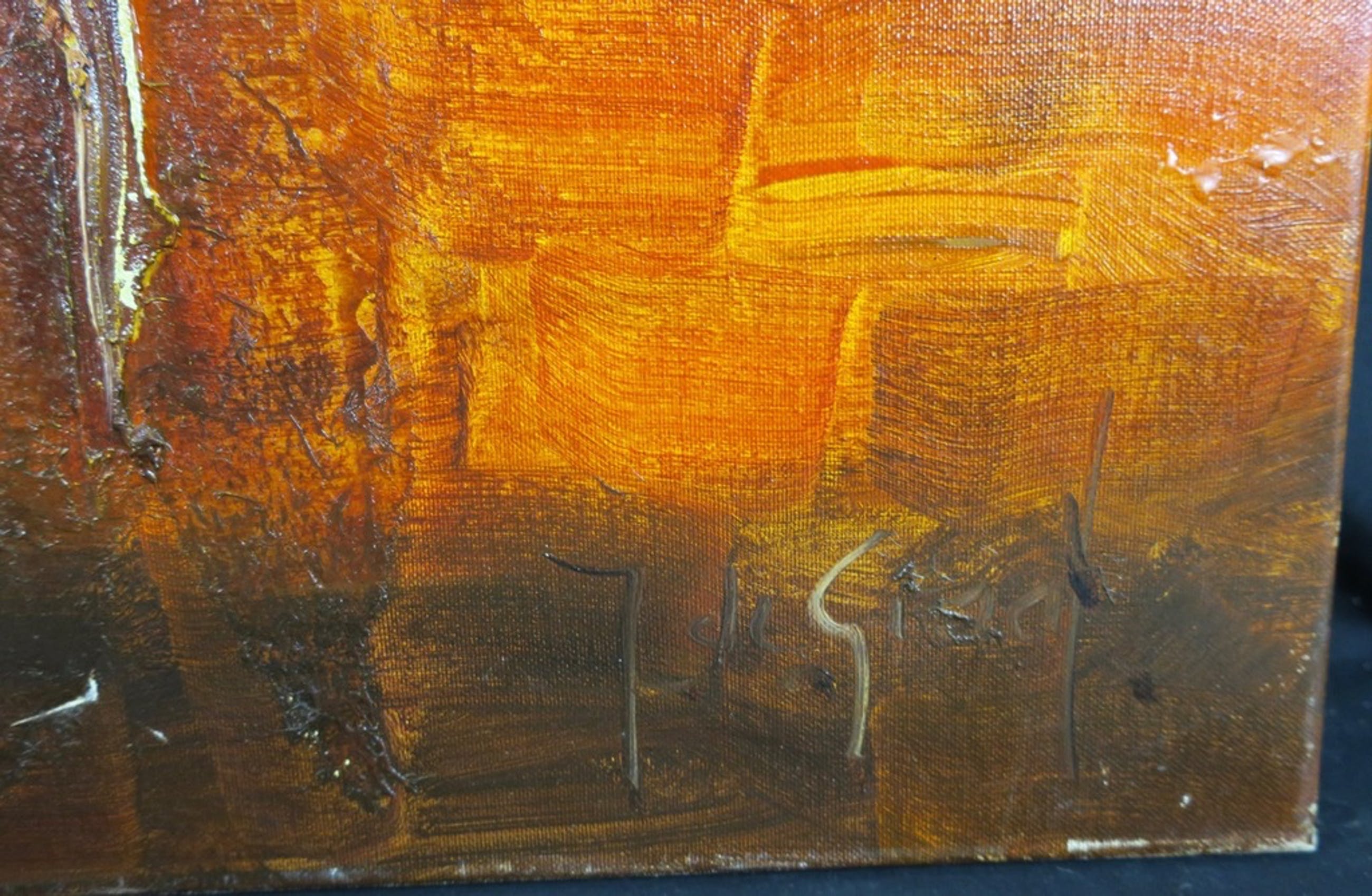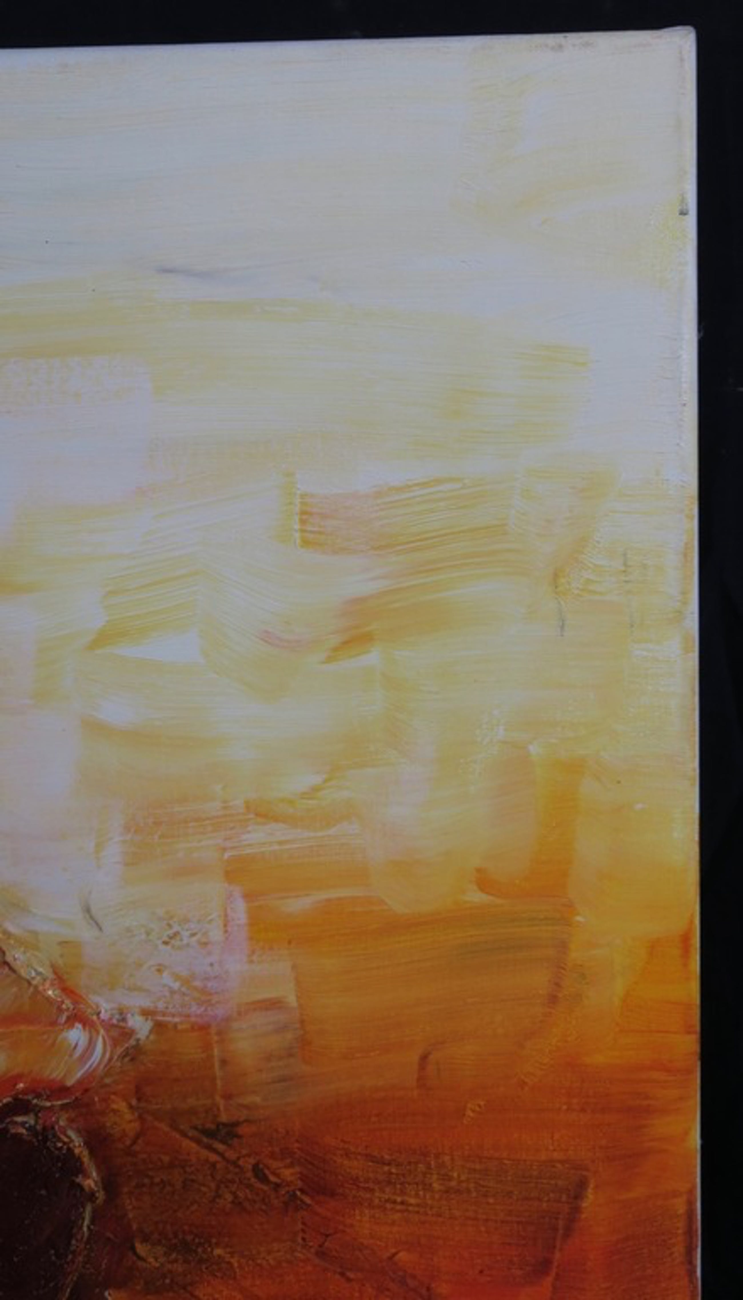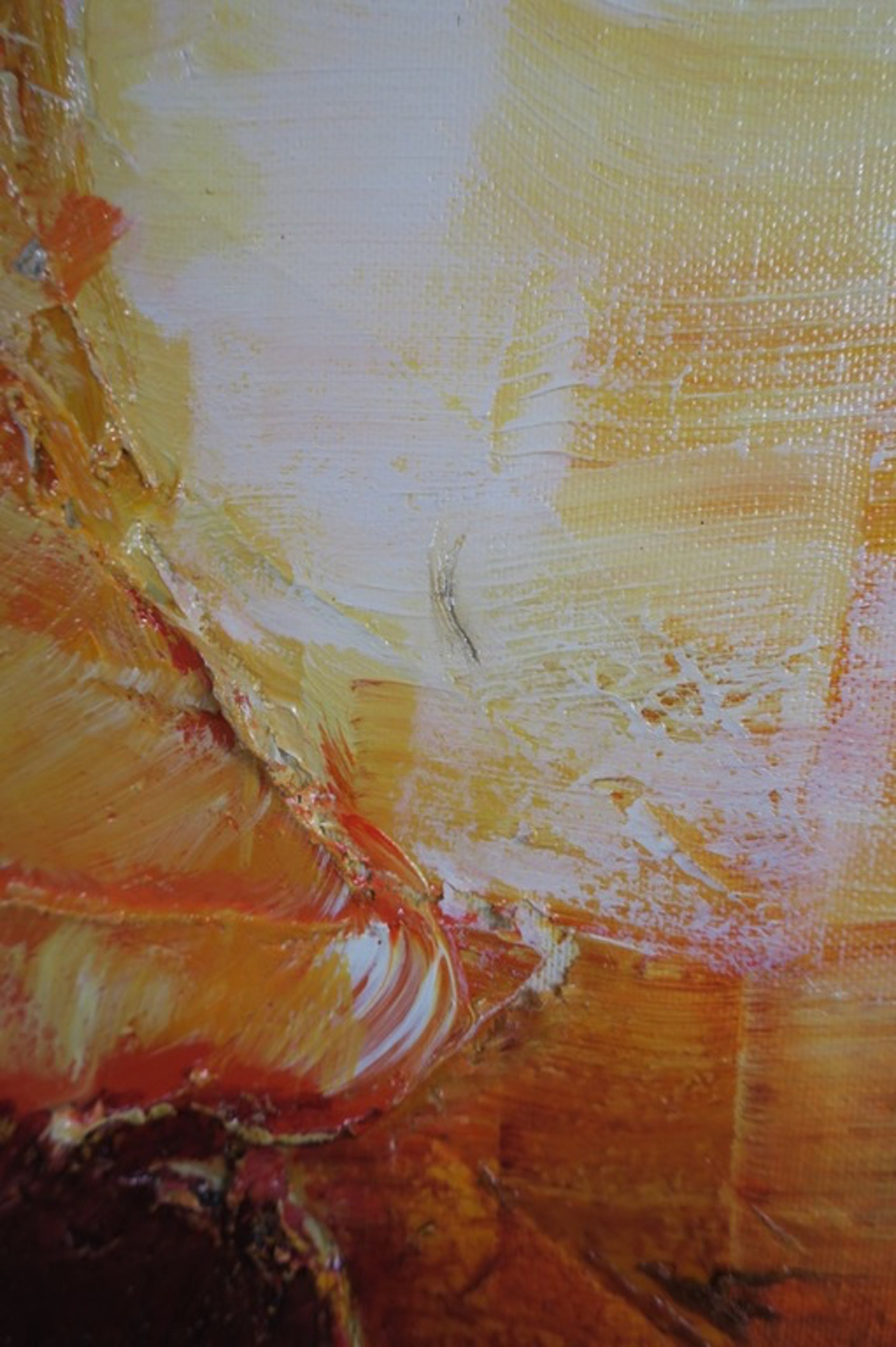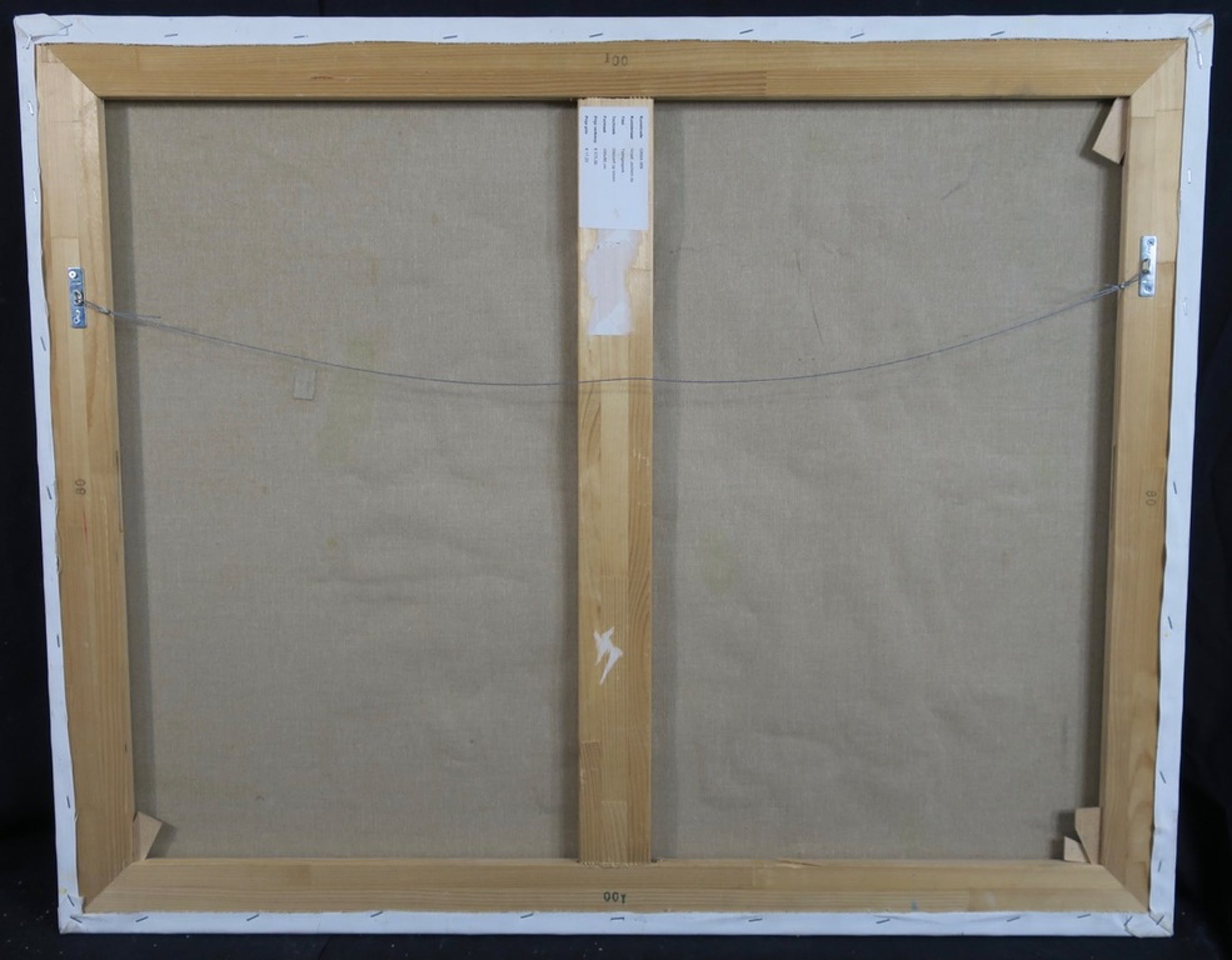 Conditie kunstwerk: In goede staat, maar met een gerestaureerd scheurtje en deel van de verf/impasto is van de ondergrond van het doek omhoog gaan staan (beide te zien op detailfoto), verder lichte beschadigingen langs de randen van het doek