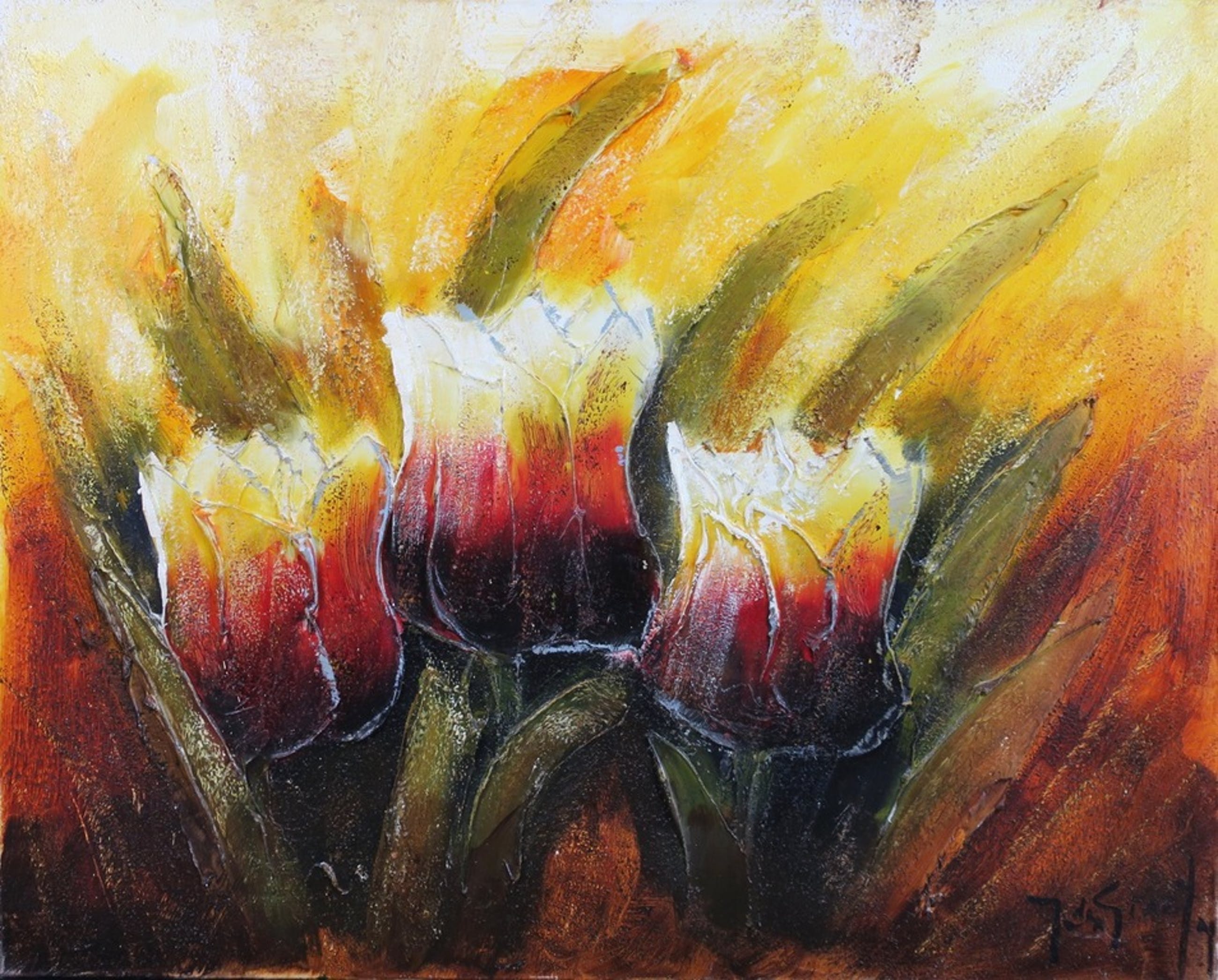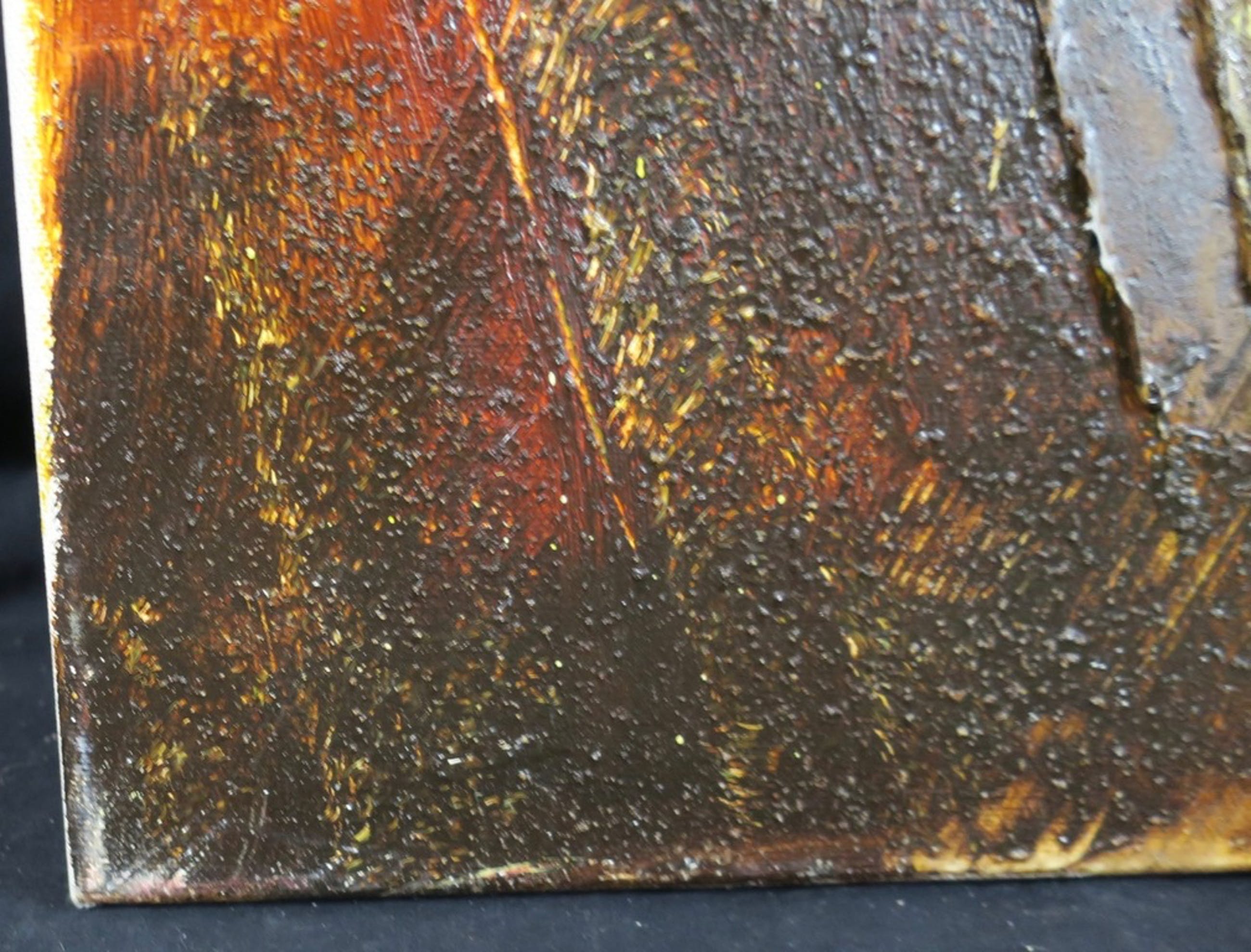 Conditie kunstwerk: In goede staat, enkele kleine stukjes vefverlies (afgebroken van dikke impasto) en wat lichte beschadigingen langs de randen en in de hoeken van het werk.