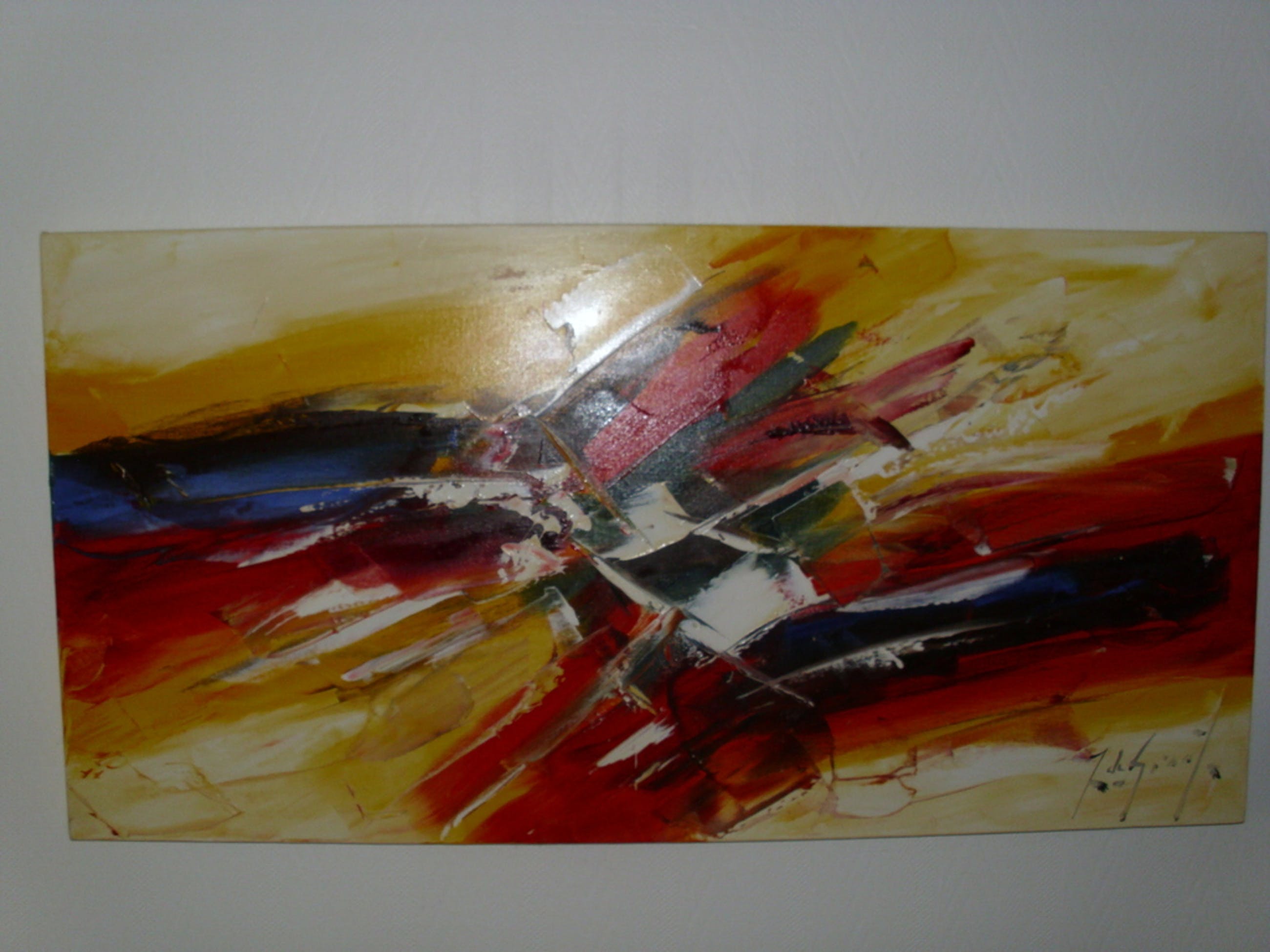 Schitterend doek van Jochem de Graaf uit amersfoort. Olieverf en gemaakt met palletmes.Veel rood en geel dus heel kleurig. Breed 120 cm , hoog 60 cm randen 4 cm en rondom meegeschilderd. Doek is ruim 10 jaar in ons bezit.Gekocht bij kunstgalerie in Kampen. Als het doek bezorgd moet worden komen de kosten koerier bij de biedprijs.