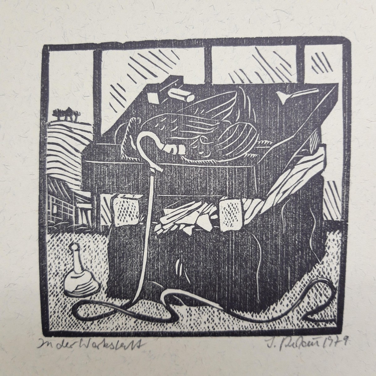 KLEINFORMATIGER HOLZSCHNITT IM FORMAT 175x250 MM. DRUCKBILD 110 x 105 MM. AUF CHAMOISE HADERN. MIT BLEISTIFT BEZEICHNET 'In der Werkstatt' UND SIGNIERT UND DATIERT 'J. Pechau 1979'. BLATTZUSTAND: EXCELLENT