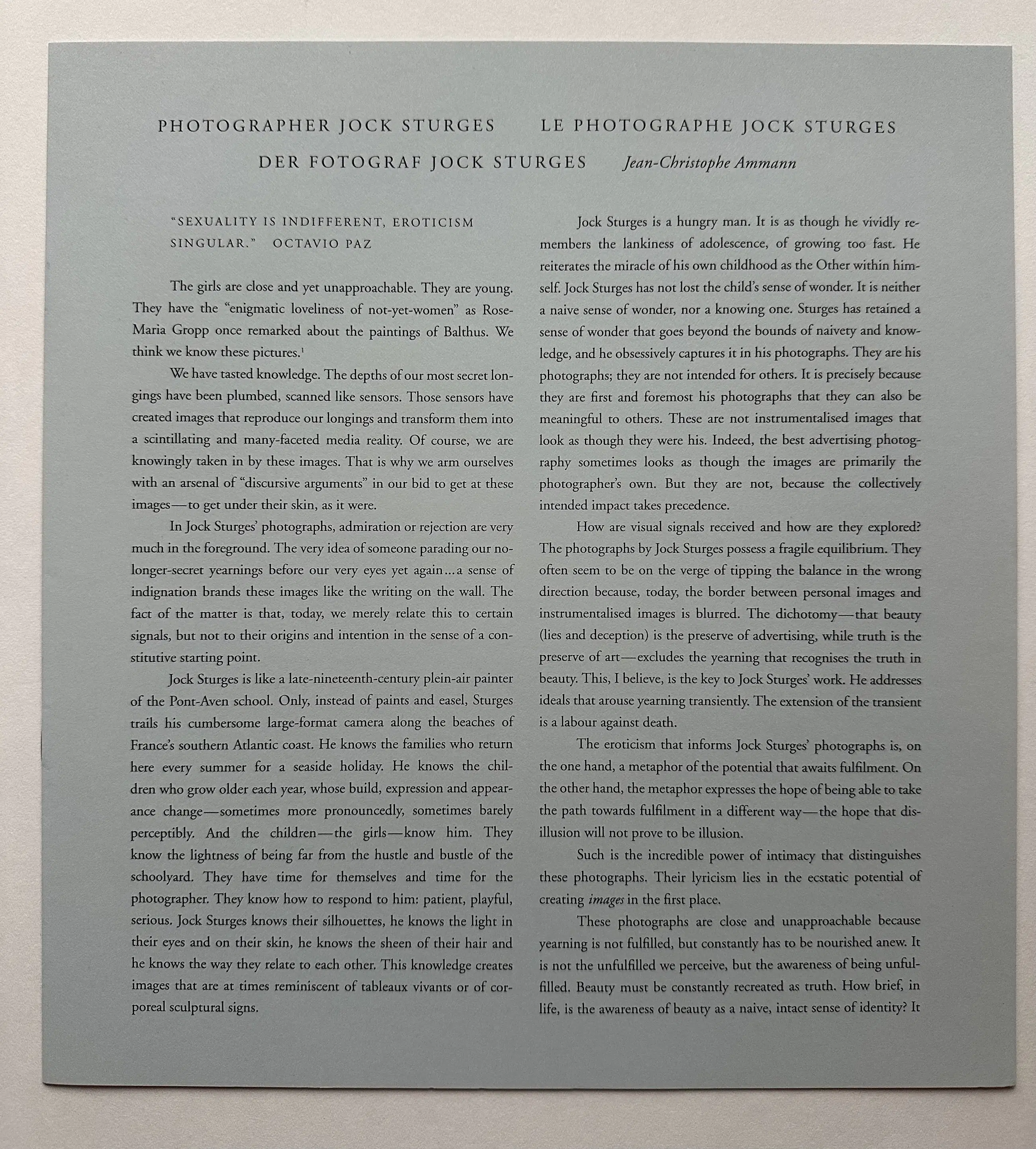 Dit is de eerste uitgebreide publicatie over de Amerikaanse fotograaf Jock Sturges (geb. 1947) die de kunstenaar zelf samenstelt. Het is niets minder dan een ode aan schoonheid. Al meer dan twintig jaar fotografeert hij meisjes die opgroeien, zowel in zijn geboorteplaats Californië als in een nudistenresort aan de Atlantische kust van Frankrijk. Naaktheid in Sturges' werk is nooit een goedkope of smakeloze gimmick geweest, maar wordt eerder getoond als de natuurlijke staat van de mens. Zijn foto's zijn een uiting van het vertrouwen dat hij in de loop der jaren heeft opgebouwd bij de meisjes en hun families. Kalm en bijna terloops observeert Sturges het verouderingsproces van zijn modellen. Zijn opvallende langetermijnstudies brengen nauwelijks waarneembare veranderingen in hun uiterlijk in kaart, de langzame rijping van het vrouwelijk lichaam. Sturges bewaart voorbijgaande toestanden die nooit meer terugkeren; sierlijke vormen die de tijd uiteindelijk zal uitdoven. Een zoete melancholie doordringt Sturges' beelden, omdat hij weet dat schoonheid geen eeuwige staat is, maar een kort moment in de tijd waarvan we de essentie moeten koesteren.