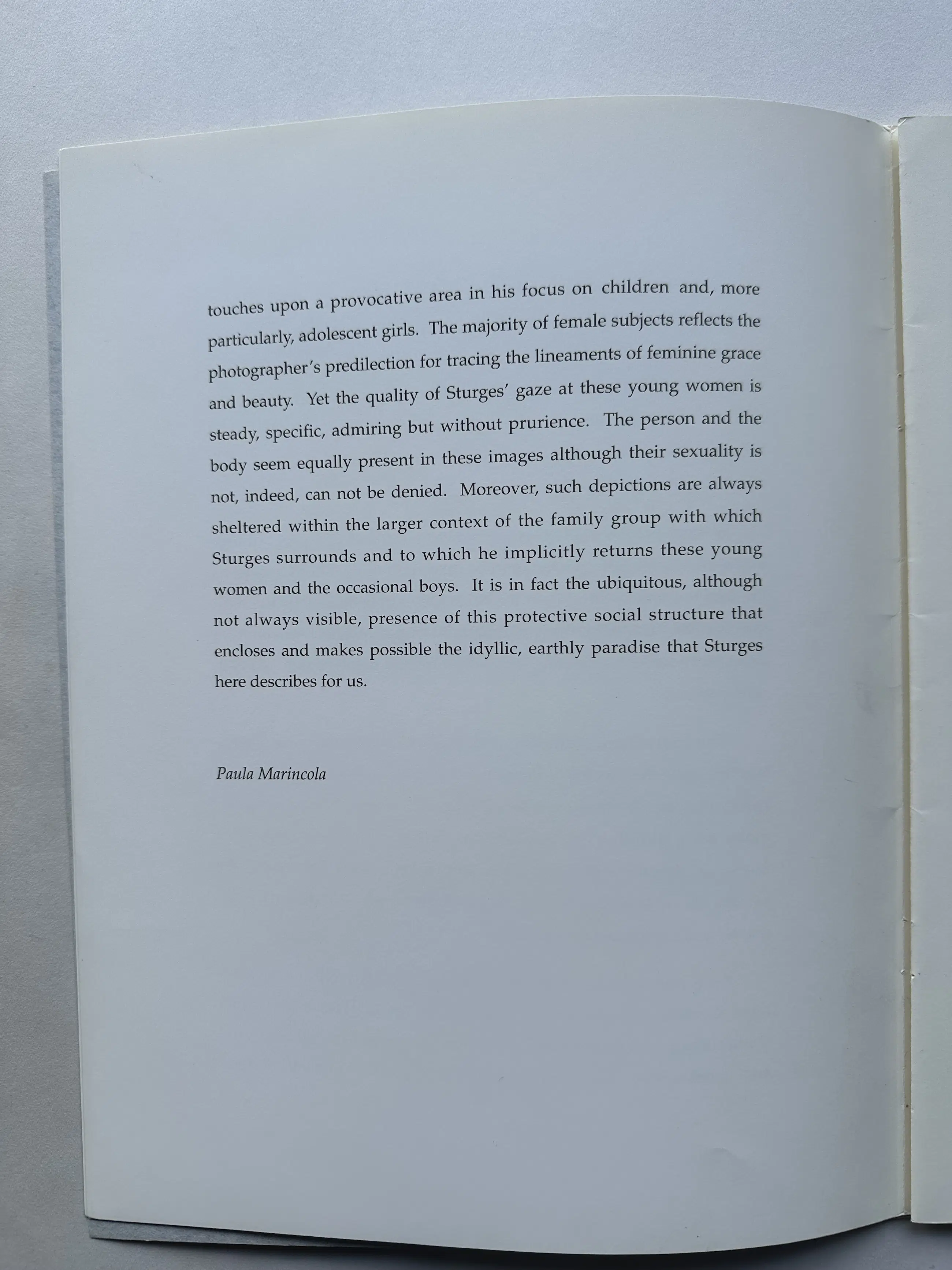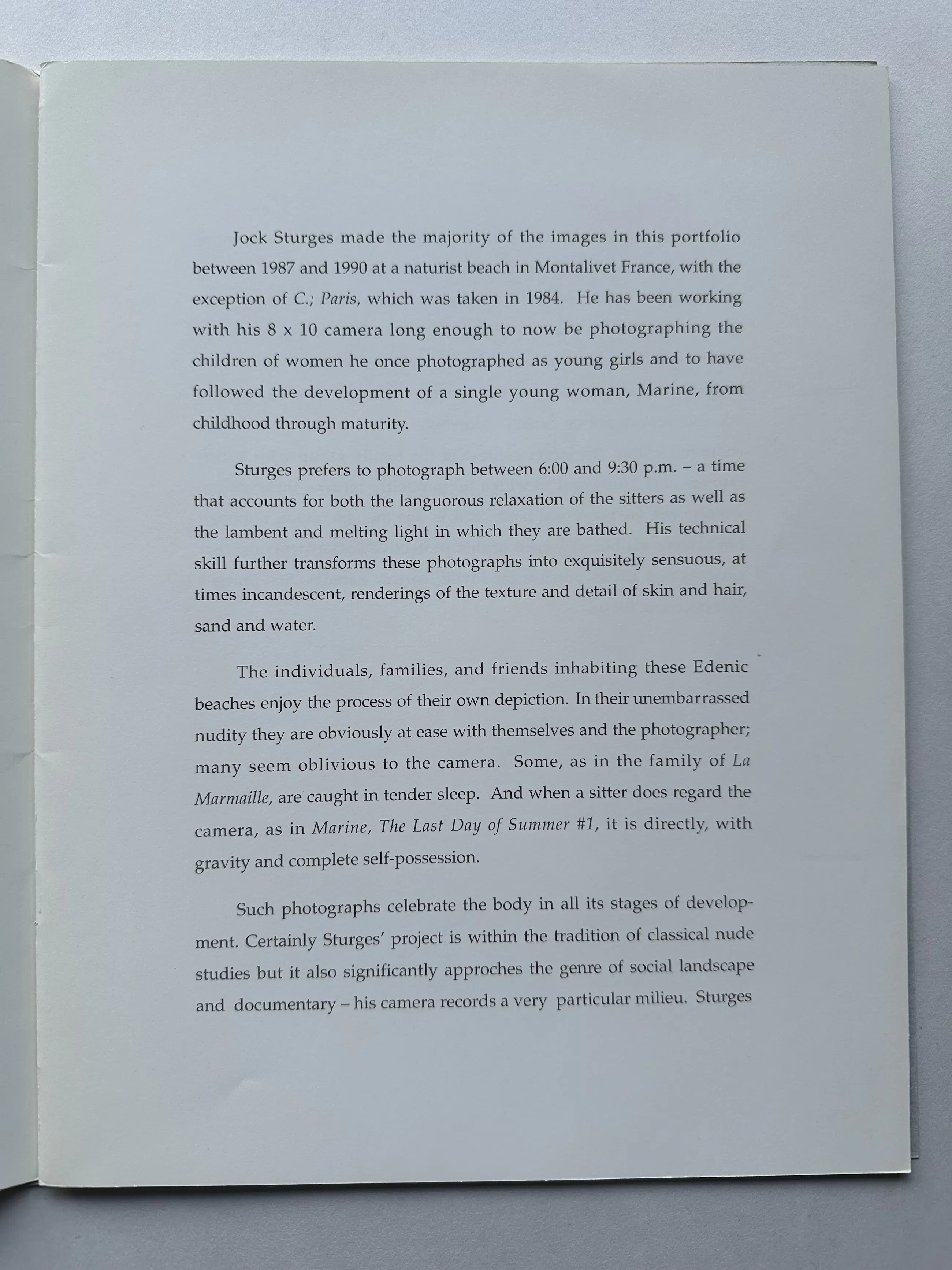 Philadelphia: Paul Cava Gallery, 1991. 1992. omslag (rug onderaan zeer licht beschadigd). Met 7 (in plaats van 10) gelakte duotine foto's door Jock Sturges. Editie van 1000 exemplaren, 1992. De 7 foto's door Jock Sturges zijn in perfecte staat. (Helaas incompleet, maar zeldzaam)