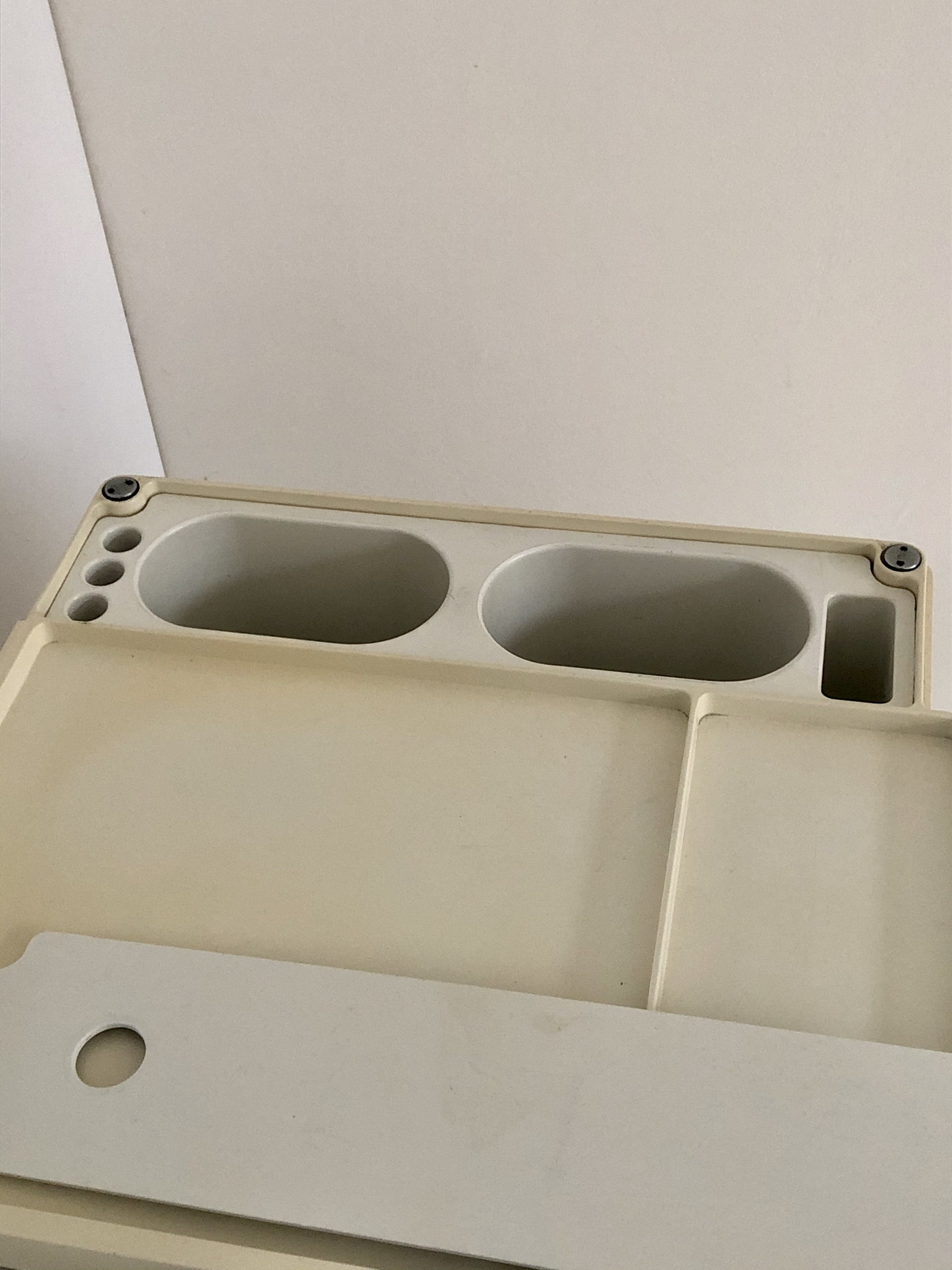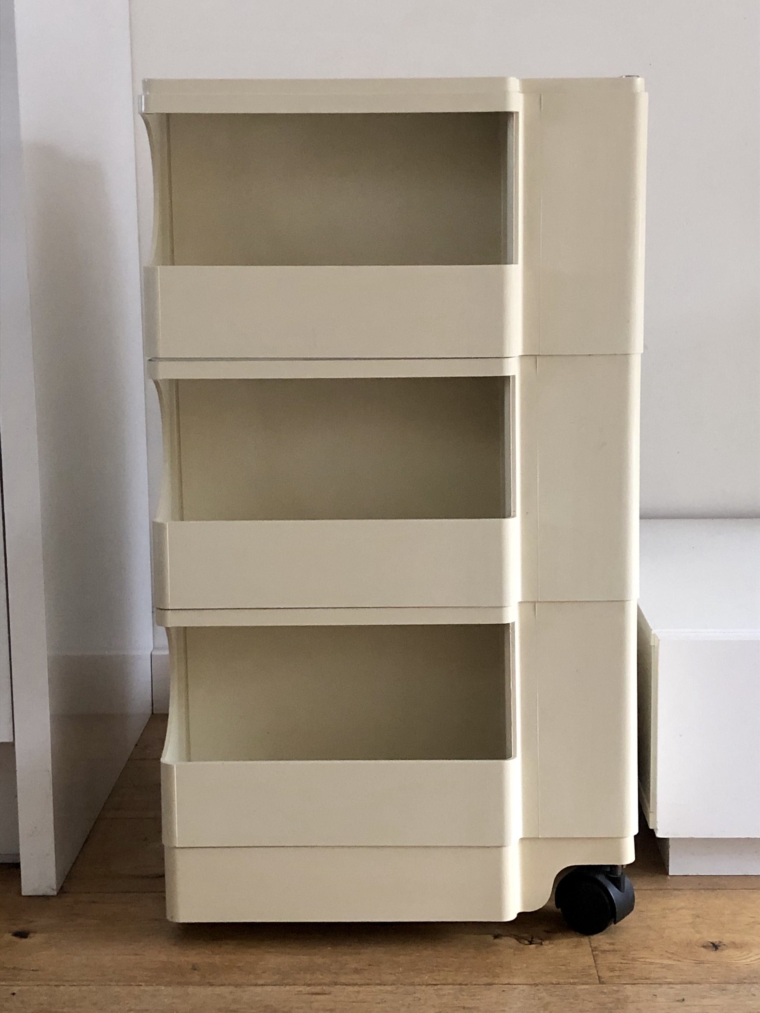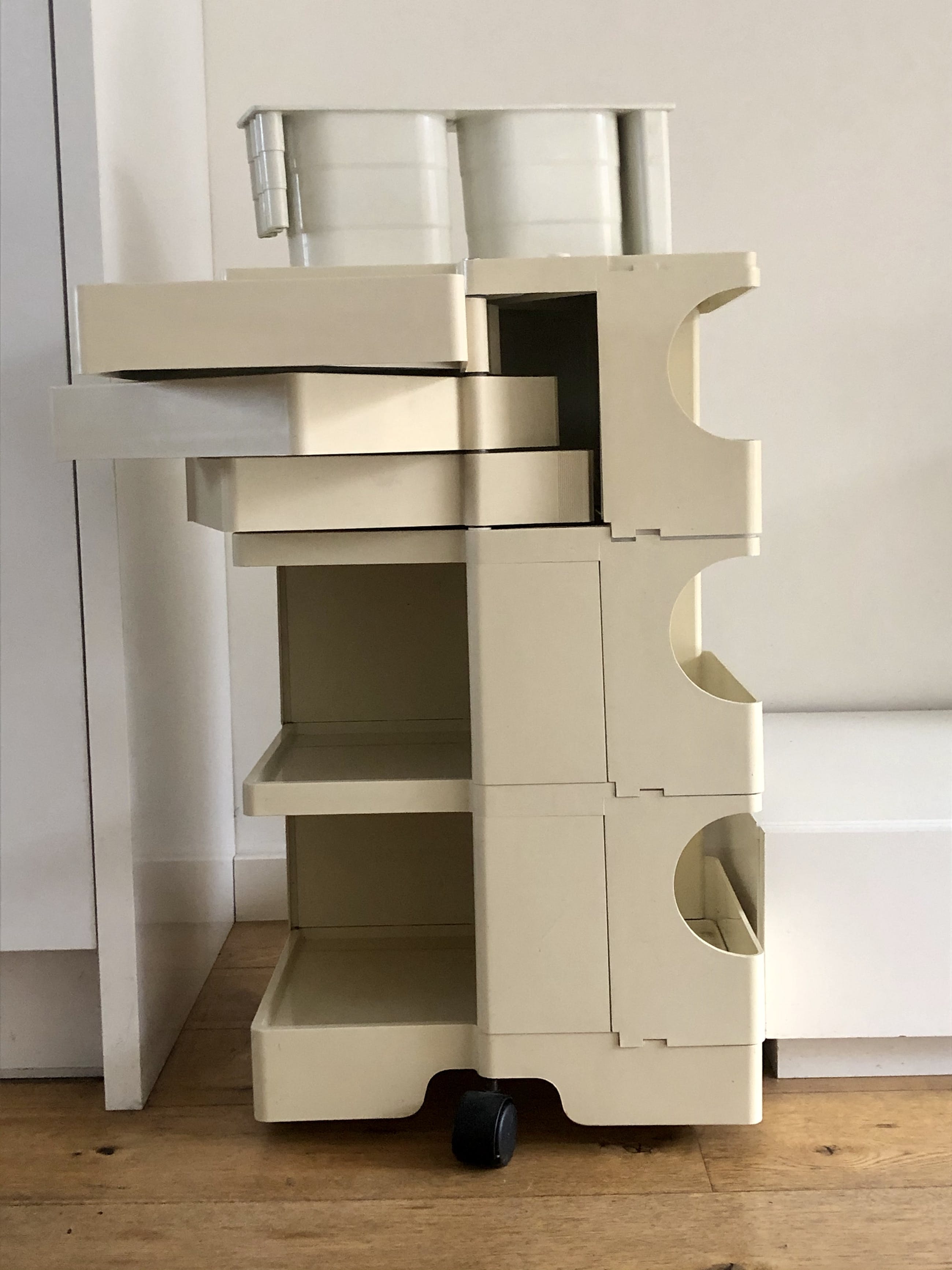 Design Icoon "BOBY" ontworpen door Joe Colombo in 1970. Het betreft een zeer goed uitgerust exemplaar met zelfs nog de originele sleutel. De troley verkeerd in goede gebruikte staat met wat kleurverschil, vergeling en een kleine beschadiging op de bovenkant, zie foto's.