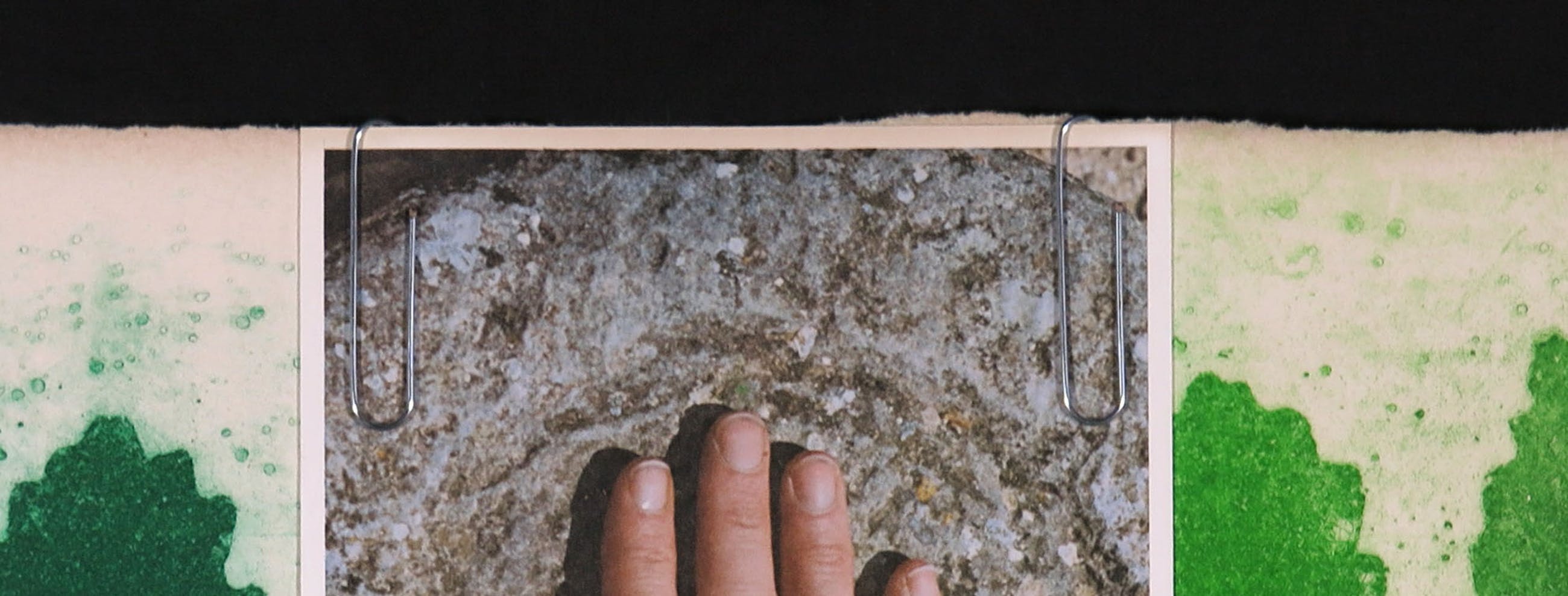 In de hoeken zijn metalen ringen bevestigt. Langs de bovenste rand is een foto met paperclips aan het blad bevestigd.