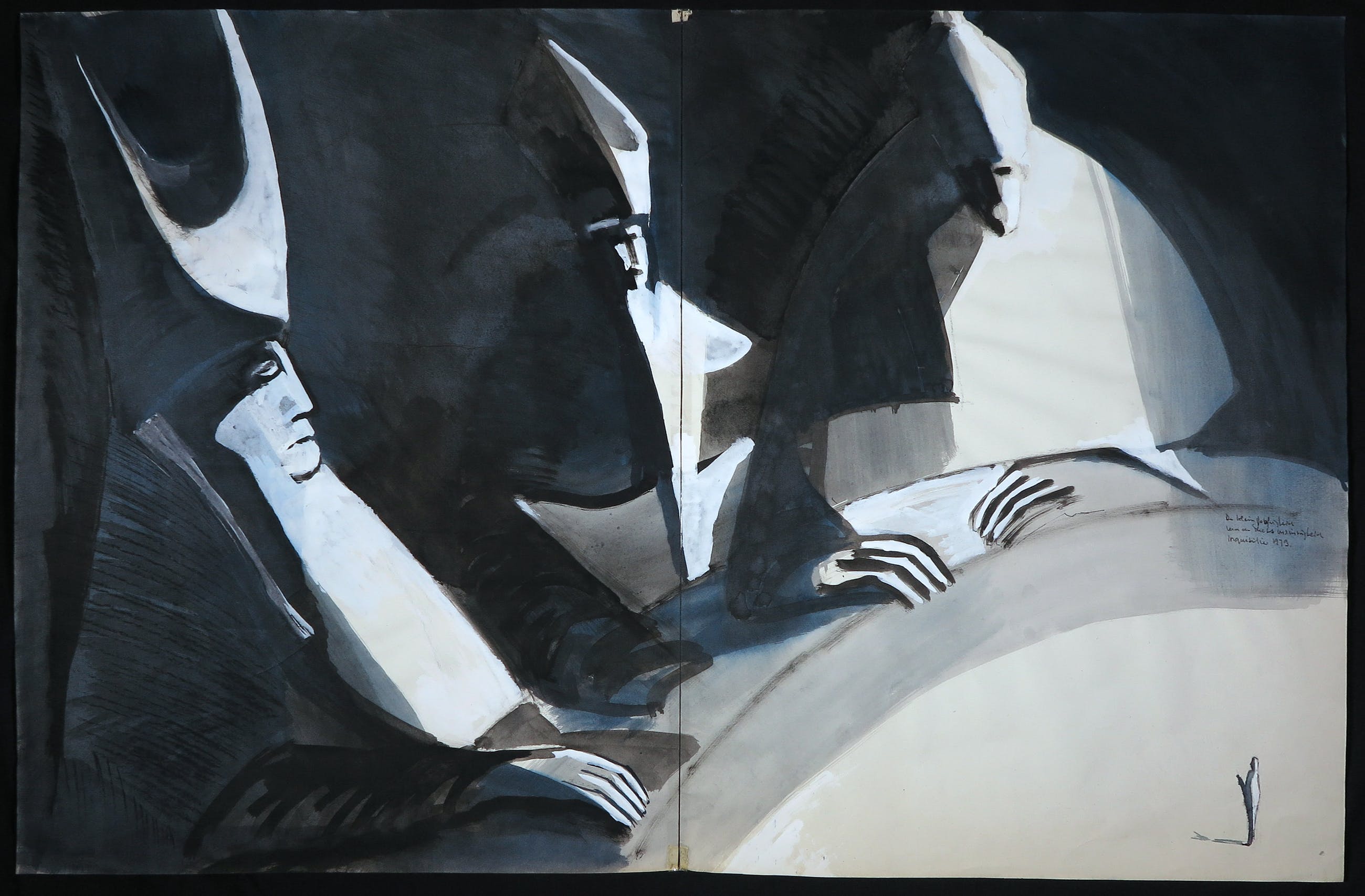 | Het werk is in goede staat, het is wel verkleurd onder aan de rechterkant. Dit werk zijn twee aparte bladen die aan elkaar vast zijn geplakt in het midden. | |||||||||||