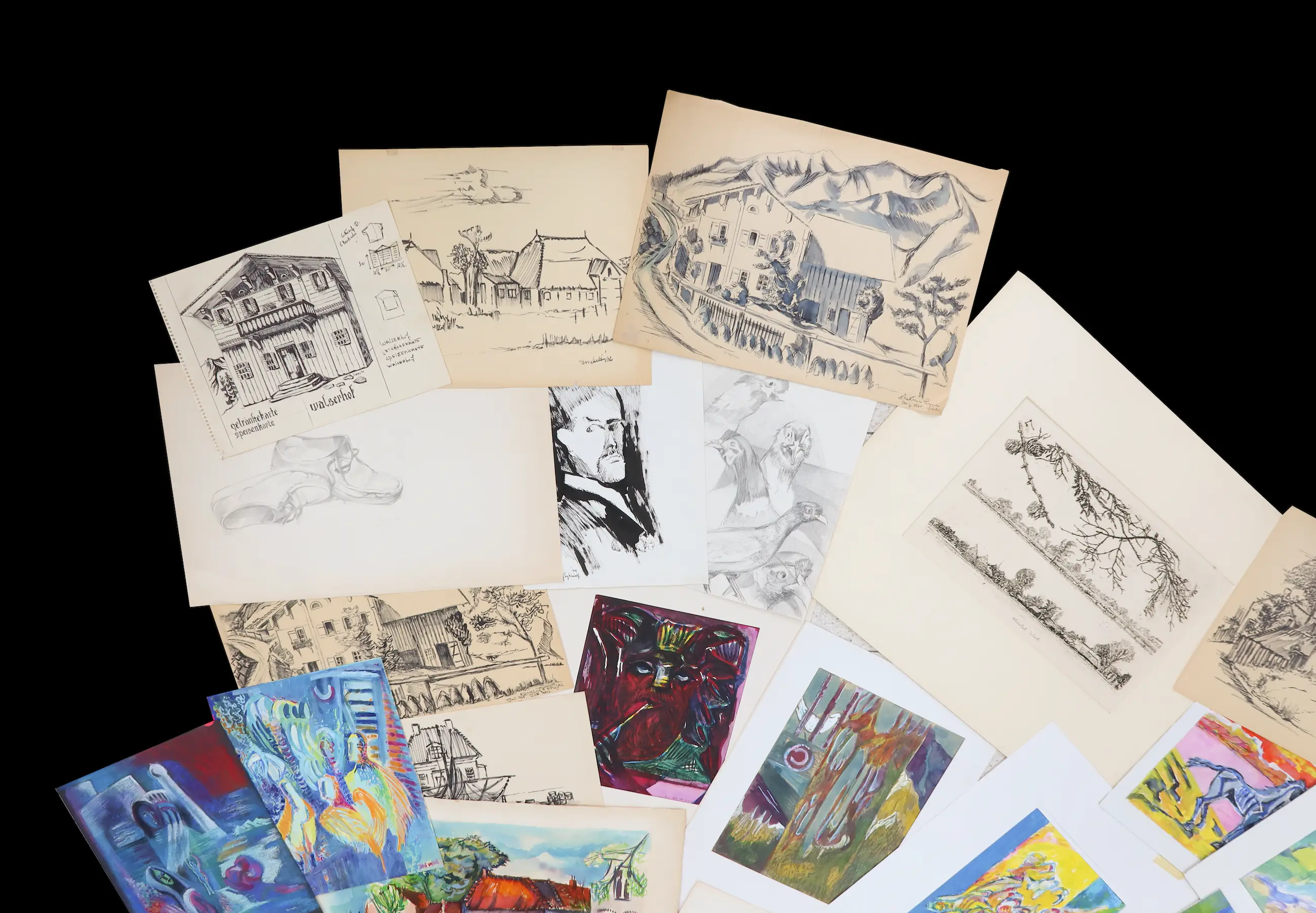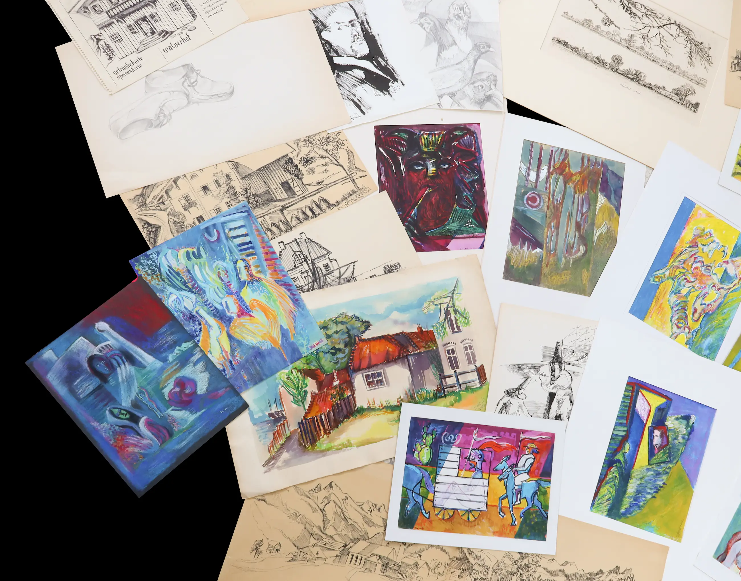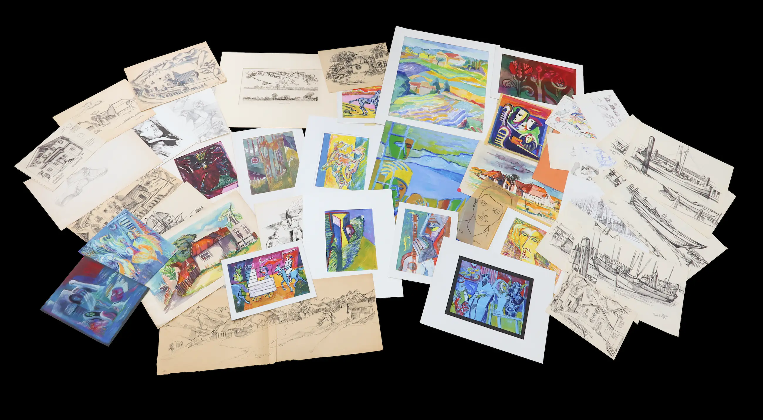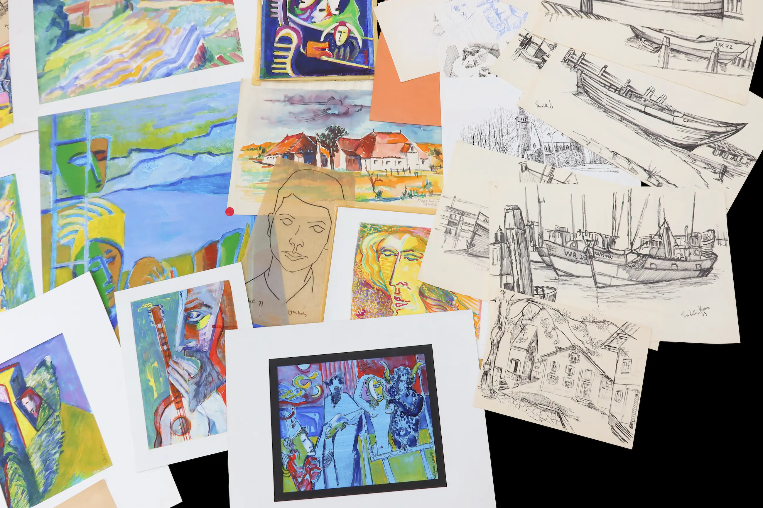 Het betreft een lot van een groot aantal werken op papier vervaardigd in verschillende technieken, zoals gouache, potlood, ets en stift.