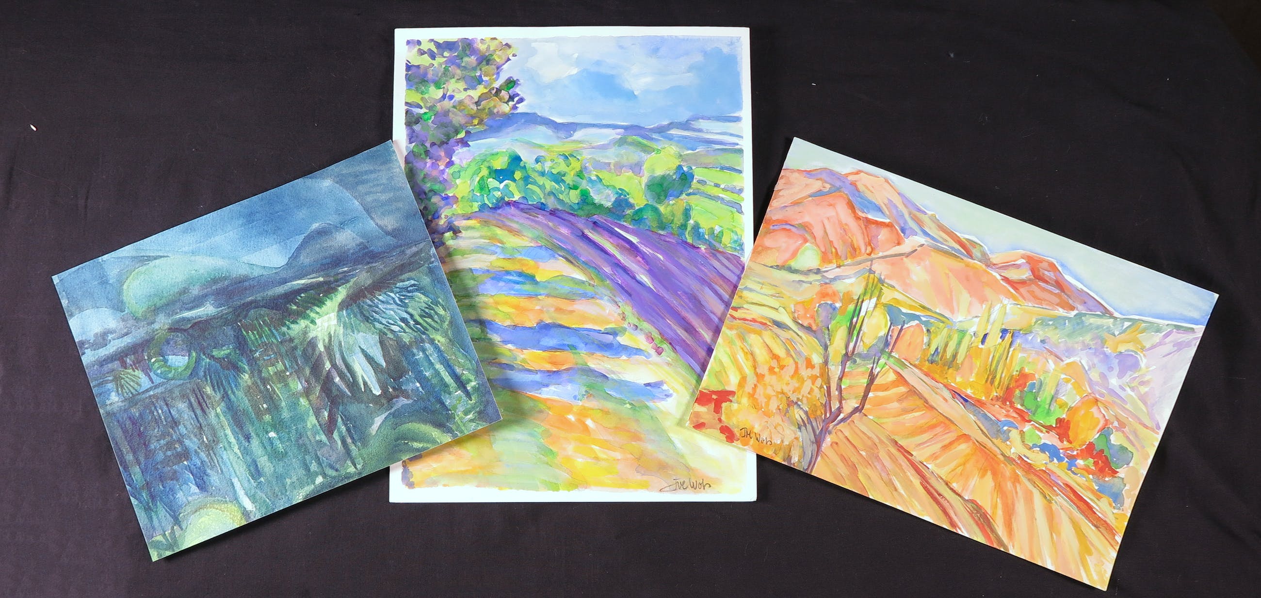 Dit lot bevat drie tekeningen op papier, waarvan twee met gouache zijn gemaakt en één werk met aquarel. De afmetingen in de omschrijving zijn van het grootste werk.