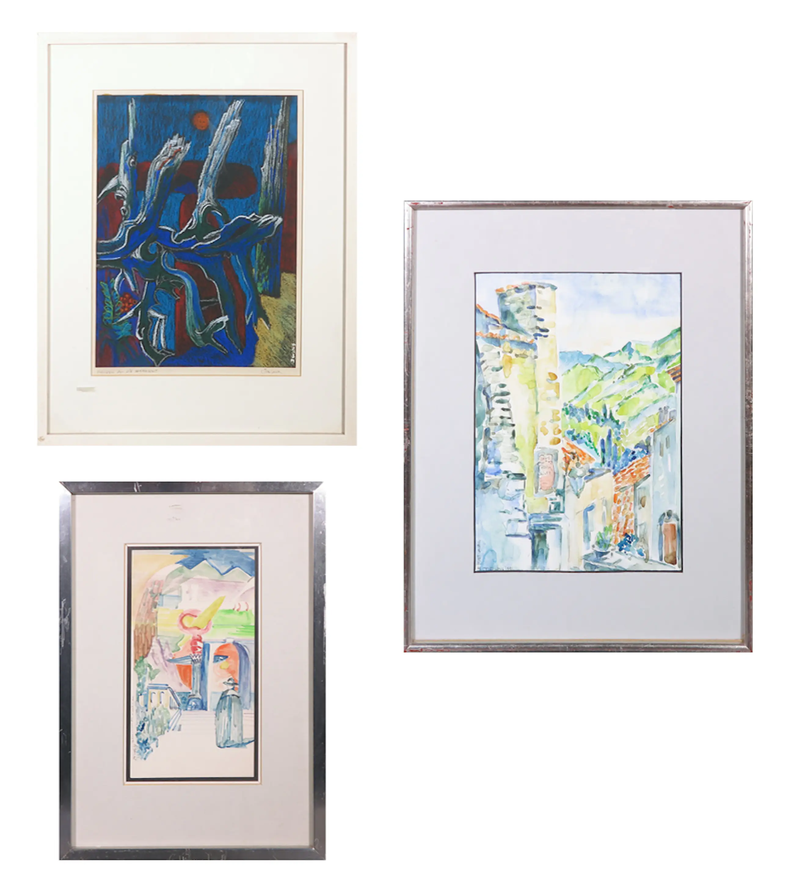Het betreft een lot van drie ingelijste werken, waarvan twee origineel en een grafisch werk. Let op: de gegeven maten zijn van het grootste werk (rechts).