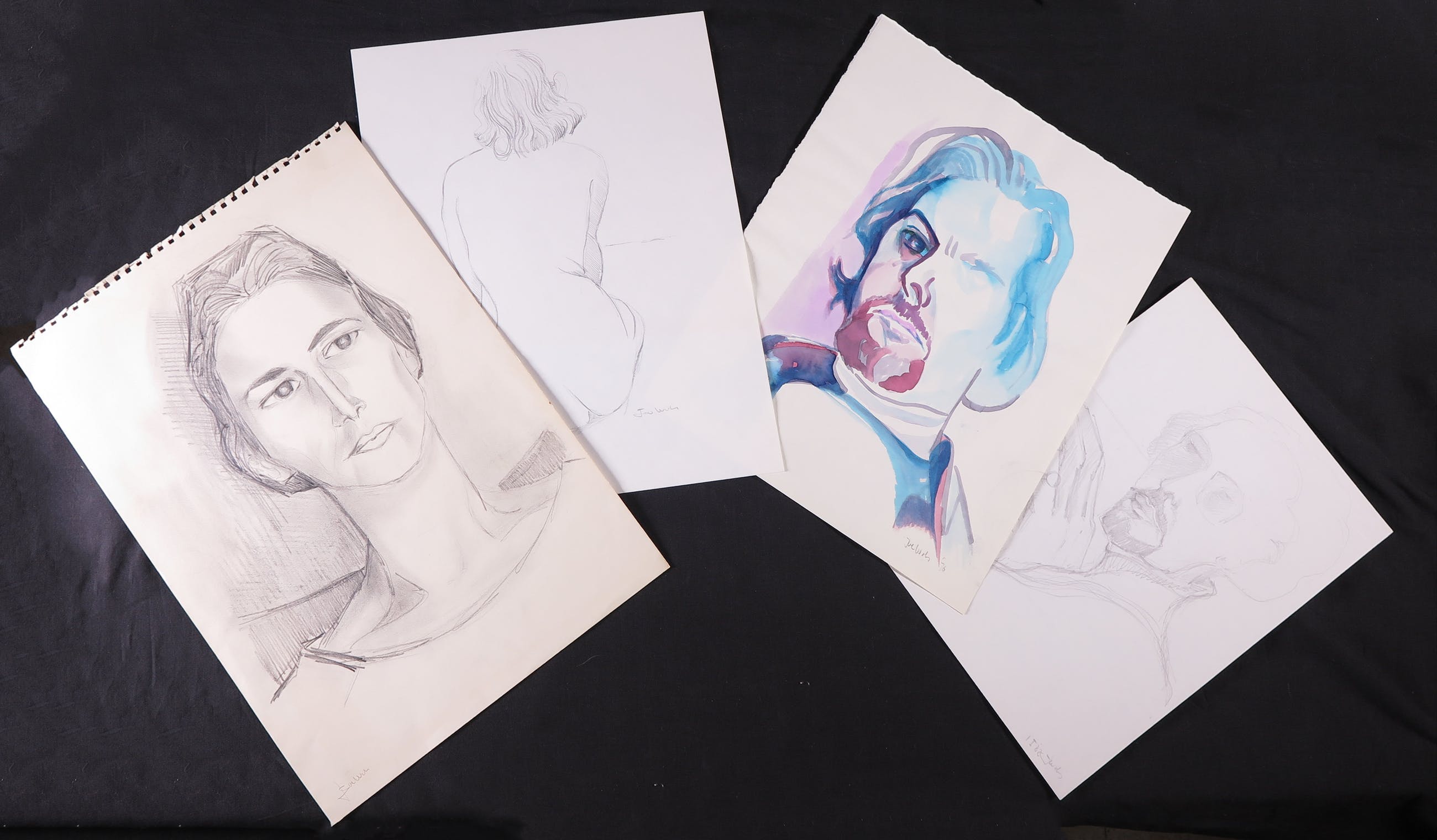 Dit lot bevat vier tekeningen van verschillende figuren, gemaakt door kunstenaar Joe Wols. In dit lot zitten drie potloodtekeningen en een aquarel. De afmetingen in de omschrijving zijn van het grootste werk.