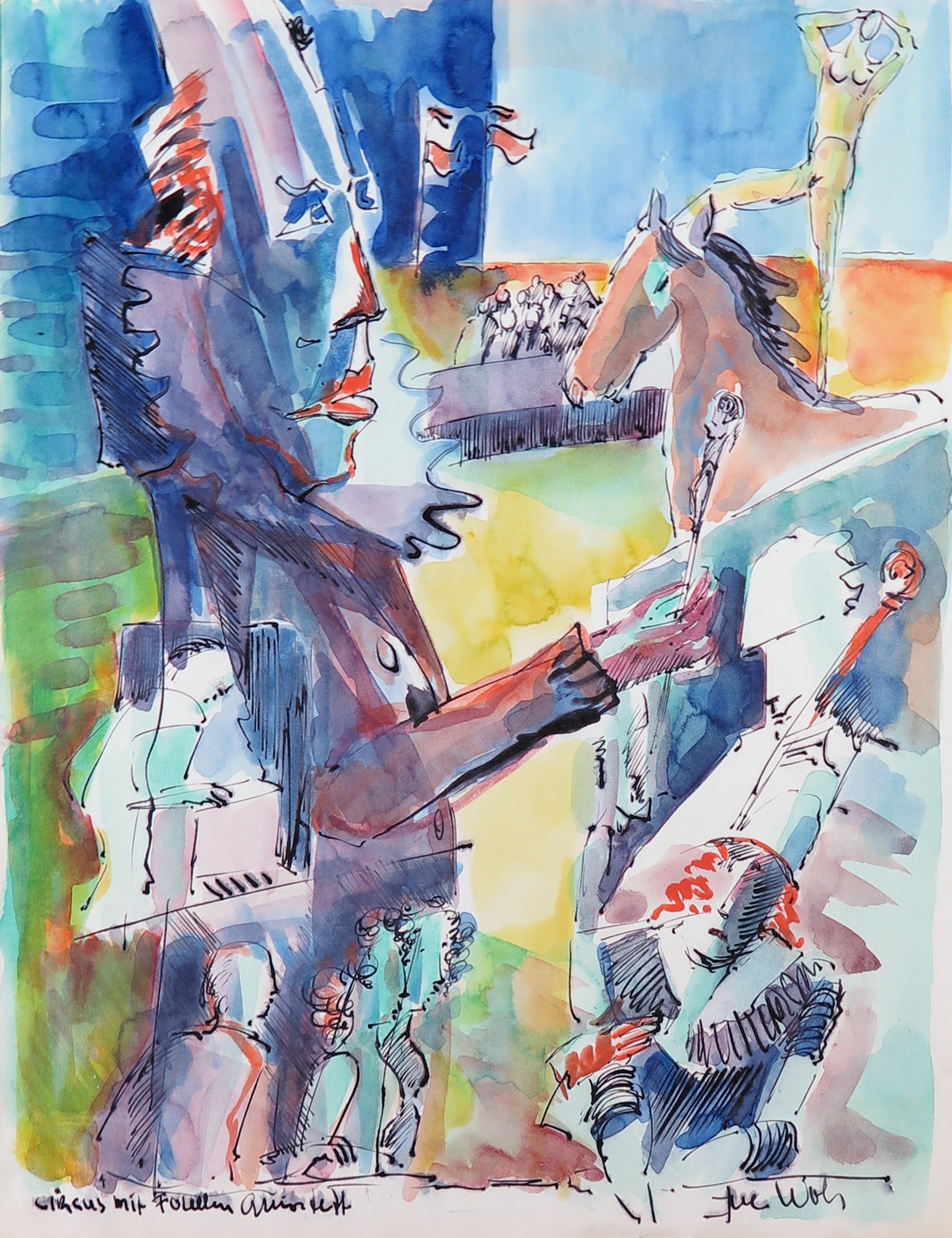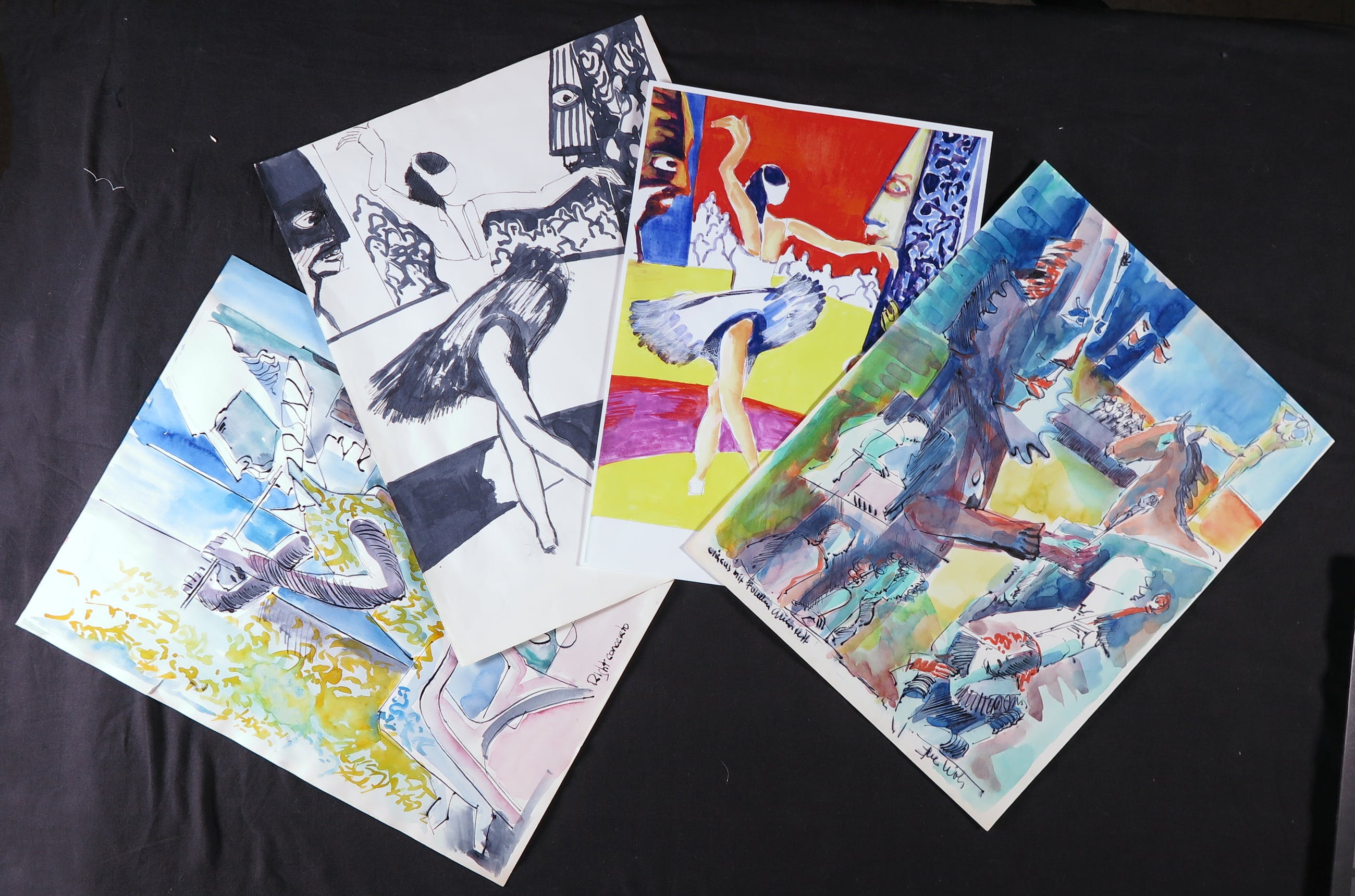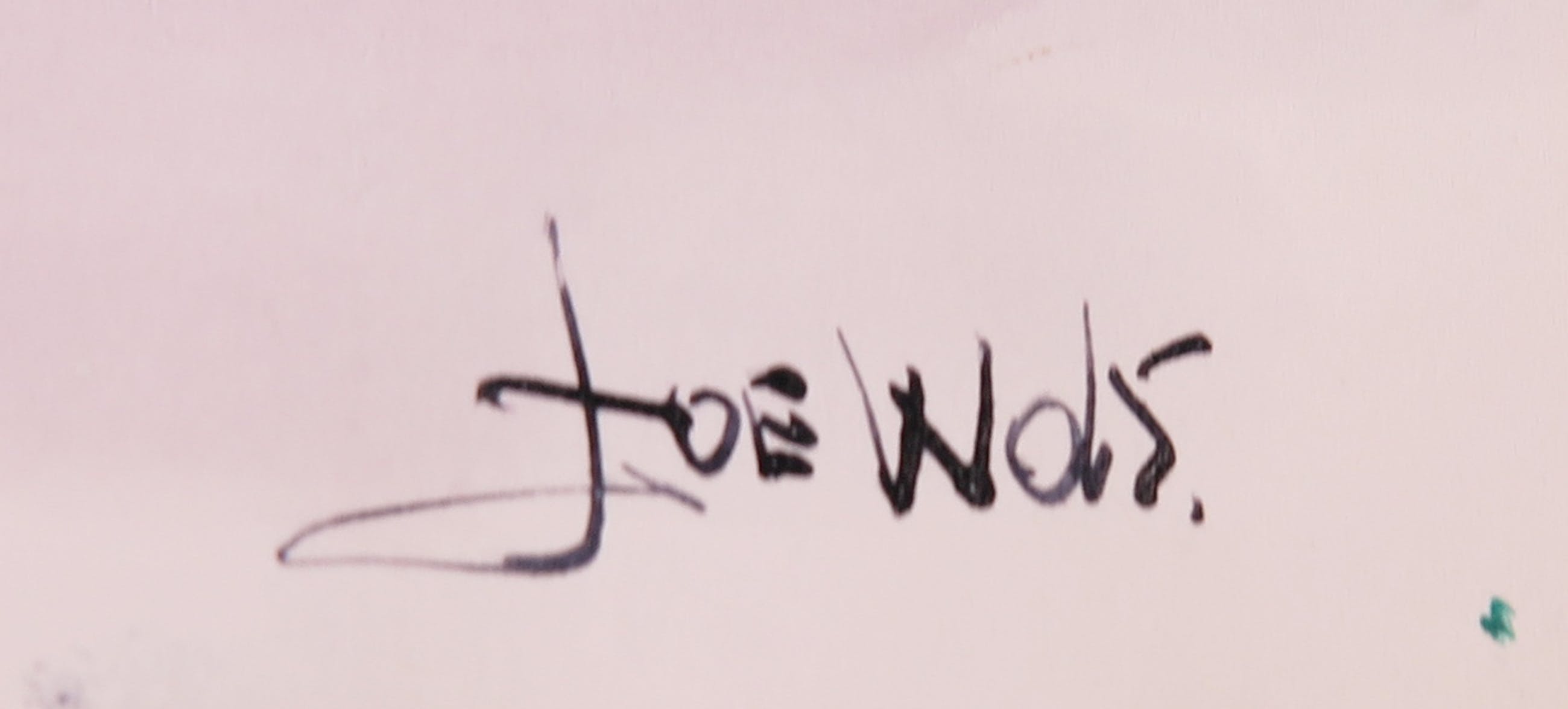 Dit lot bevat vier werken van kunstenaar Joe Wols. Drie hiervan zijn aquarellen en één werk is met penseel getekend. Het werk met de grootste afmeting is gebruikt voor de omschrijving.
