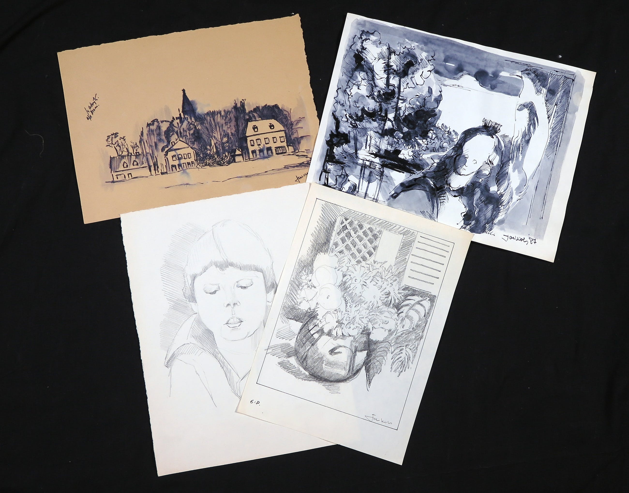 | Eén werk heeft een zeer verkleurd papier, een ander werk met o.a. aquarel heeft hier en daar een golving in het blad. De andere twee werken zijn licht verkleurd, maar zijn in goede staat. | |||||||||||