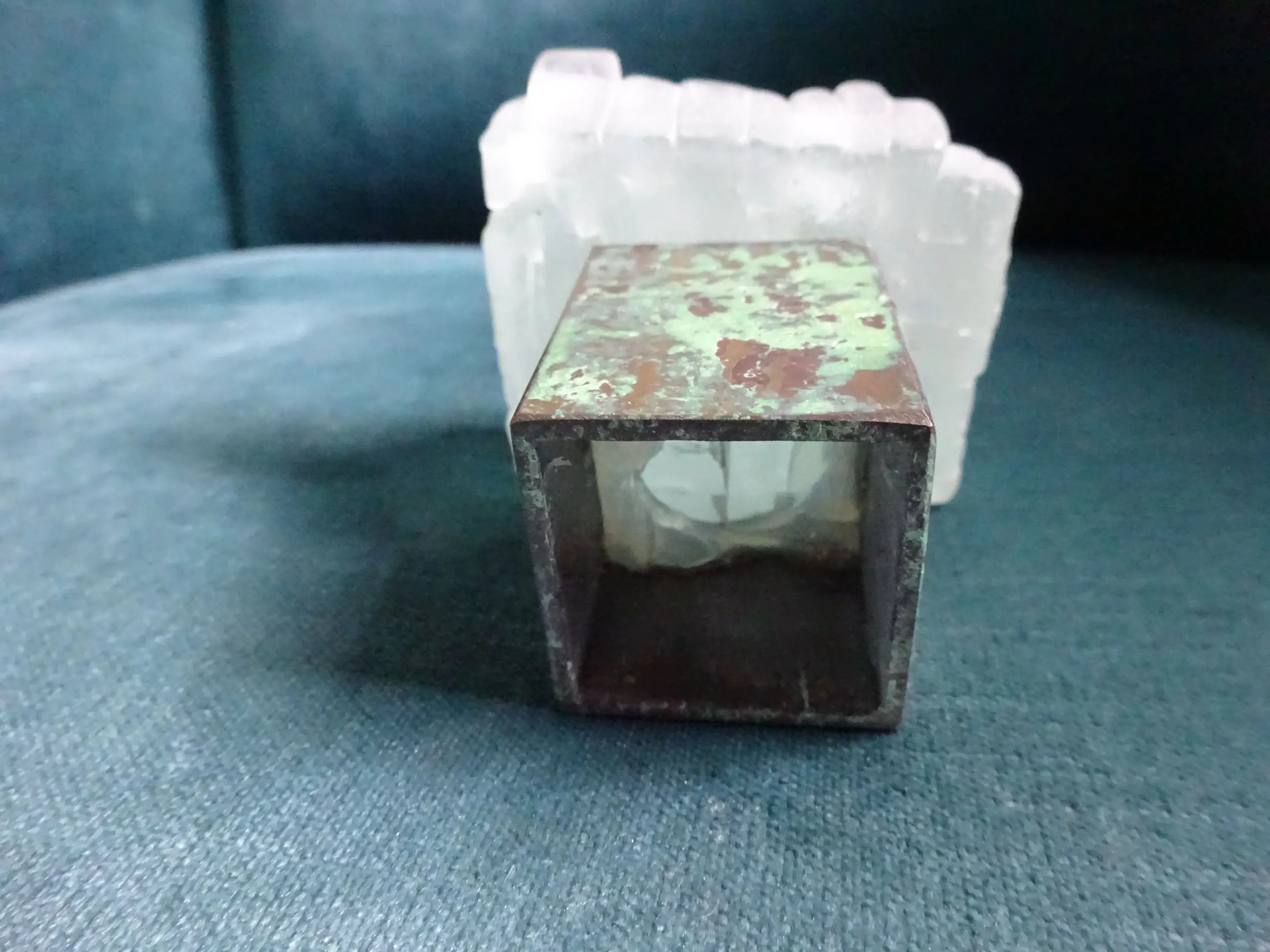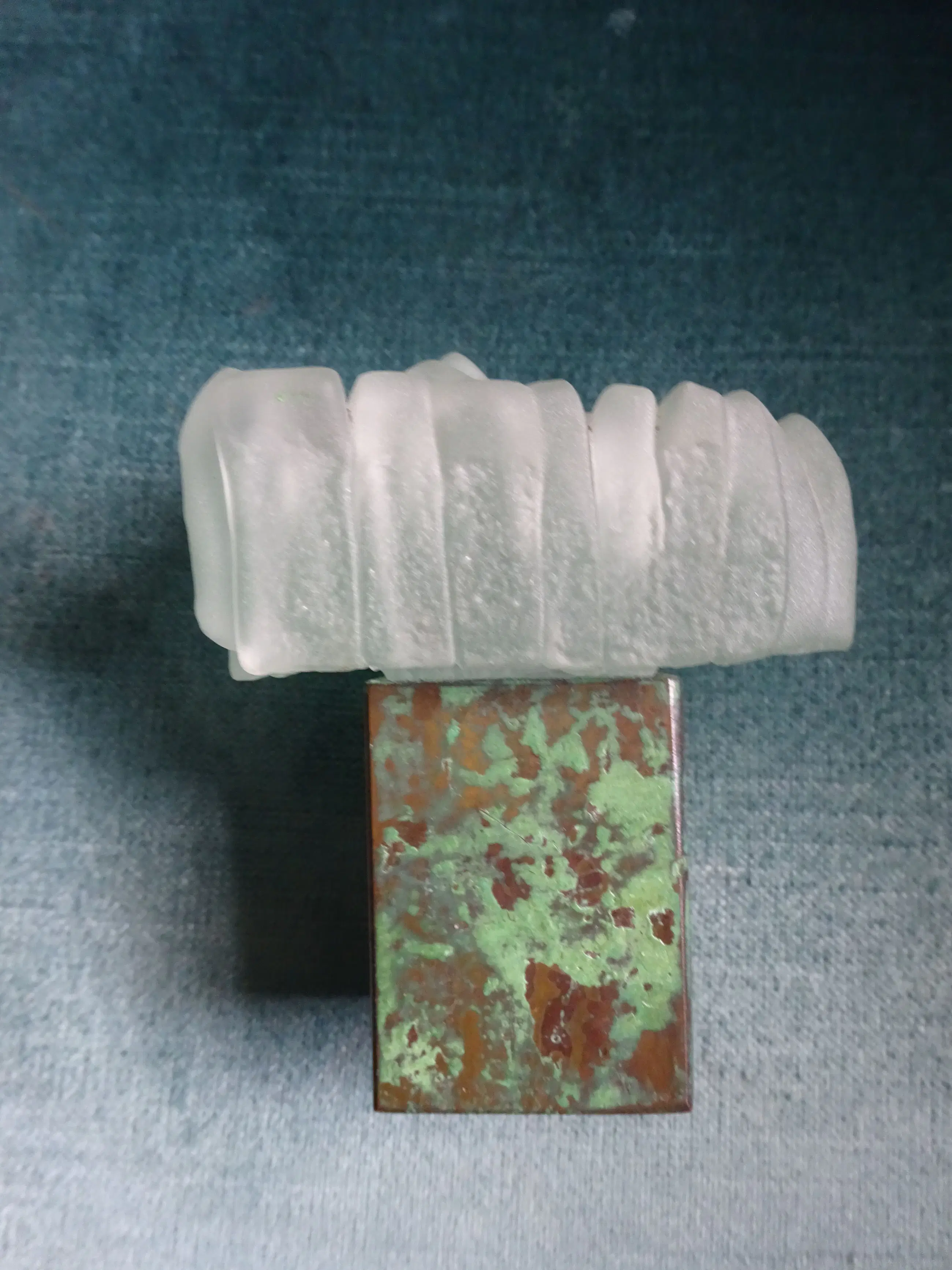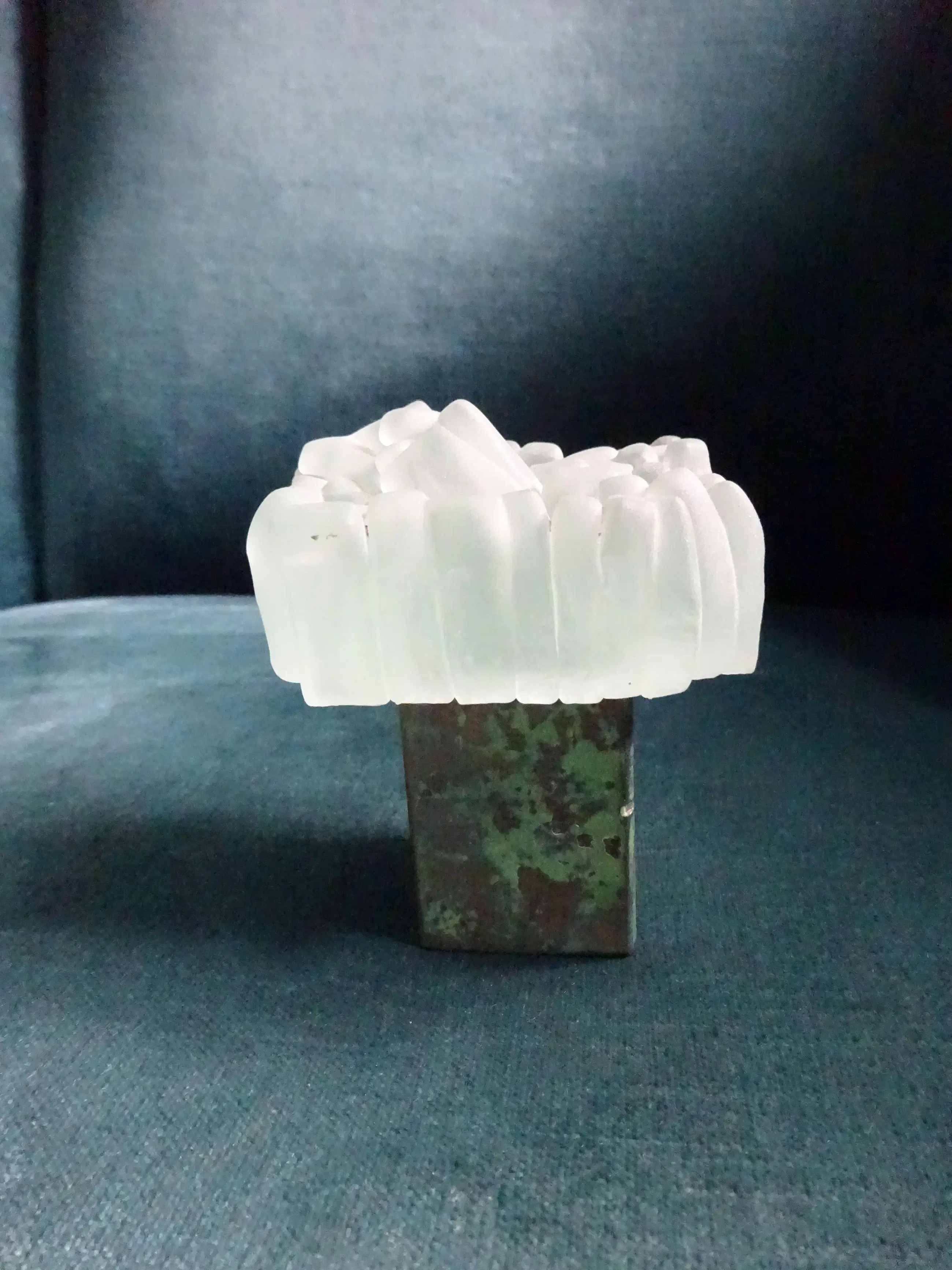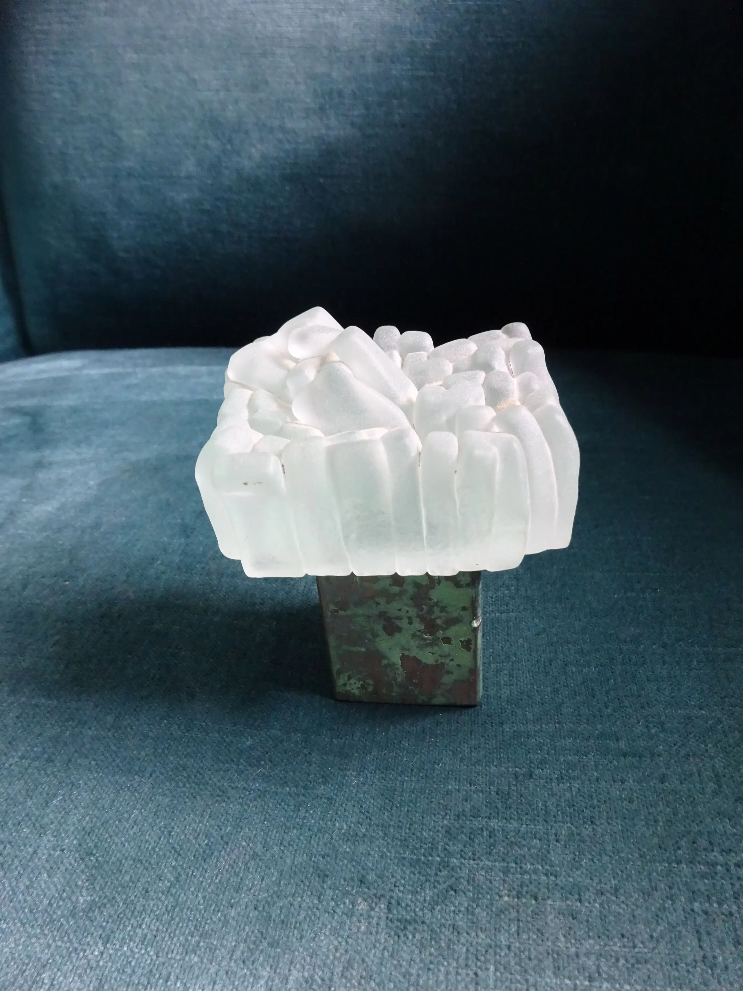 Vaas met bloemen- paperweight? Beeldend kunstenaar: Joek van Draanen 1942 Materiaal: massief gesatineerd glas en gepatineerd brons Afmeting Glas : ca 4 x 6 x 6
