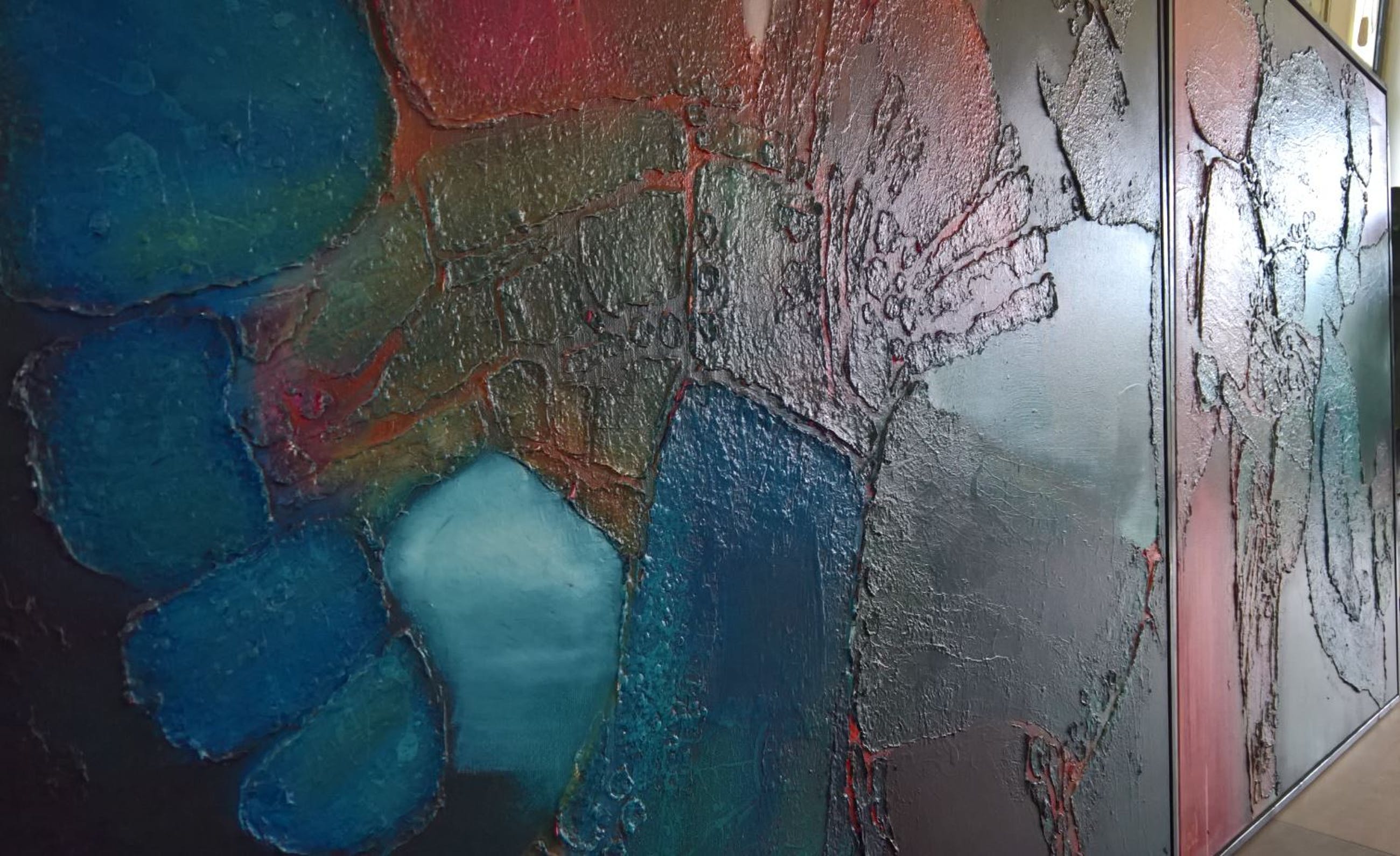 Gemengde techniek op doek waarbij gebruik is gemaakt van medium. Hierbij is veel medium toegepast waardoor een hele dikke structuur op het doek aanwezig is.