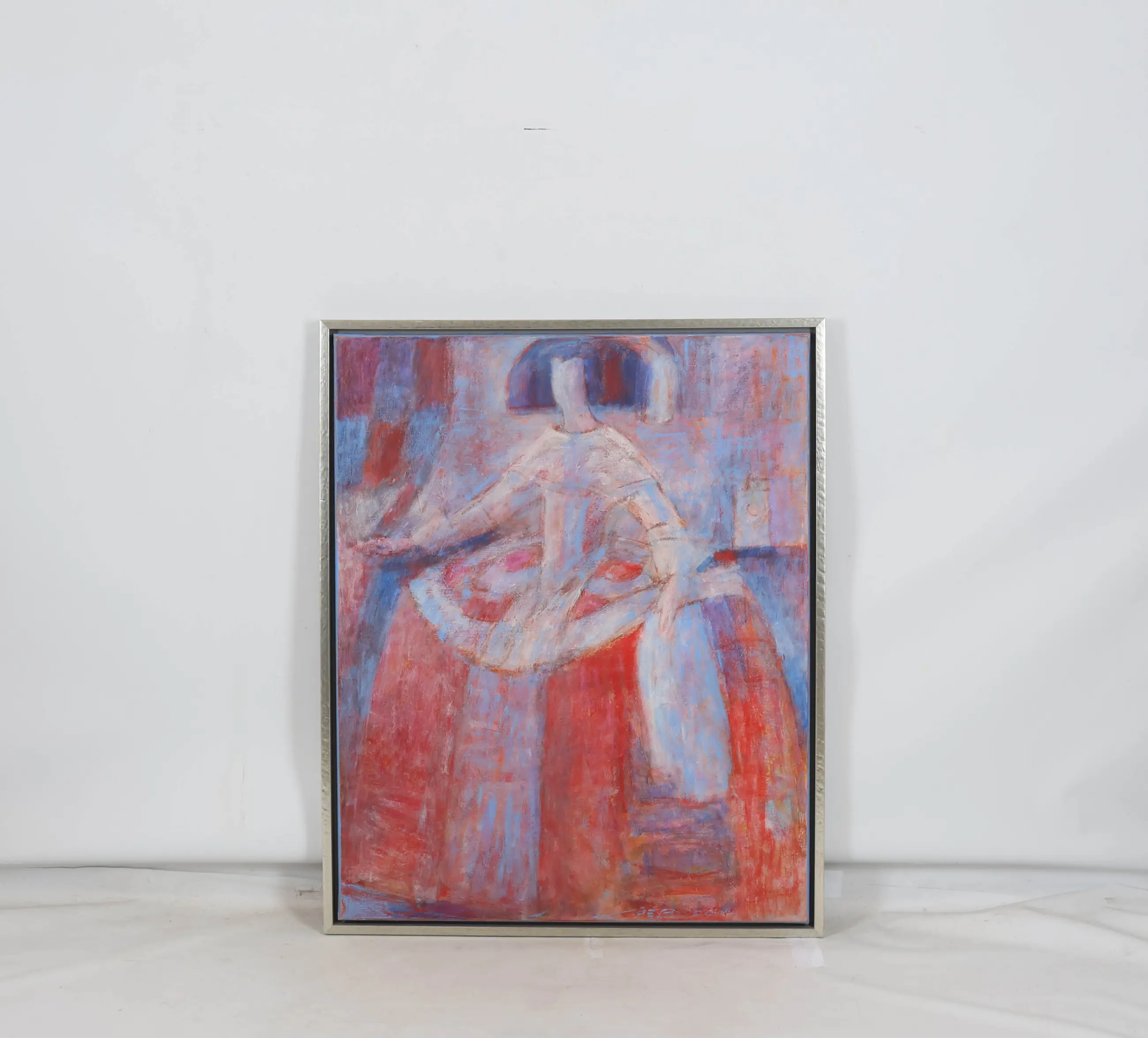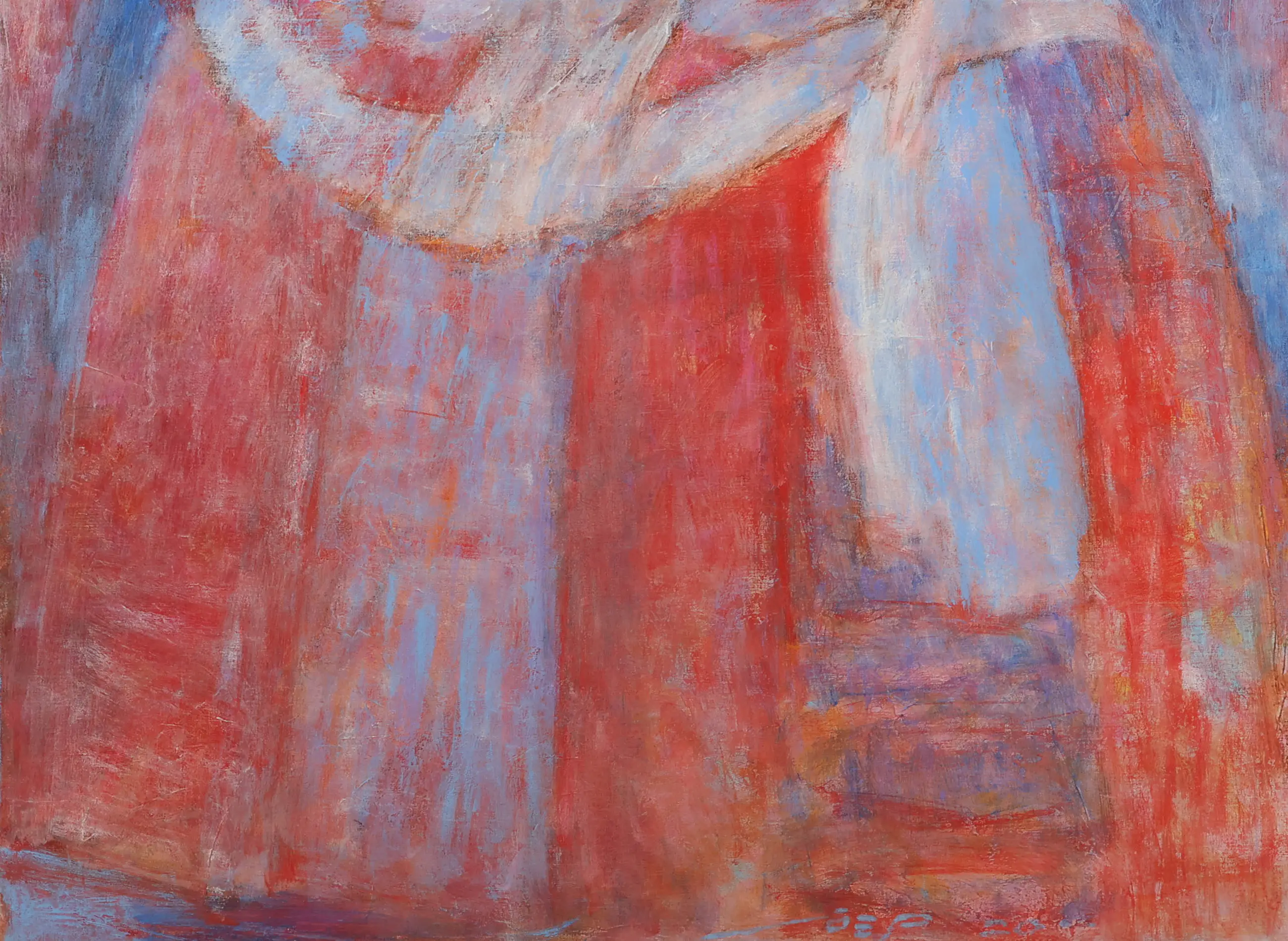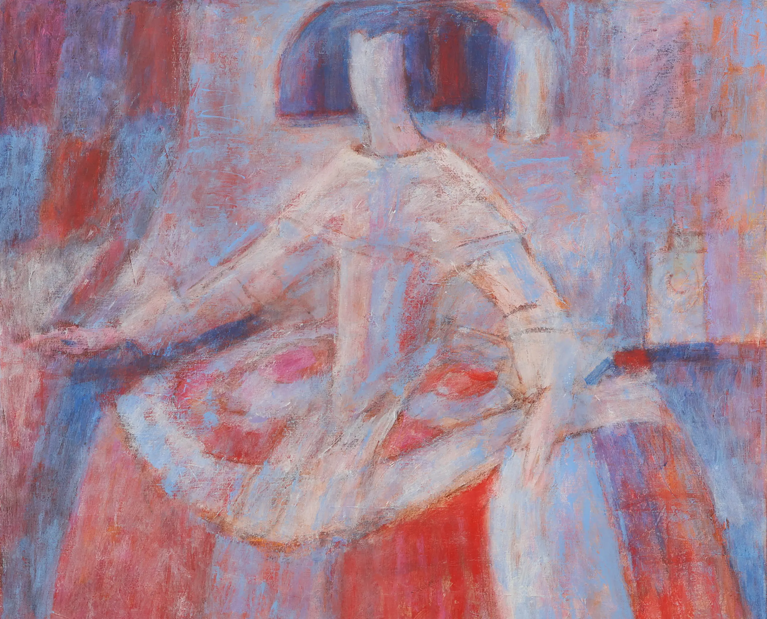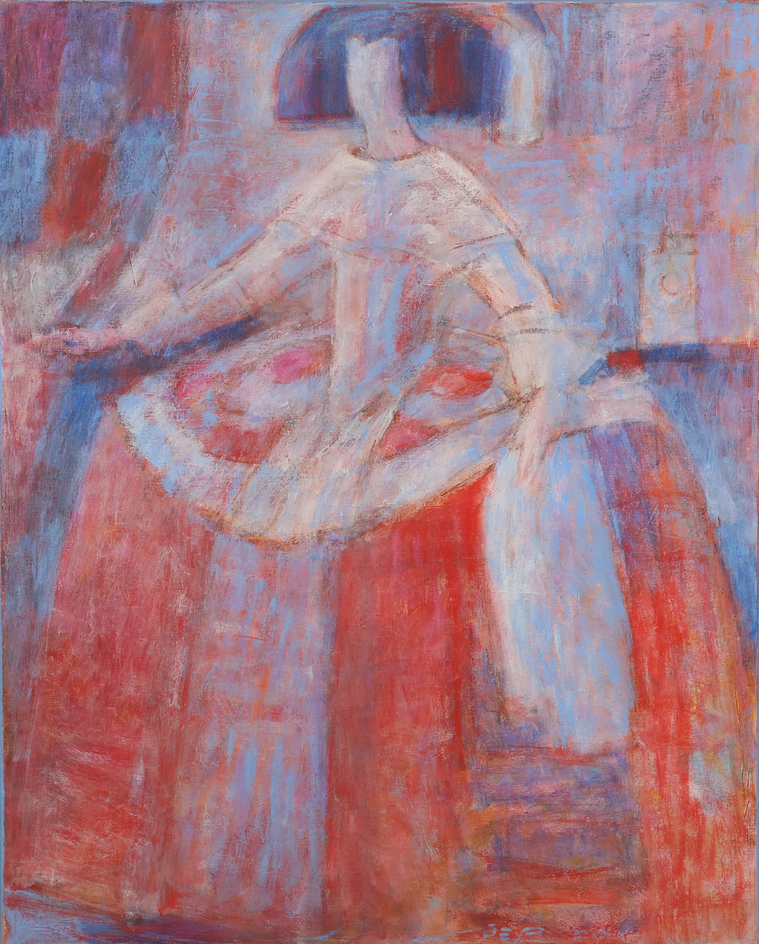 In Koningin Rood staat een vrouwelijke figuur centraal, weergegeven in een krachtige en vereenvoudigde beeldtaal. De dominante rode kleur geeft het werk een sterke symbolische en emotionele lading en benadrukt de aanwezigheid en kracht van de figuur.