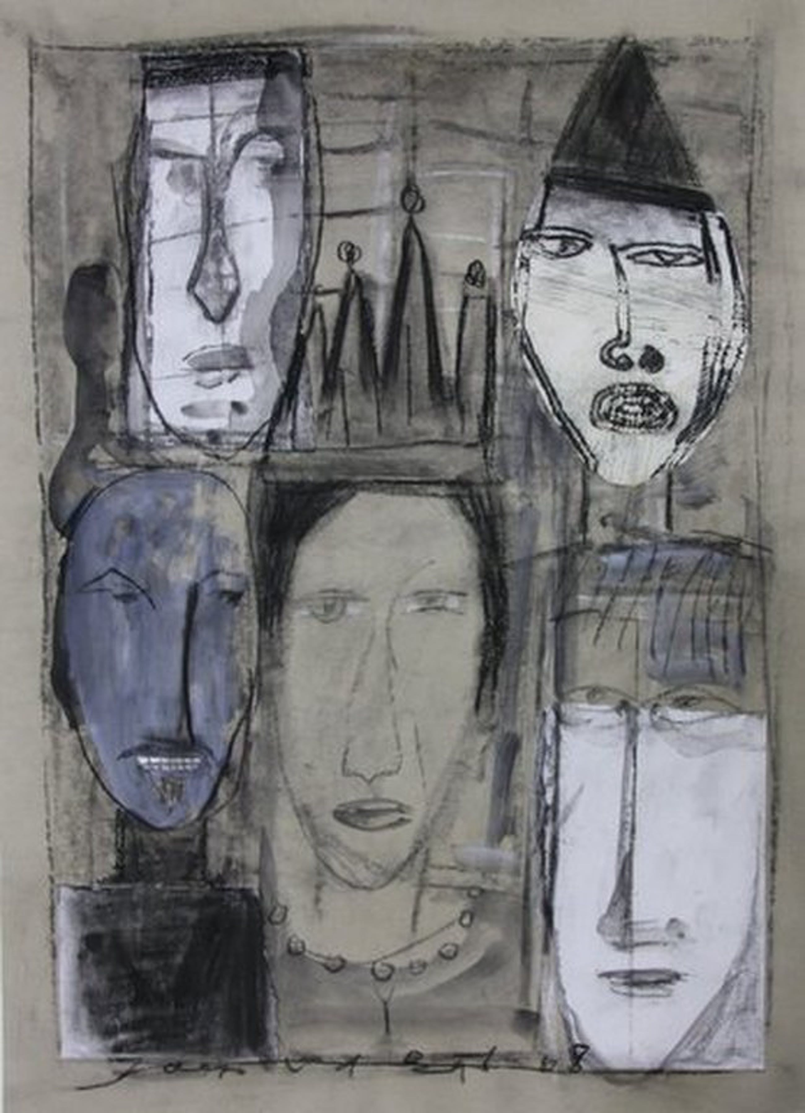 Dit is een combinatie van collage met gemengde techniek. Aquarelverf, gewassen inkt, houtskool, gekleurd papier.