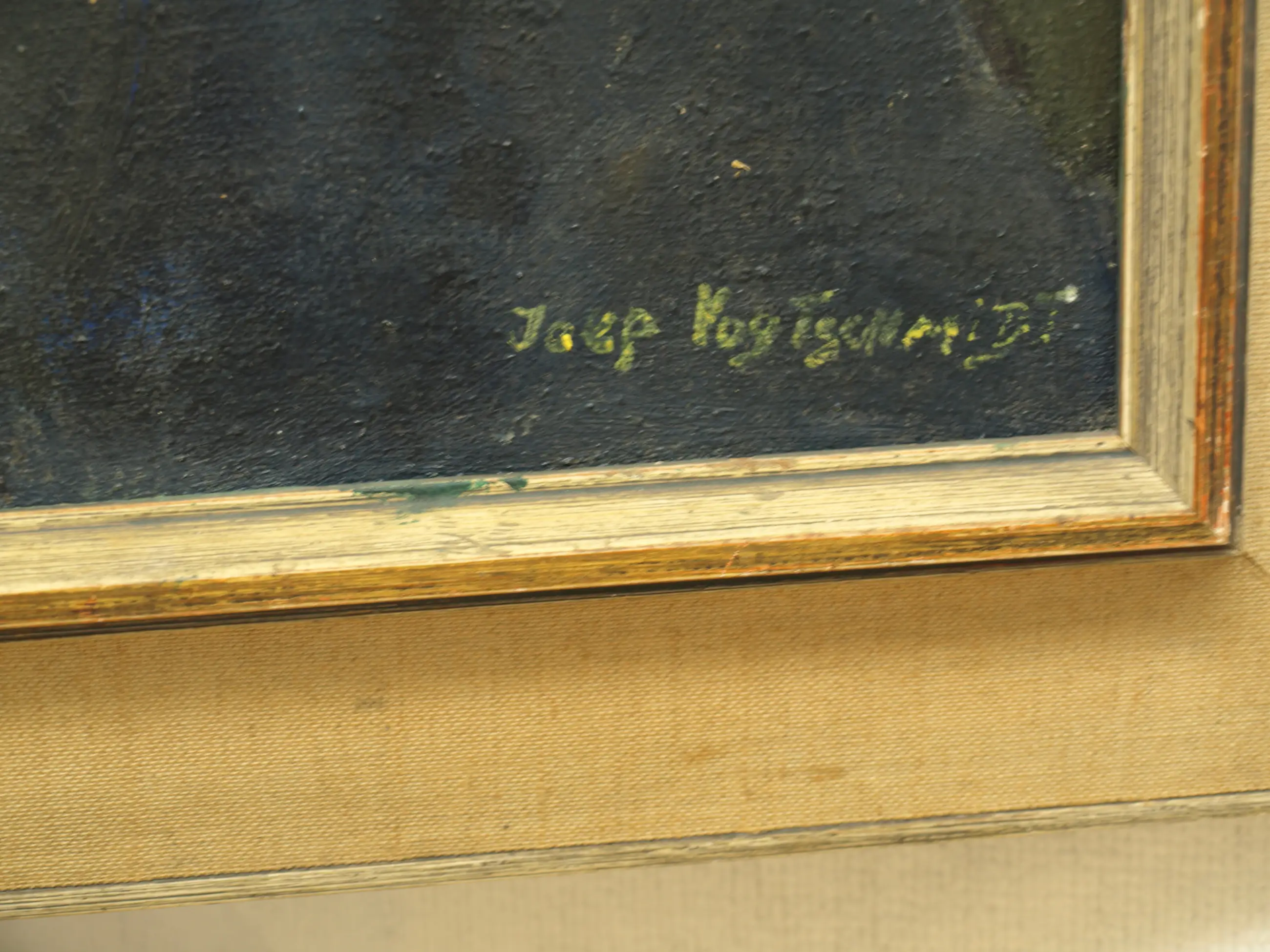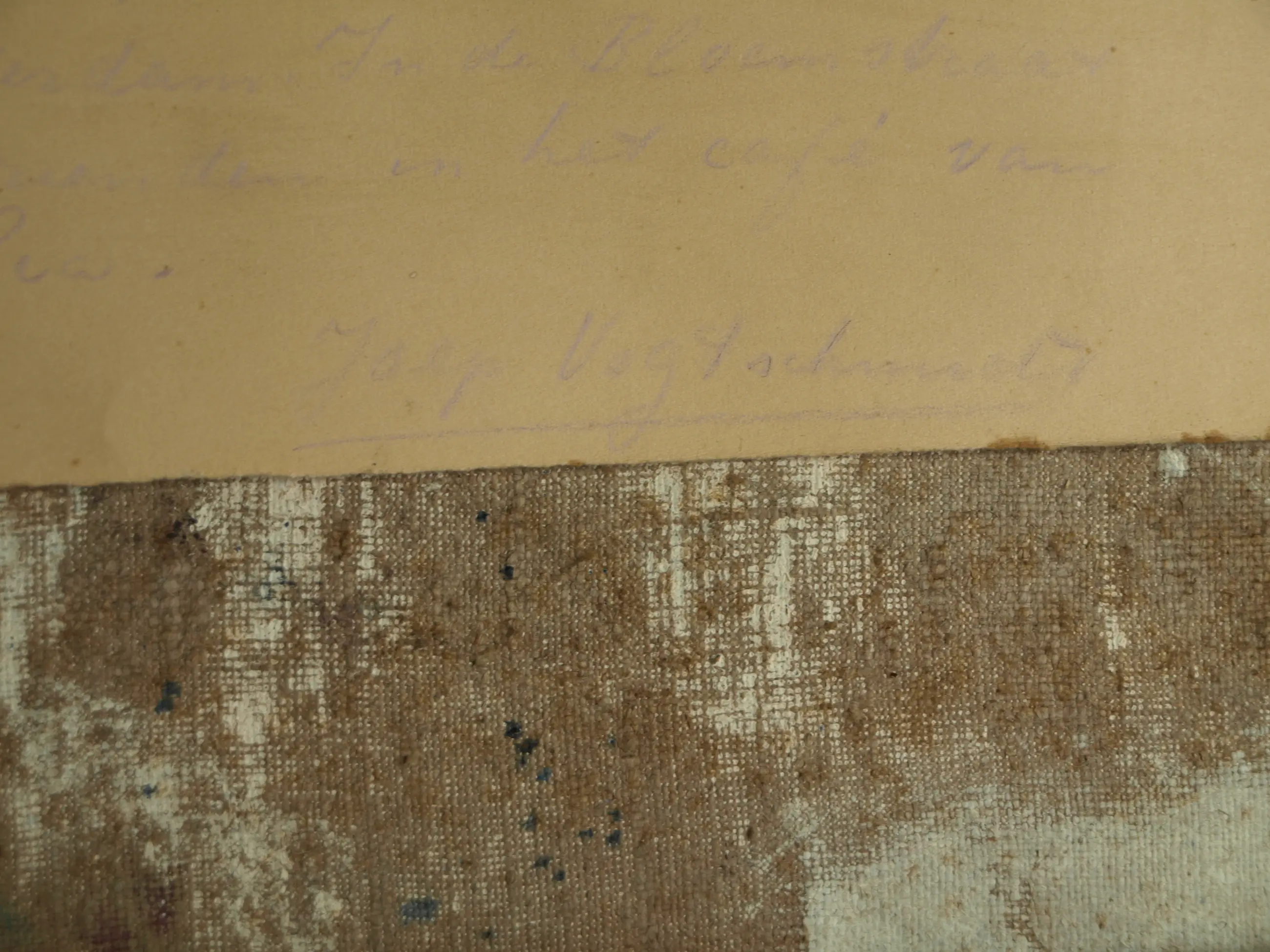 Een zelfportret van de Nederlandse kunstenaar en cellist Joep Vogtschmidt (1905-1971). -Techniek: Olieverf op doek, opgespannen op een houten spieraam. Ingelijst in de originele houten lijst. -Gesigneerd rechtsonder. Op de achterkant van het doek zit een papier bevestigd waarop de kunstenaar heeft geschreven: “Amsterdam, juli 1963, Als ik toch moet hangen, gelijk Barbetje, dan niet in een museum of in de kamer van een snob. Dan liever in het hart van Amsterdam. In de Bloemstraat. Bij m’n vrienden in het café van Chris en Ria”. (waarschijnlijk heeft Joep Vogtschmidt dit schilderij cadeau gegeven aan het café ‘Chris’, Bloemstraat 42 in Amsterdam.) -Afmetingen: Lijst, 73 x 63 x 1½ cm. Spieraam, 60 x 50 cm. Beeld, 58½ x 48½ cm. -Herkomst: Uit een inboedel. -Conditie: Het werk heeft slijtplekken, ouderdomssporen (vuil) en 2 beschadigingen (slijtplek met scheur en verfverlies) links van het hoofd. Zie ook de foto’s voor een eigen indruk.
