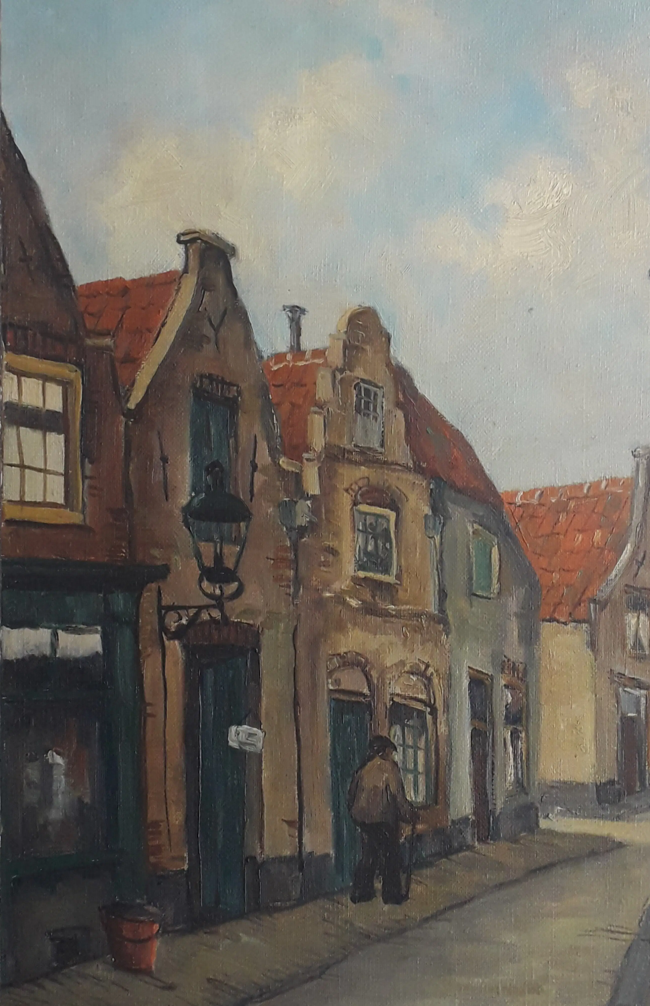 Een GEZELLIG STRAATJE met mooie OUDE HUISJES ! In welk dorp of stad zou dit zijn ? Een man met wandelstok loopt te genieten van de zonnige dag.