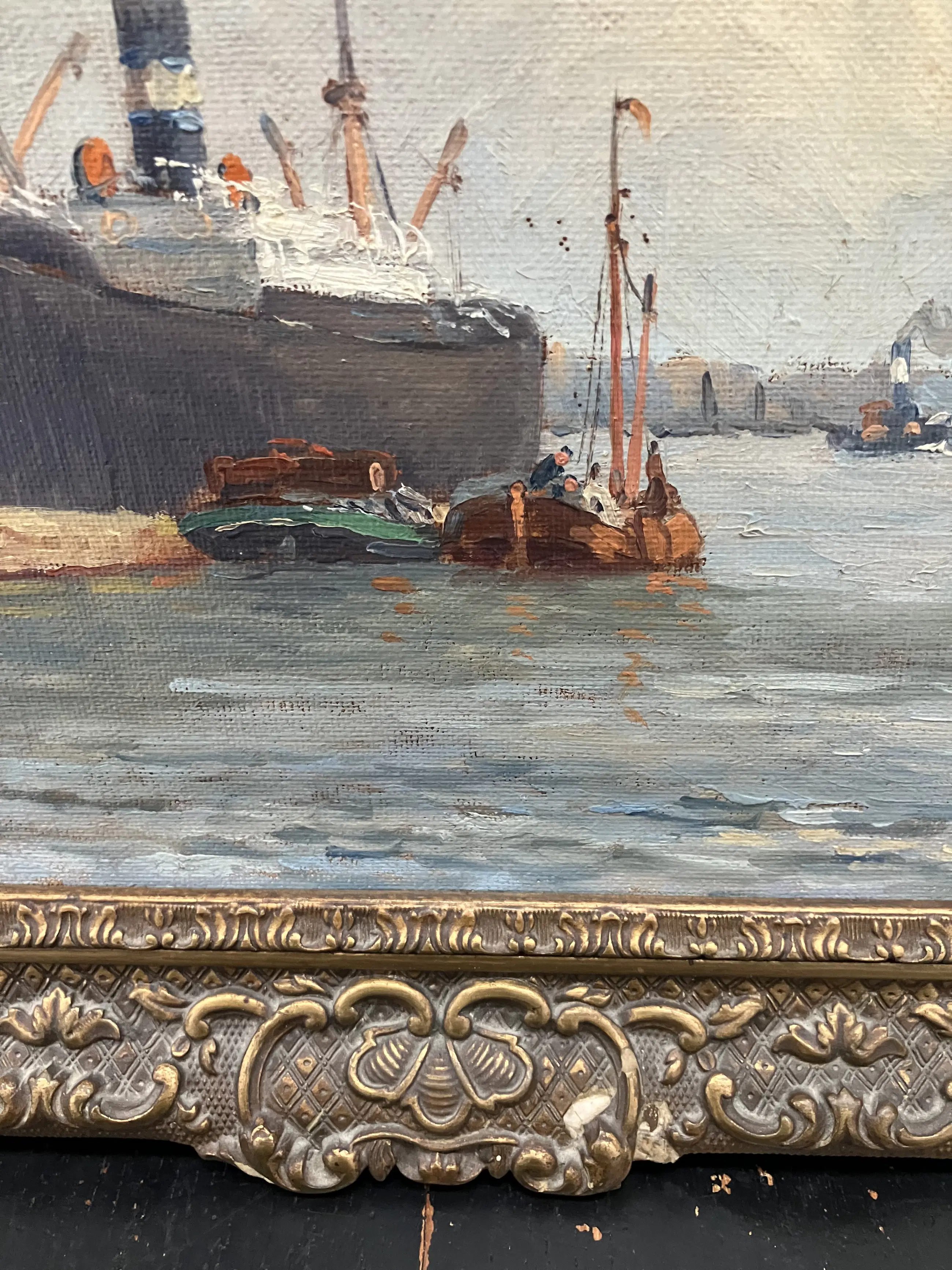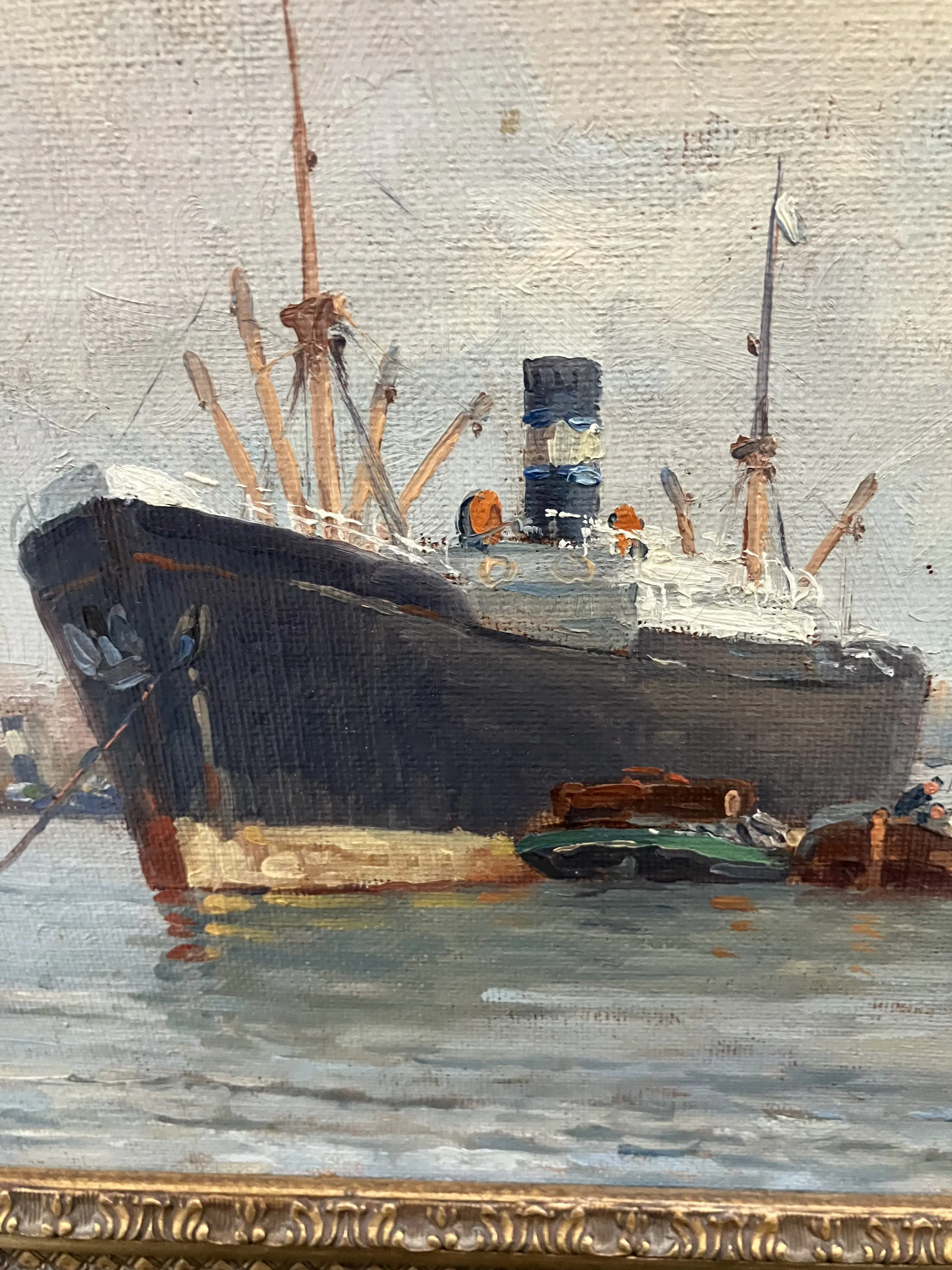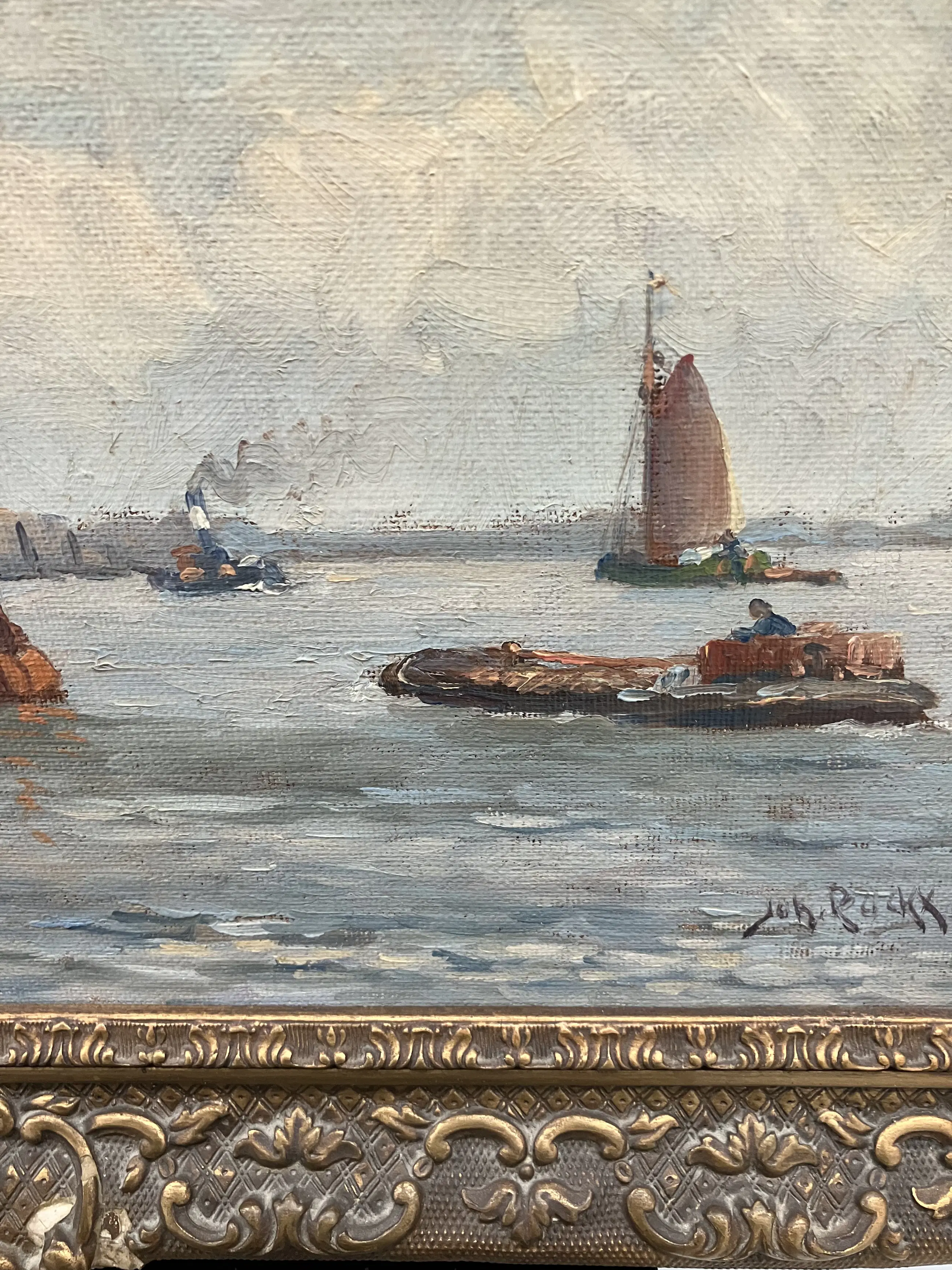 Een sferisch beeld van de Rotterdamse haven van de bekende schilder Joh. Rockx. Een kenmerkend voorbeeld uit zijn brede oeuvre, dat verder landschappen en stillevens omvat.