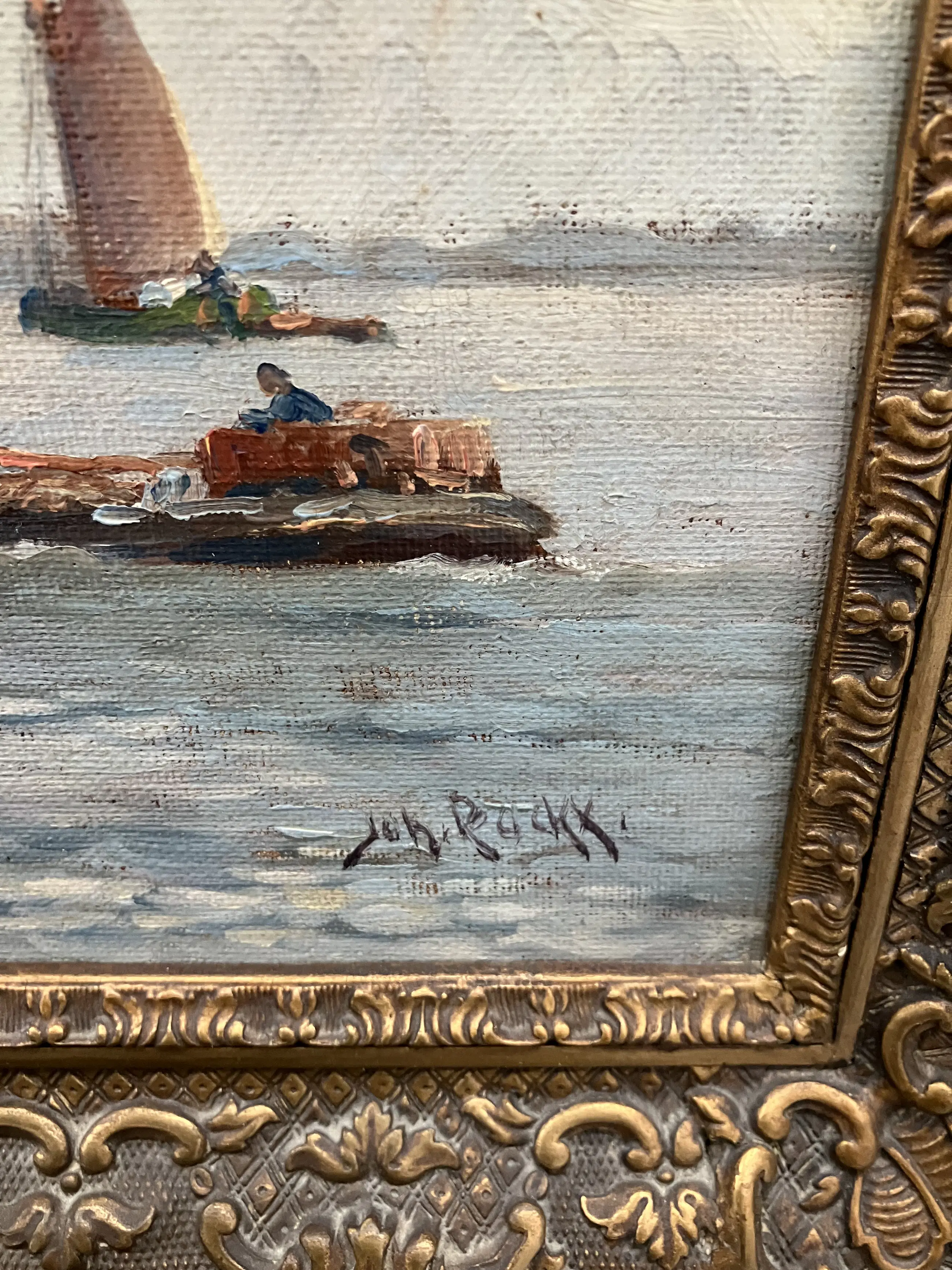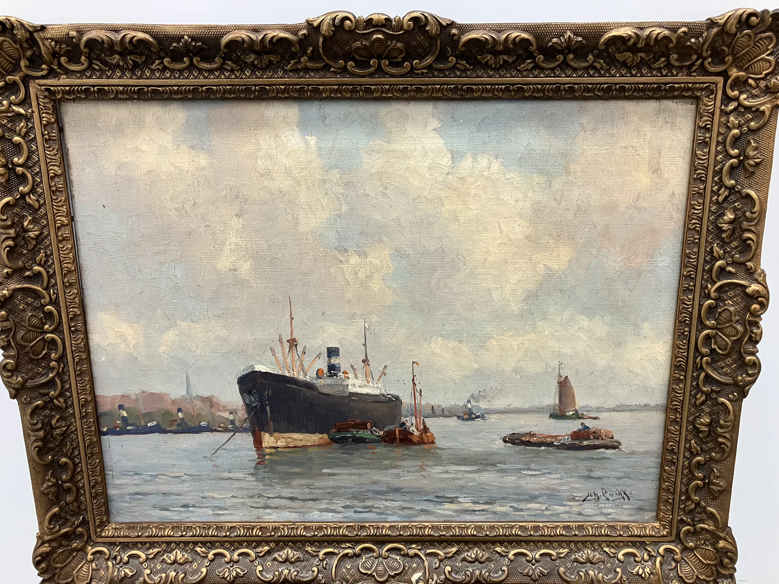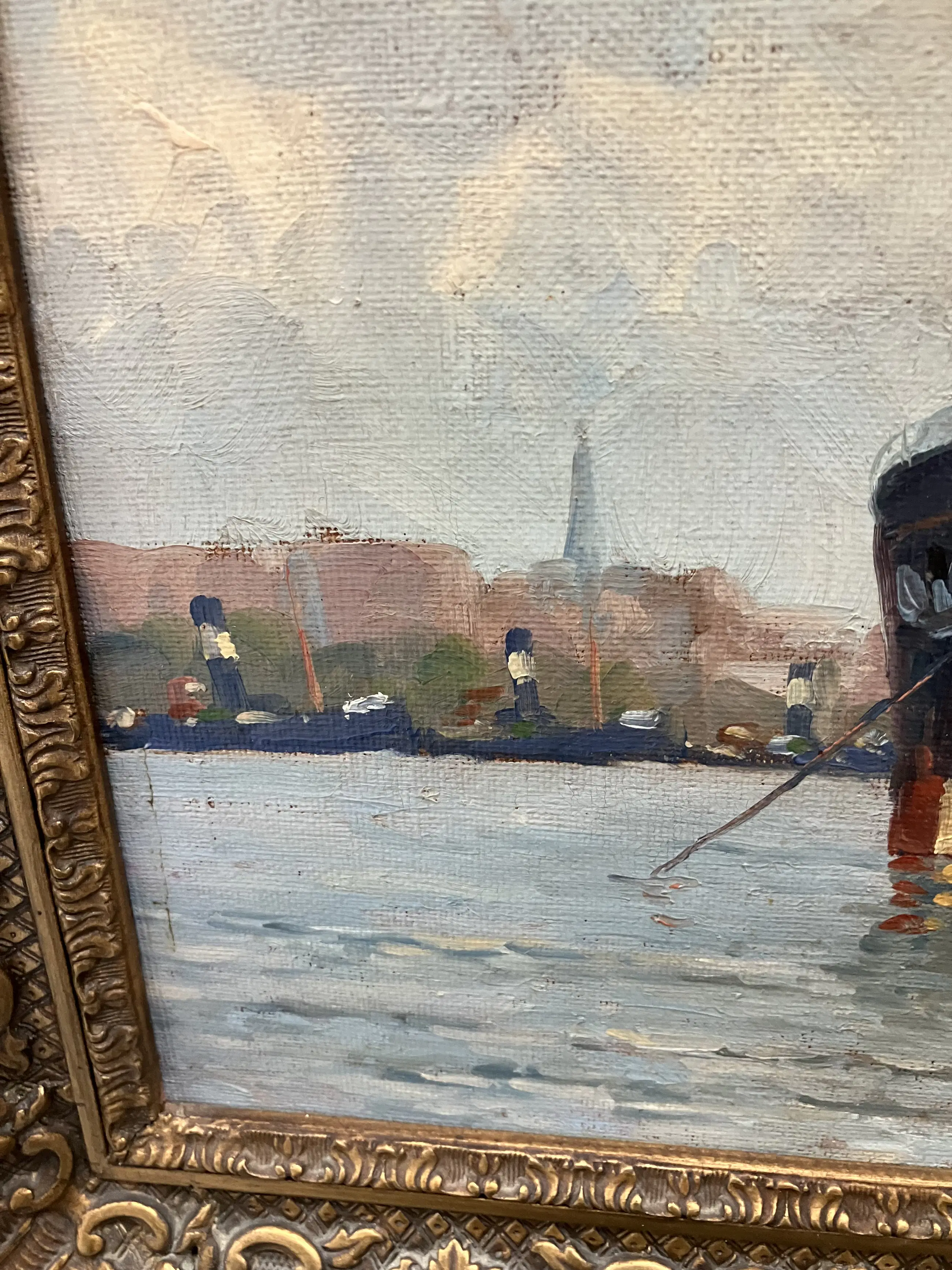 Een sferisch beeld van de Rotterdamse haven van de bekende schilder Joh. Rockx. Een kenmerkend voorbeeld uit zijn brede oeuvre, dat verder landschappen en stillevens omvat.