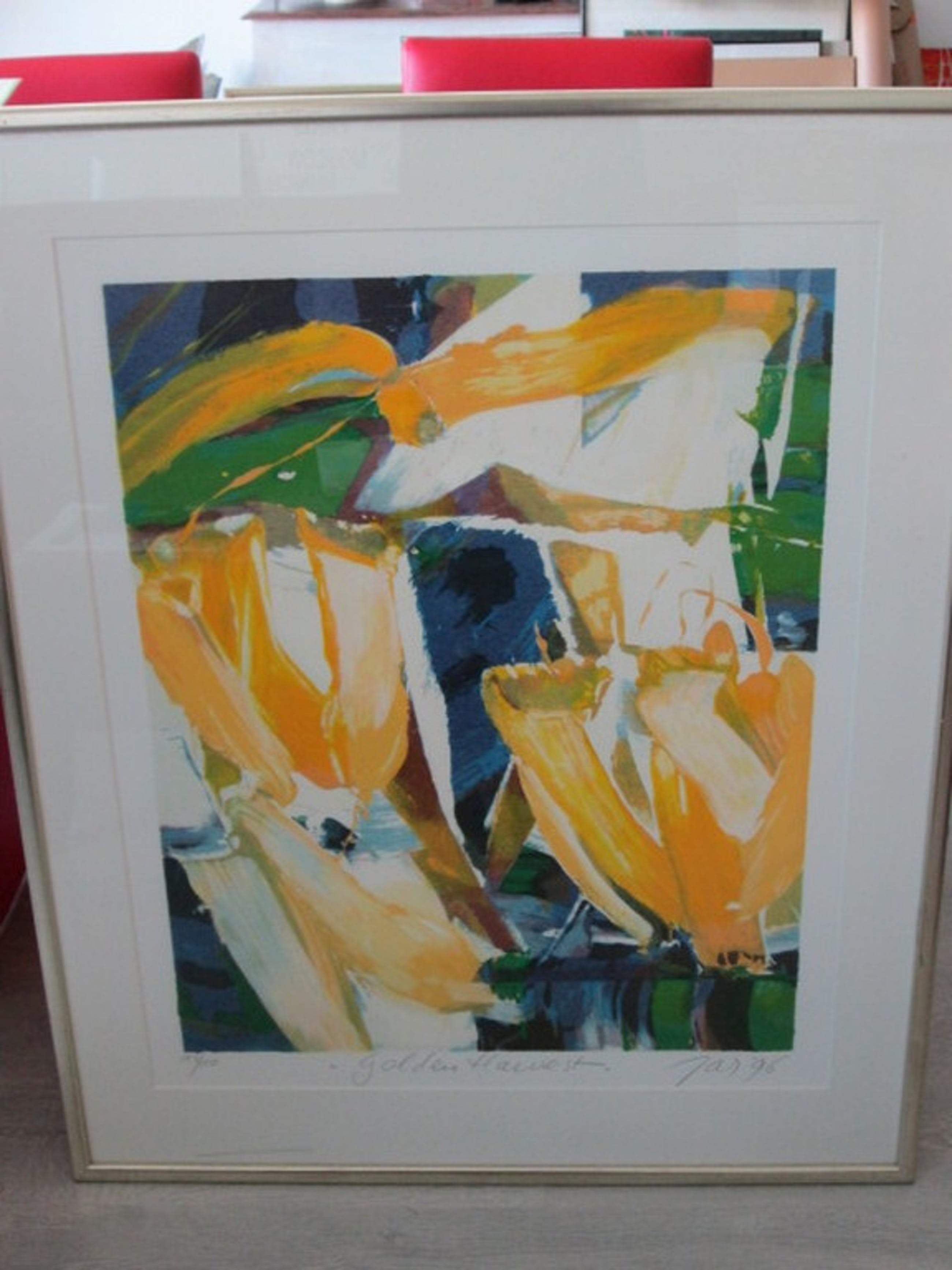 MOOIE ZEEFDRUK IN BIJPASSENDE GOUDKLEURIGE LIJST. TITEL VAN HET WERK: GOLDEN HARVEST. GEZIEN HET GEWICHT EN FORMAAT VAN 110 X 90 CM, GAARNE HET WERK OPHALEN, OF BEZORGEN IN OVERLEG. UITERAARD GESIGNEERD DOOR DE KUNSTENAAR ZELF.