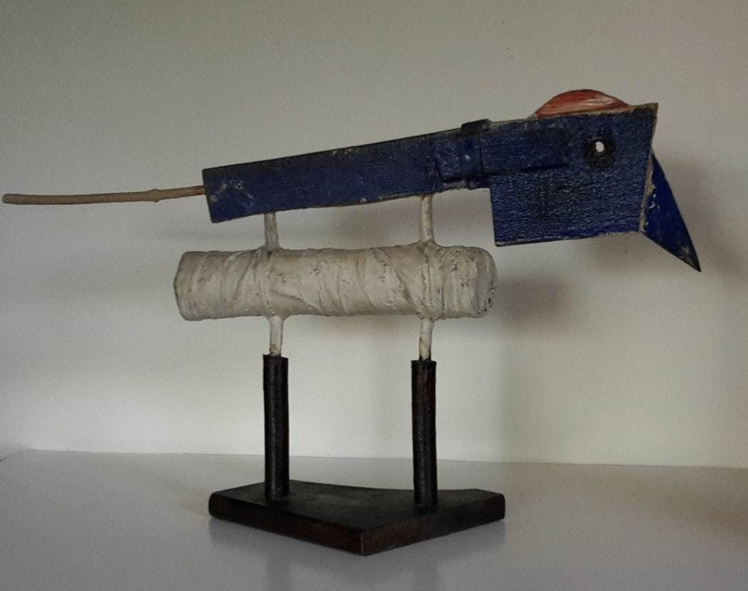 sculptuur samengesteld met verschillende materialen (hout, ijzer, kunststof, linnen), grotendeels beschilderd. Formaat ca. 29 x 49 x 15 cm. Op voetstuk. Aan de onderzijde gesigneerd met jaartal (1986) en titel