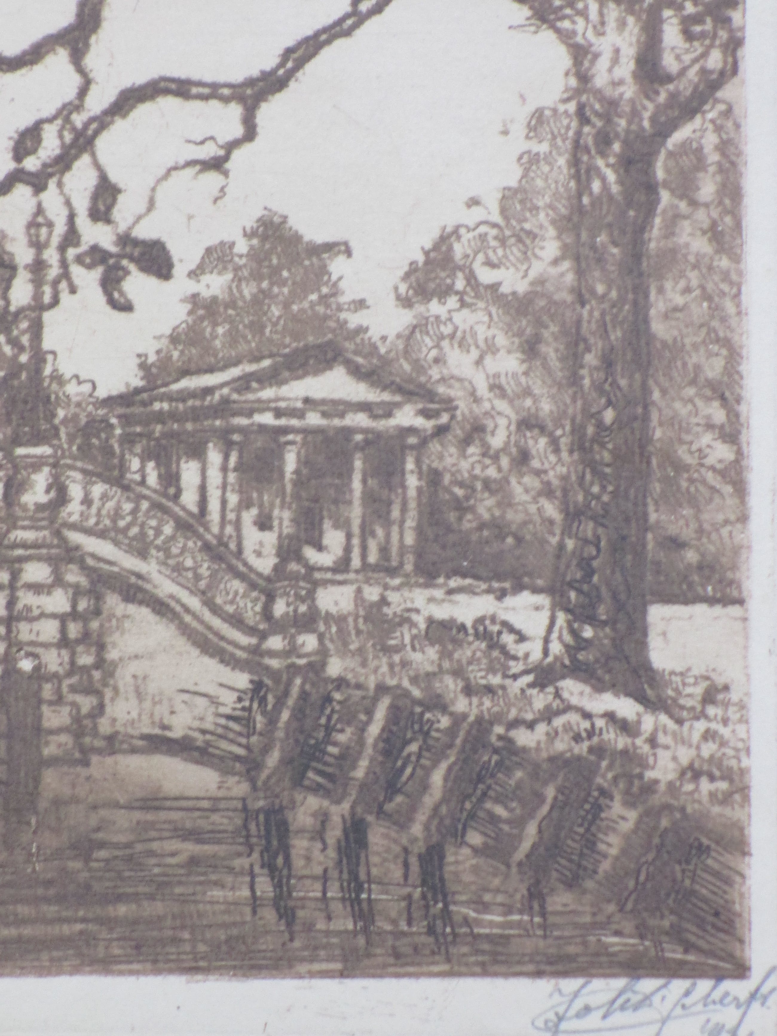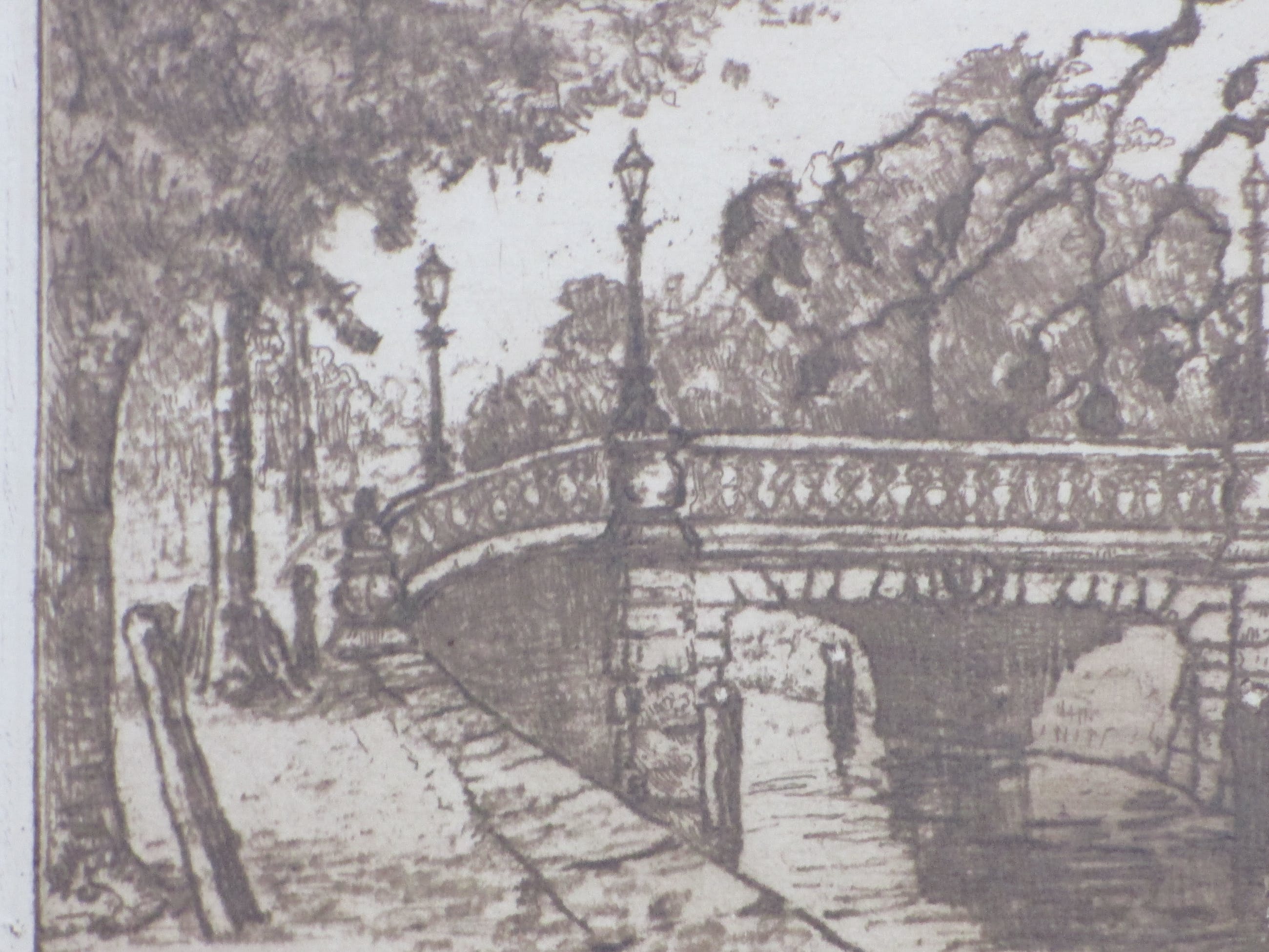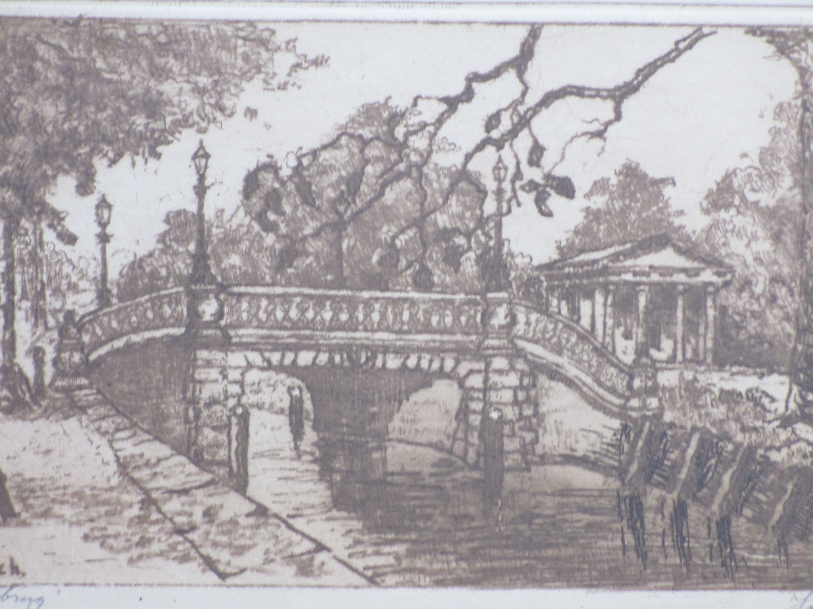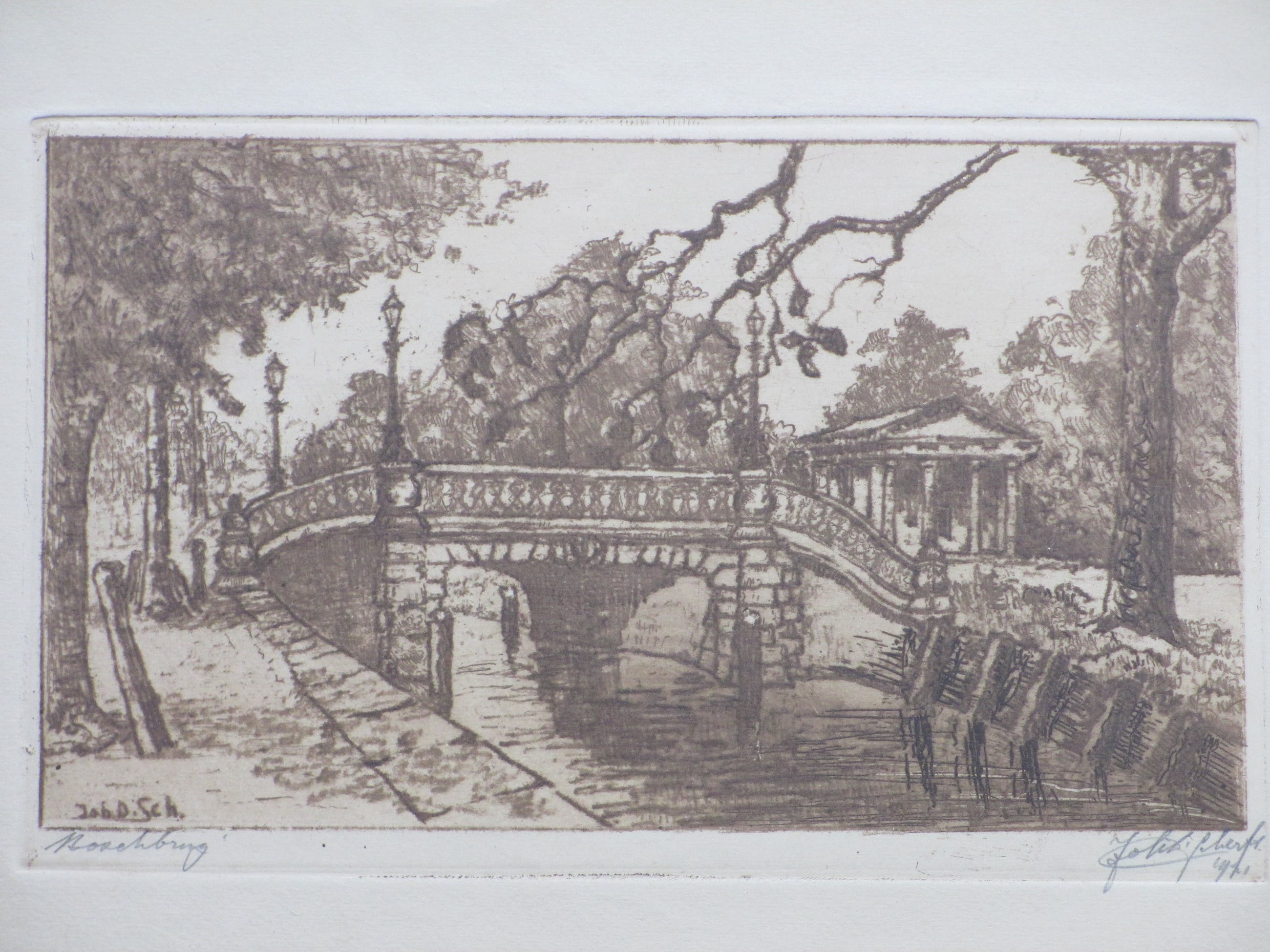 Ets door Johan D. Scherft Voorstelling van de Boschbrug in Den Haag Losbladig, beeldmaat 16x26.5, bladmaat 24.5x38 Gesigneerd en gedateerd in potlood r.o.: 'Joh.D. Scherft 1921' Getiteld in potlood l.o.: 'Boschbrug' Tevens gemonogrammeerd l.o. in de druk: 'Joh.D.Sch.' Authenticiteit volledig gegarandeerd