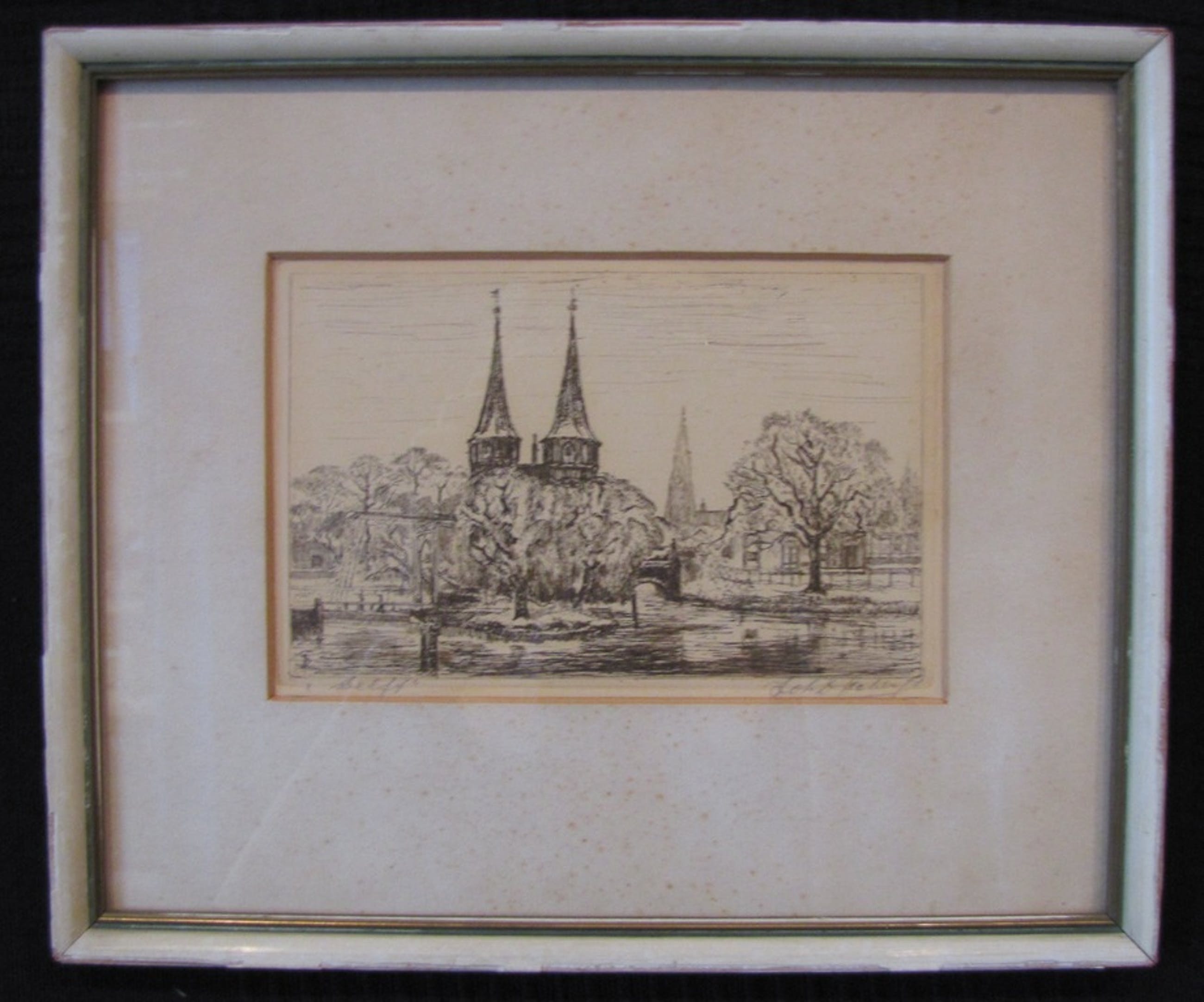 Gezicht op de Oostpoort te Delft door de Haagse kunstenaar Johannes Daniel Scherft (opgenomen in Scheen, deel II op pagina 302, omschreven als ''Belangrijk Haags graficus"). Mooi etsje, rechtsonder met potlood gesigneerd. Maten prent: 8,5x13,5 cm, met lijst: 20,5x24,5 cm. Voorzien van eenvoudig, wit houten lijstje en passepartout met gebruiksporen.