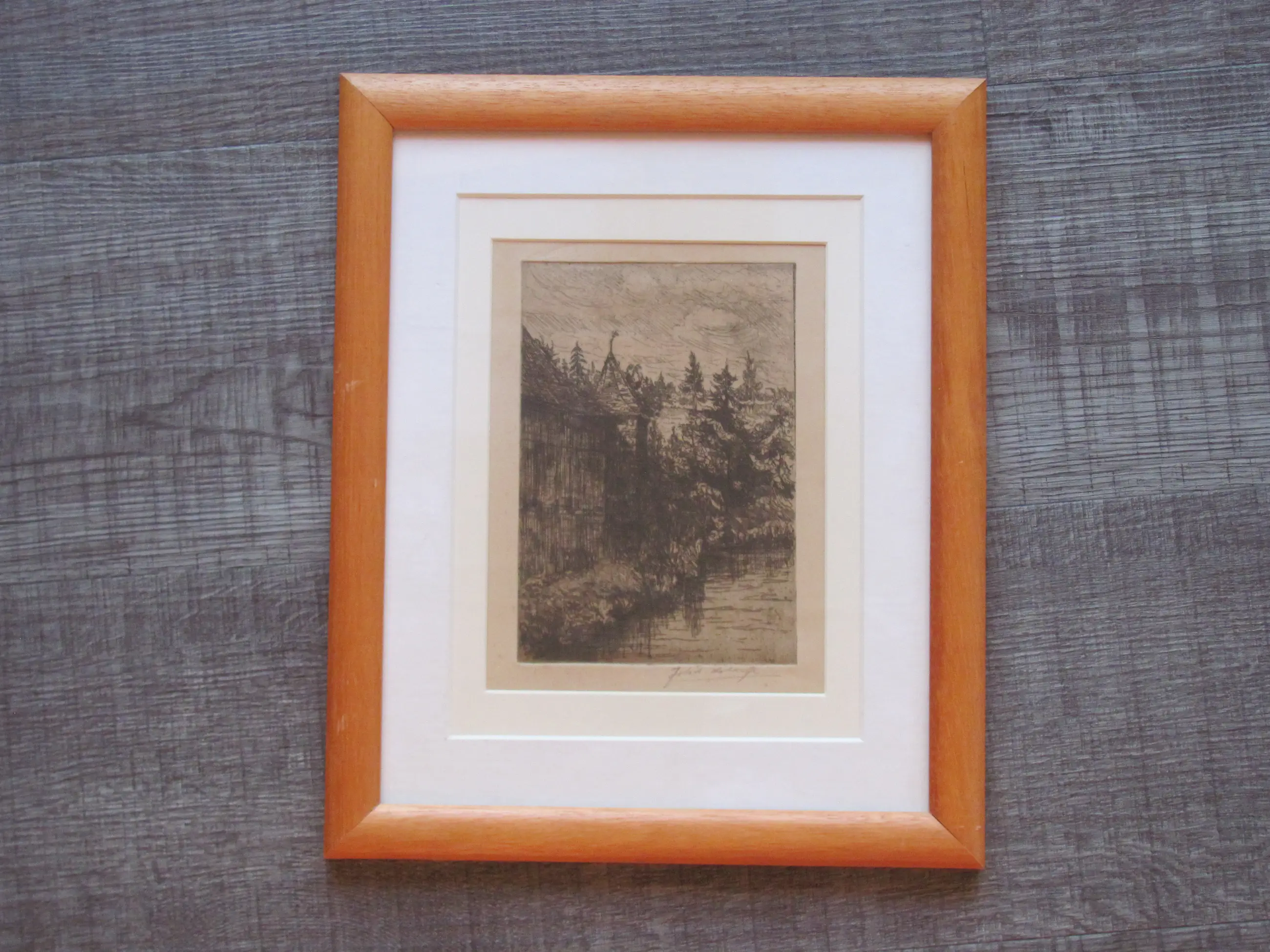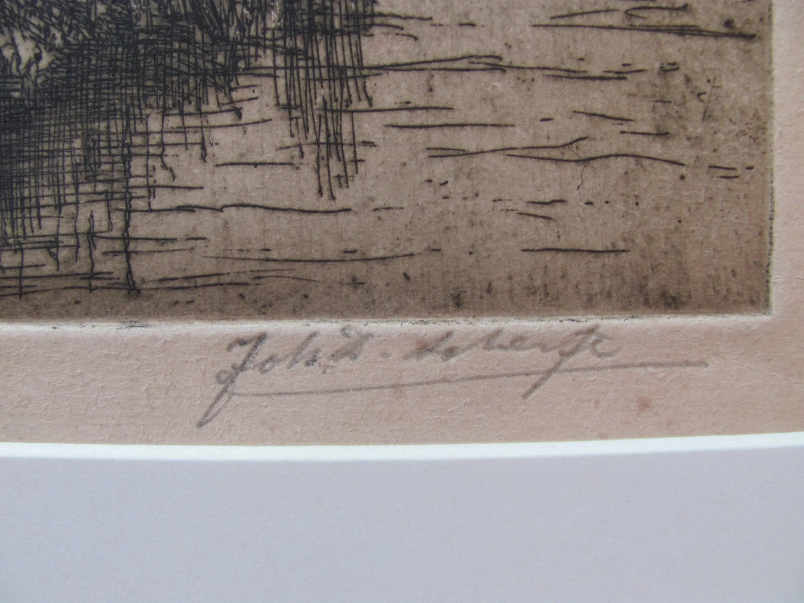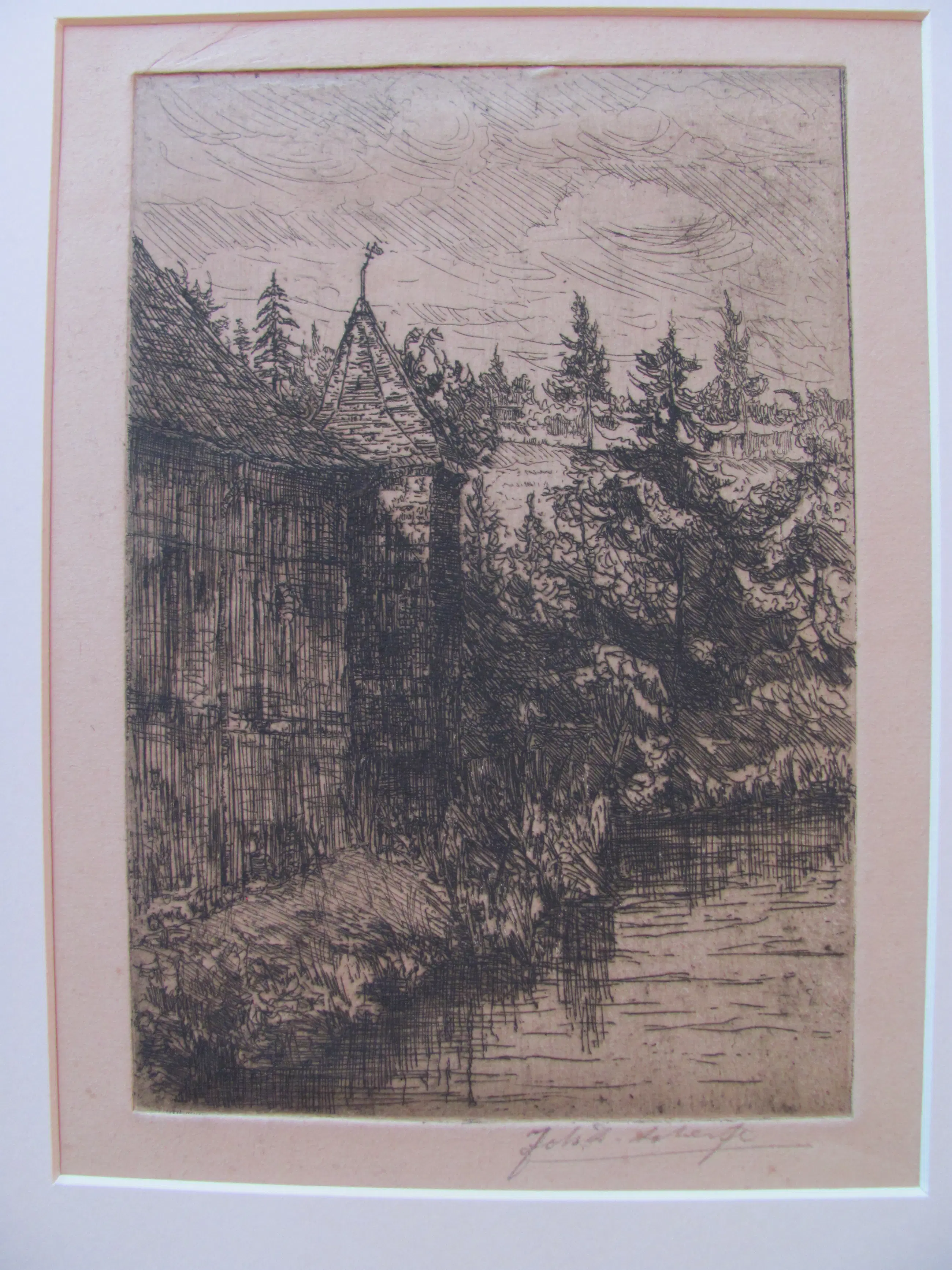 Mooie ets van Joh. D. Scherft van Kasteel Wijnandsrade. Niet gedateerd, maar vermoedelijk eerste helft 20ste eeuw. Potlood gesigneerd. De ets is ingelijst en de lijst is voorzien van een dubbel passe-partout.