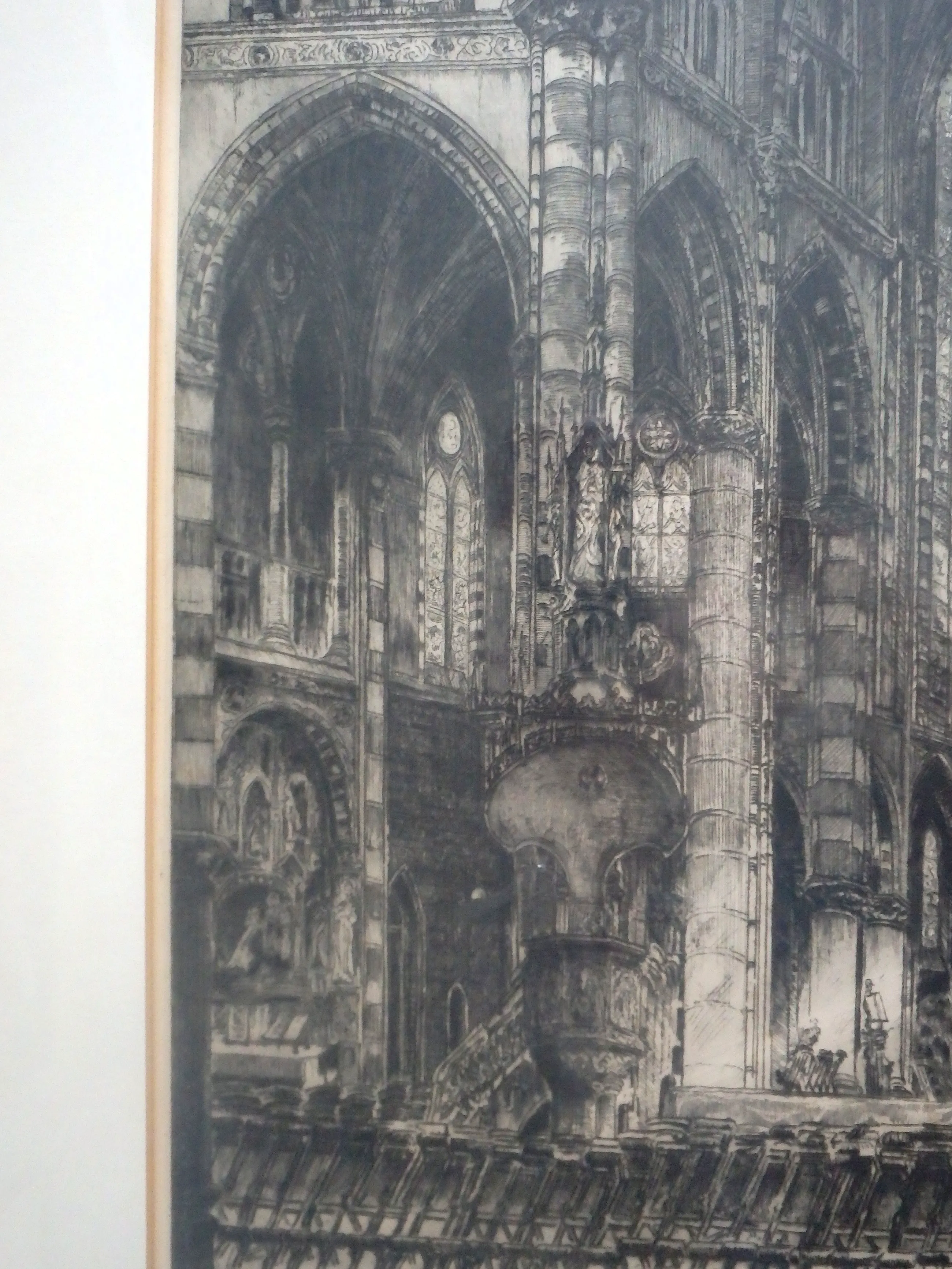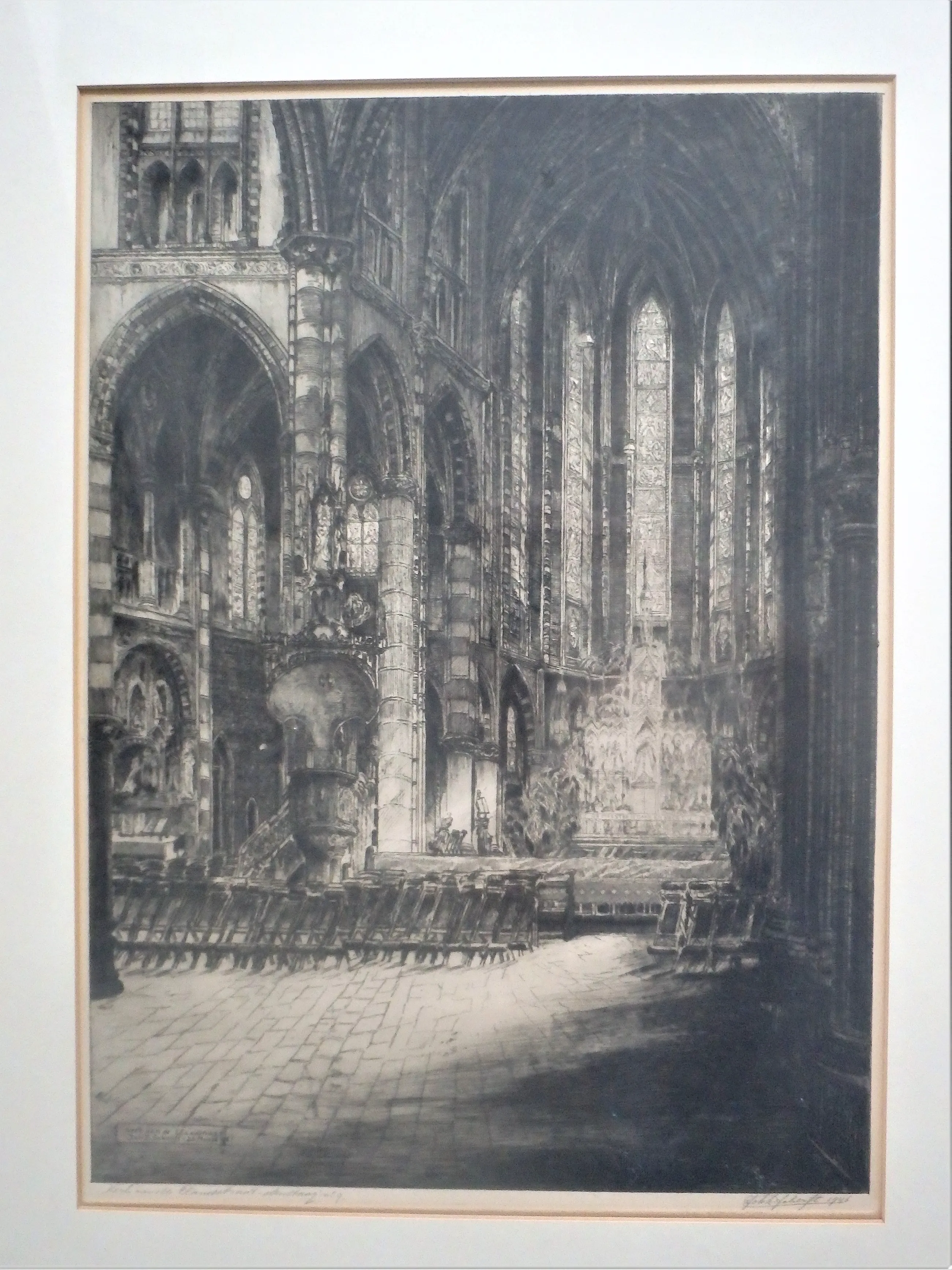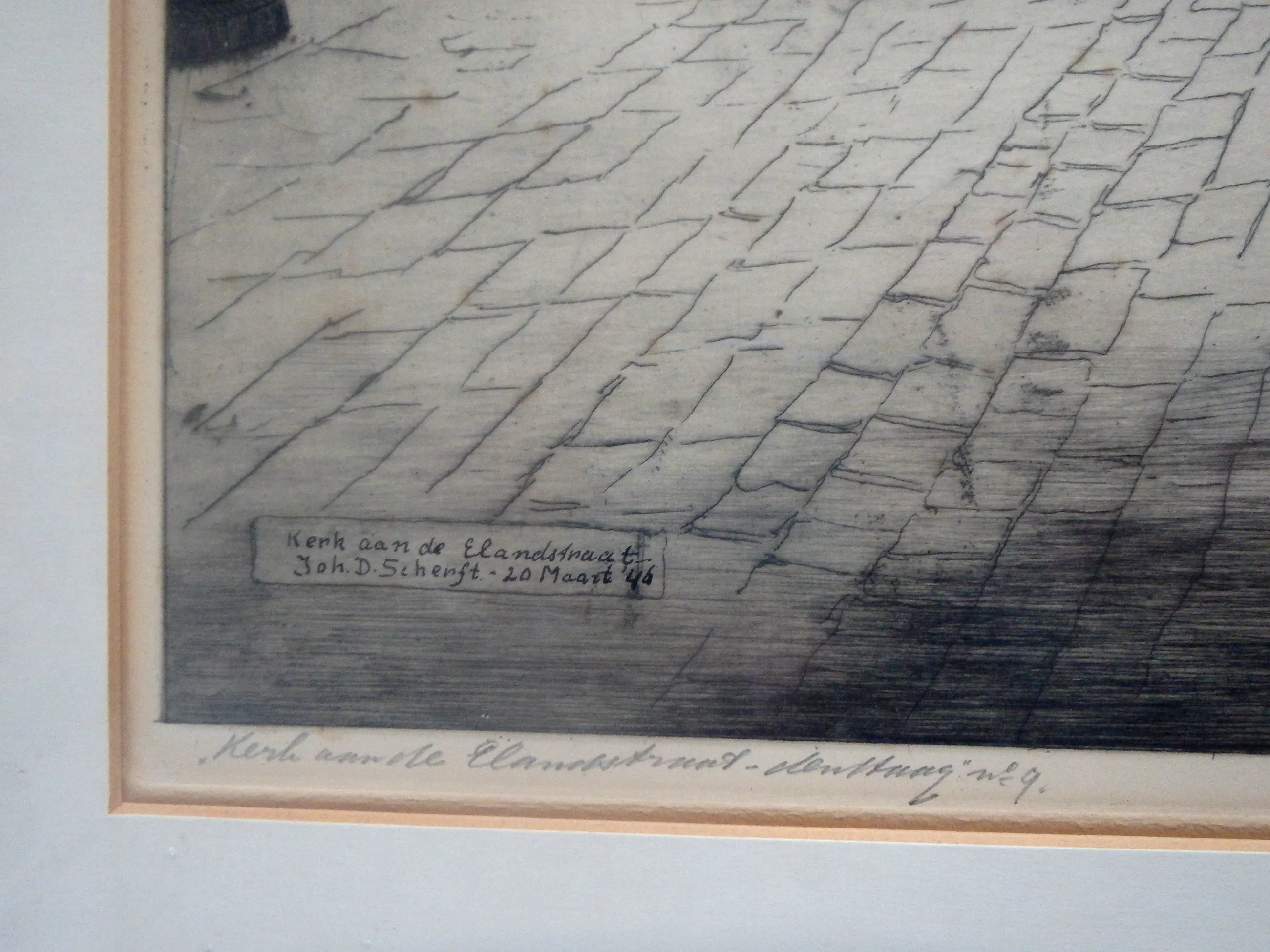 Ets 55x38, in de ets kerk een de Elandstraat - Joh. D. Scherft 20 maart 1946, netjes ingelijst, maat lijst 75x58
