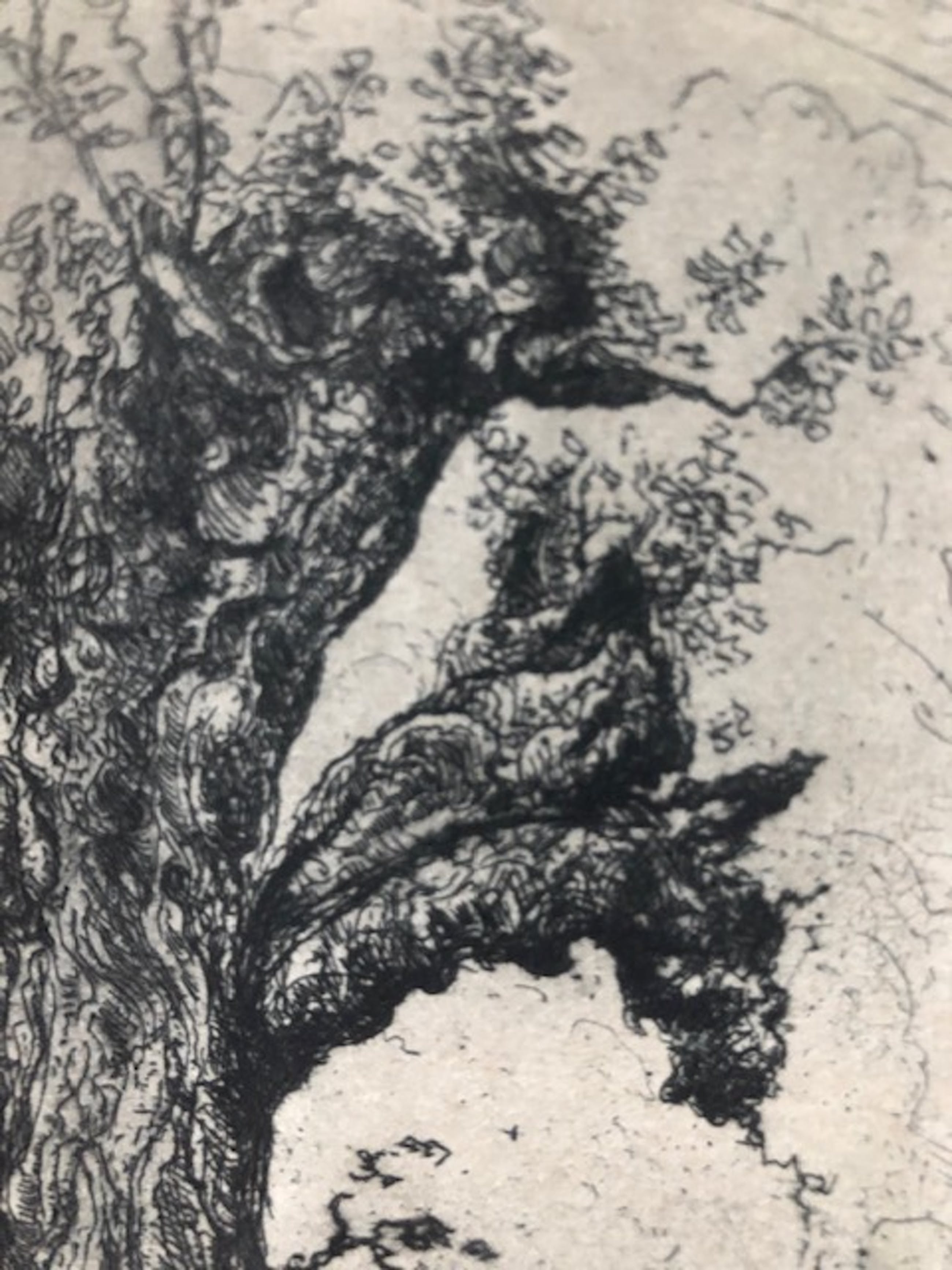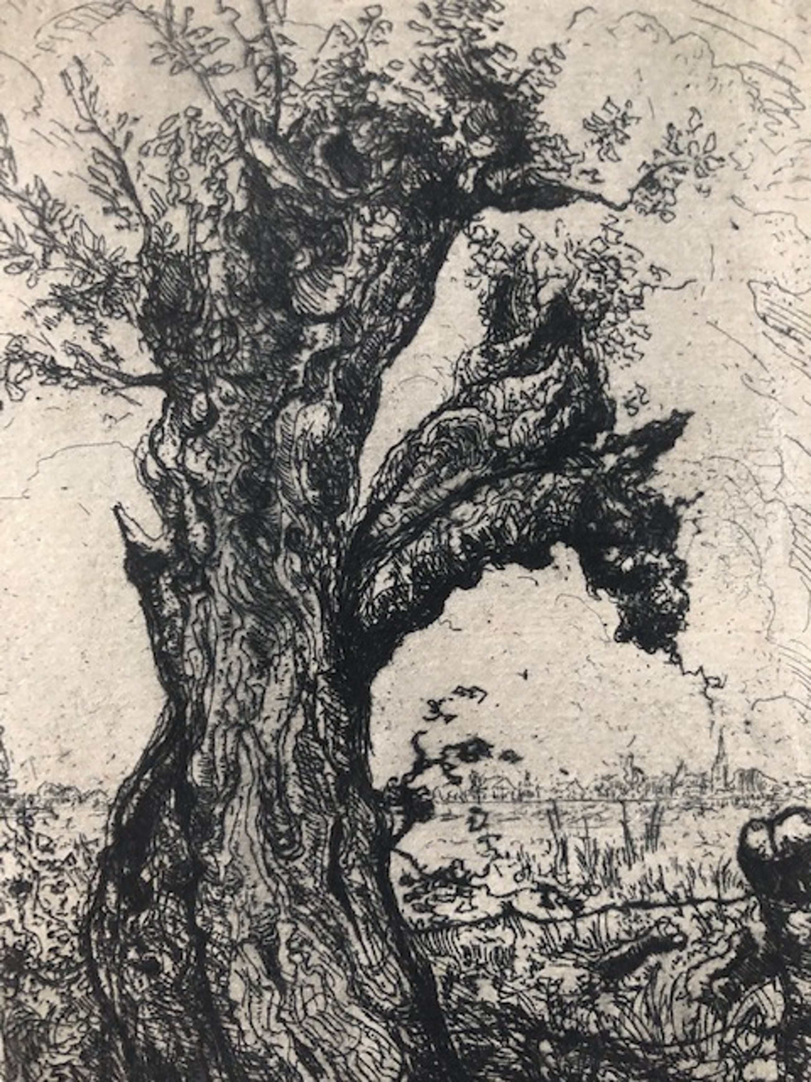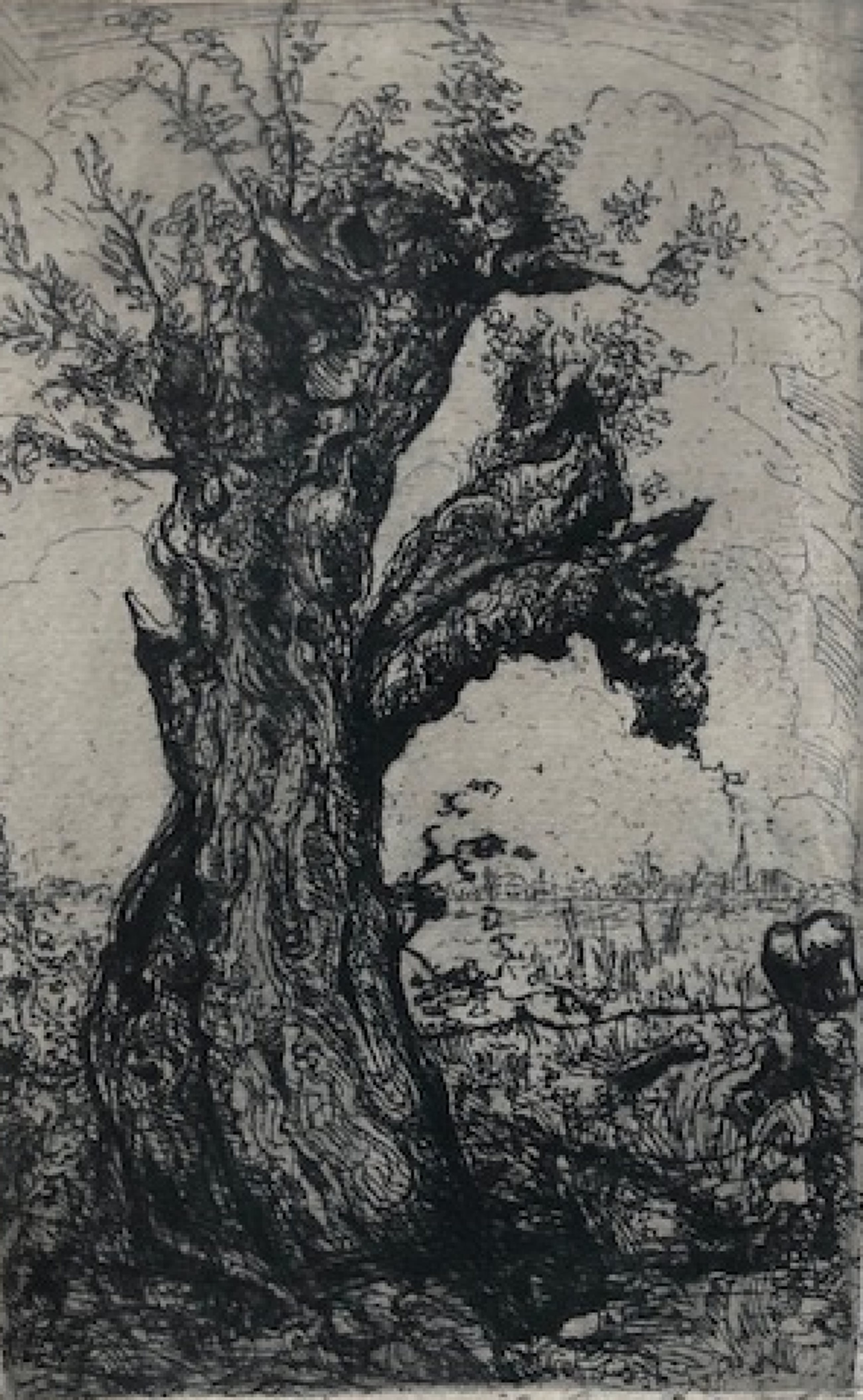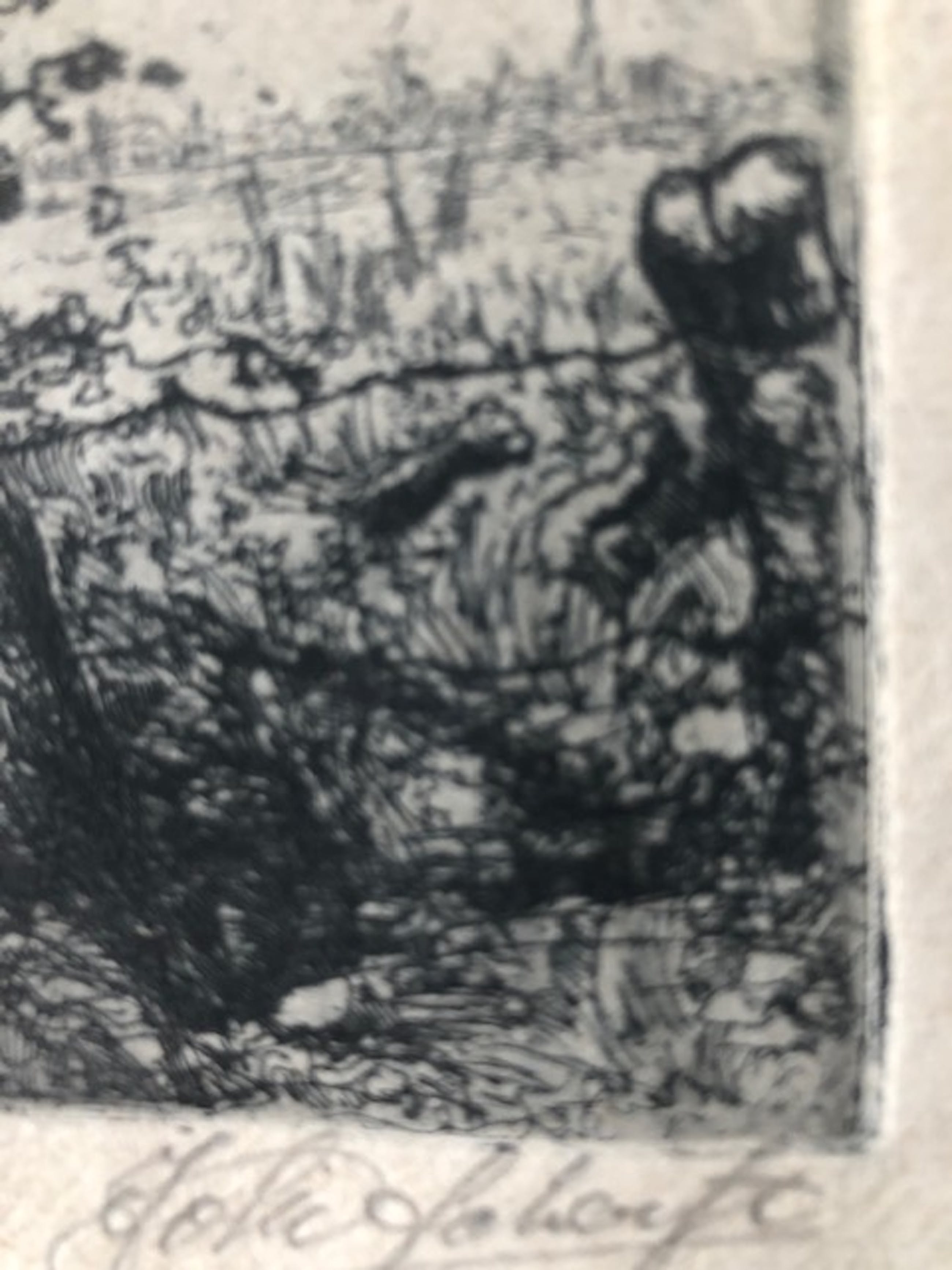 Ets door Johan D. Scherft met voorstelling van een knotwilg in een Hollands decor. Gesigneerd en gedateerd in potlood r.o. 'Joh.D.Scherft' 1942. Getiteld l.o. in potlood 'Knotwilg'. Beeldmaat: 13.4 x 8.5 cm. Authenticiteit volledig gegarandeerd