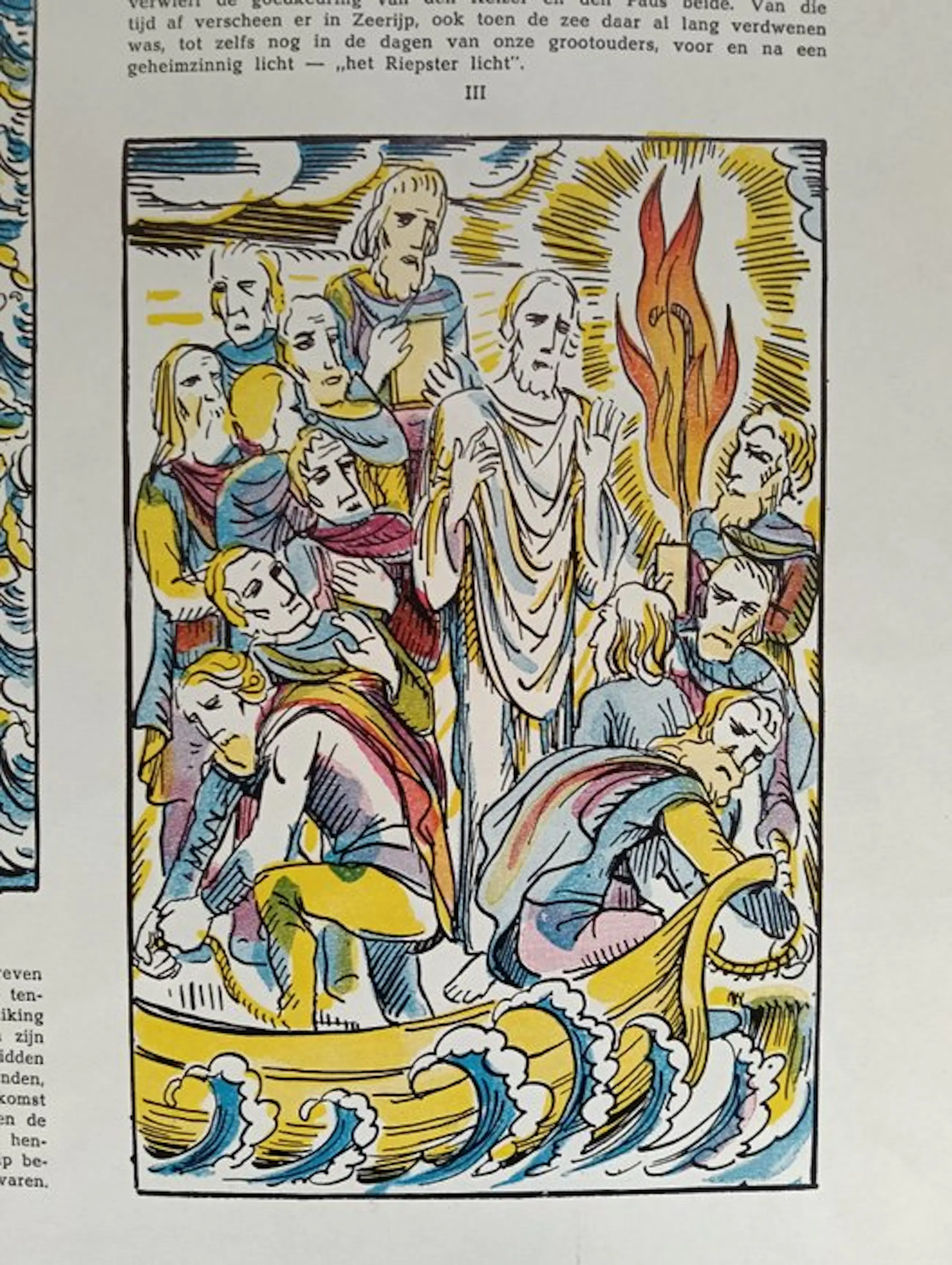 De prent van Johan Dijkstra is geïnspireerd op een van de gebrandschilderde ramen in de Aula van de Groninger Universiteit, dat gewijd is aan de totstandkoming van de Friese wetten, waarmee de bekende legende van het Rypster Licht verband houdt.