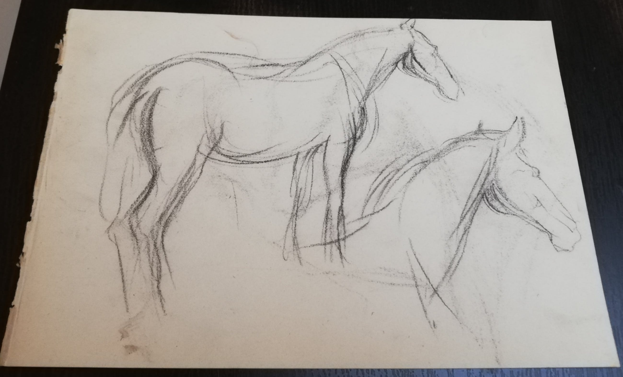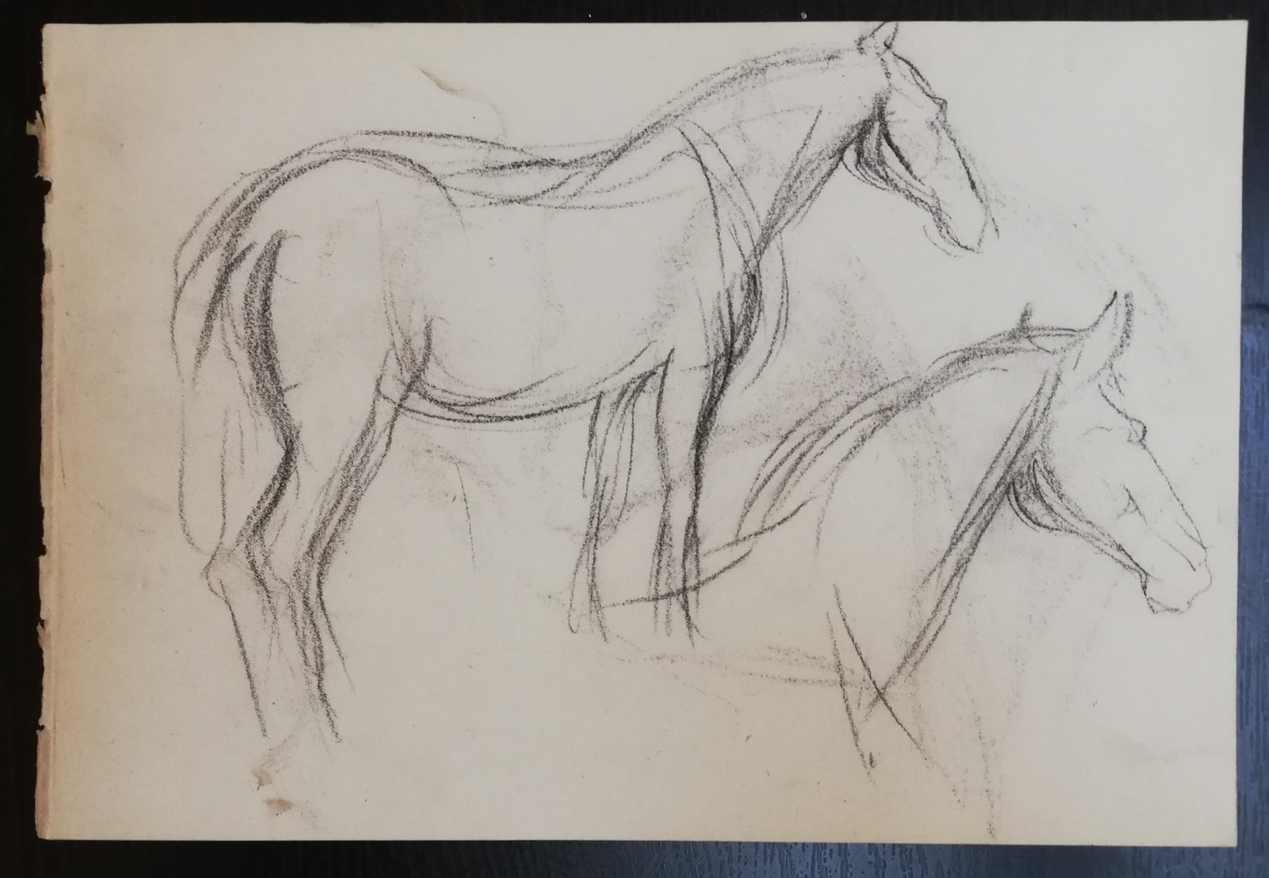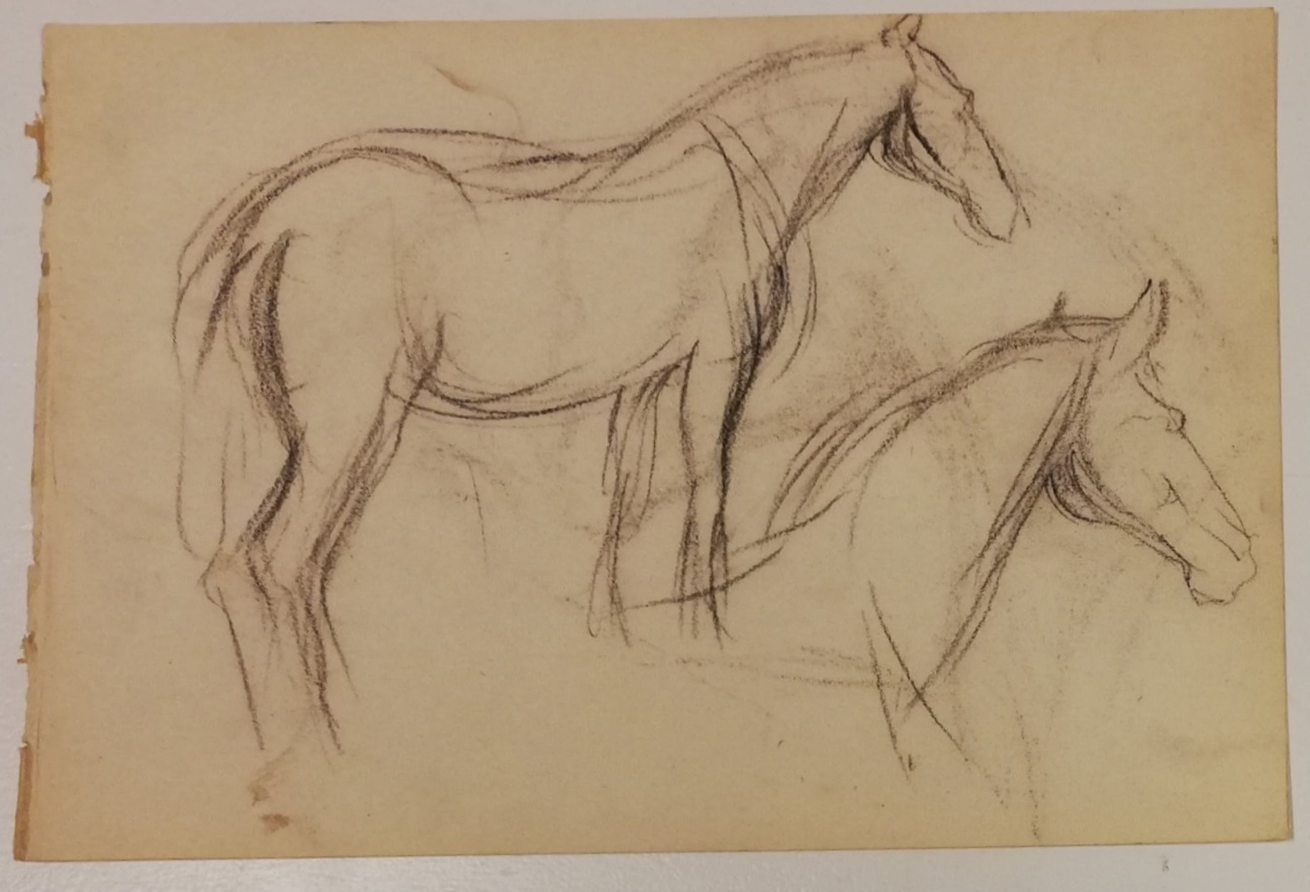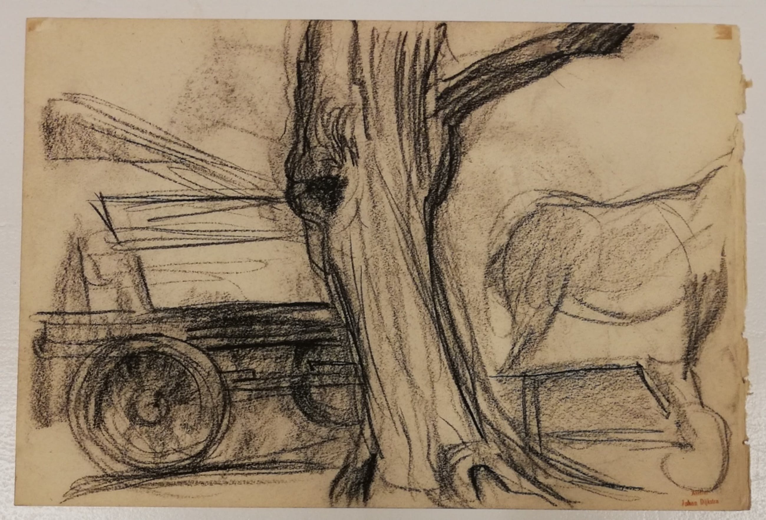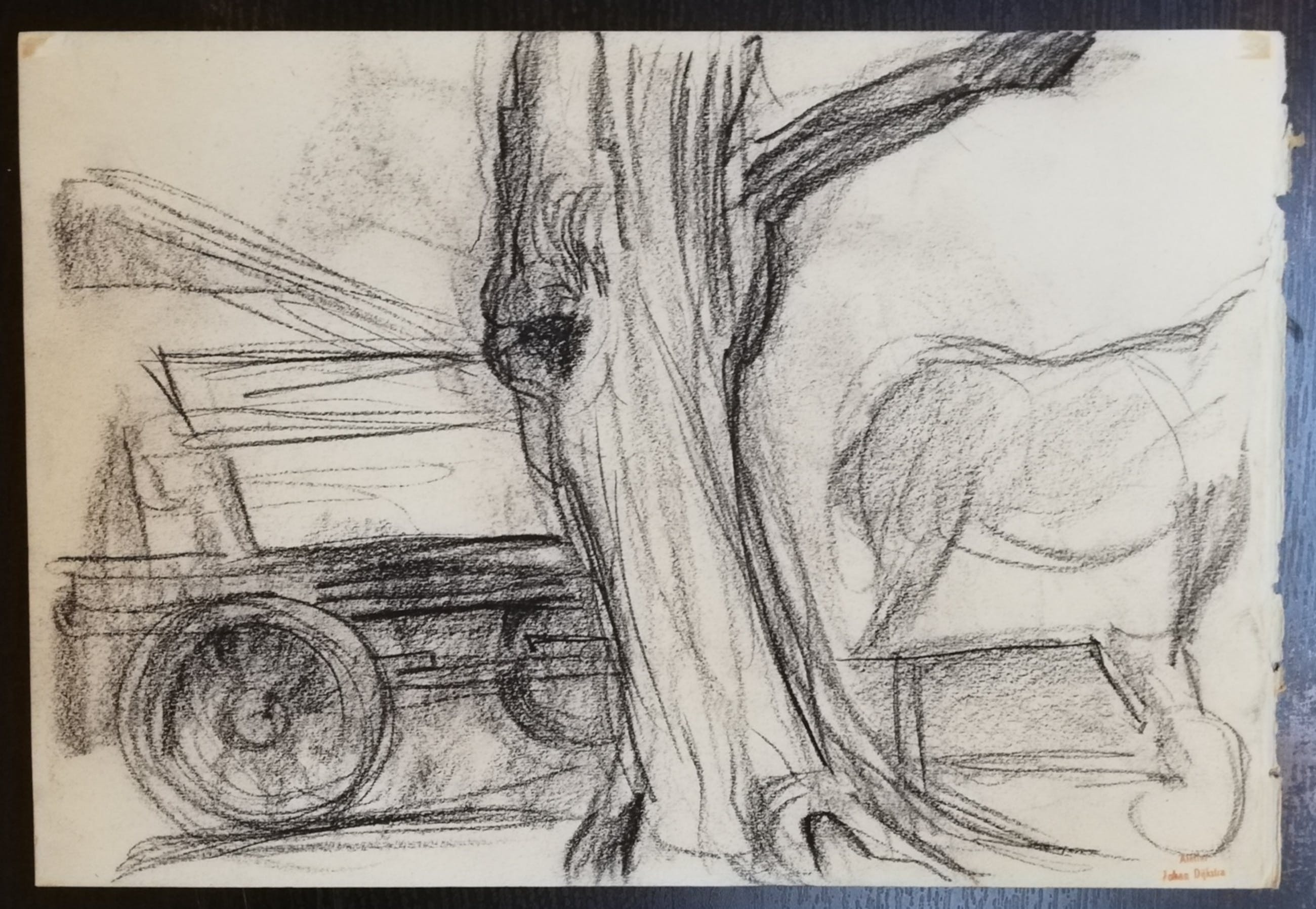 Oude potloodschets van een paard door Groninger Ploeg kunstenaar Johan Dijkstra. Op de andere zijde nog een schets van een kar in een landschap. Voorzien van het atelierstempel van Dijkstra. Papier is wat vergeeld.
