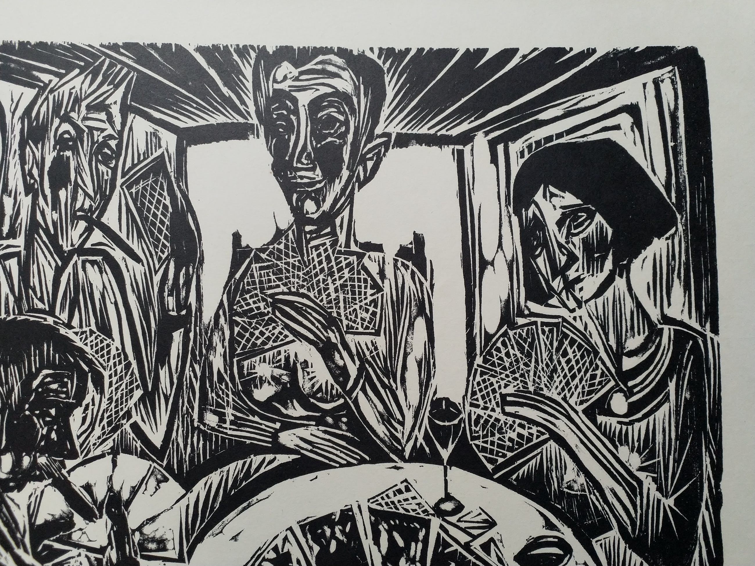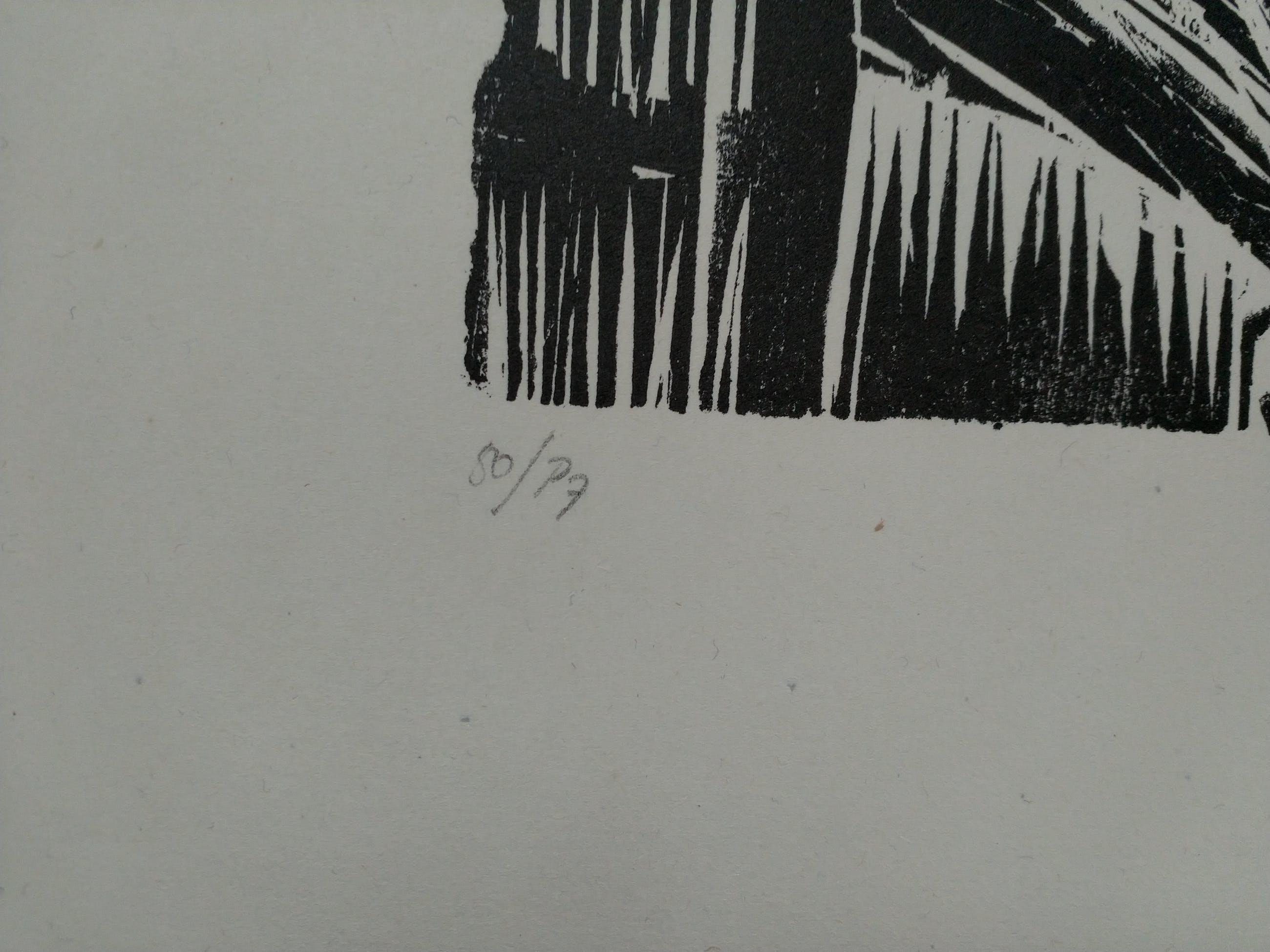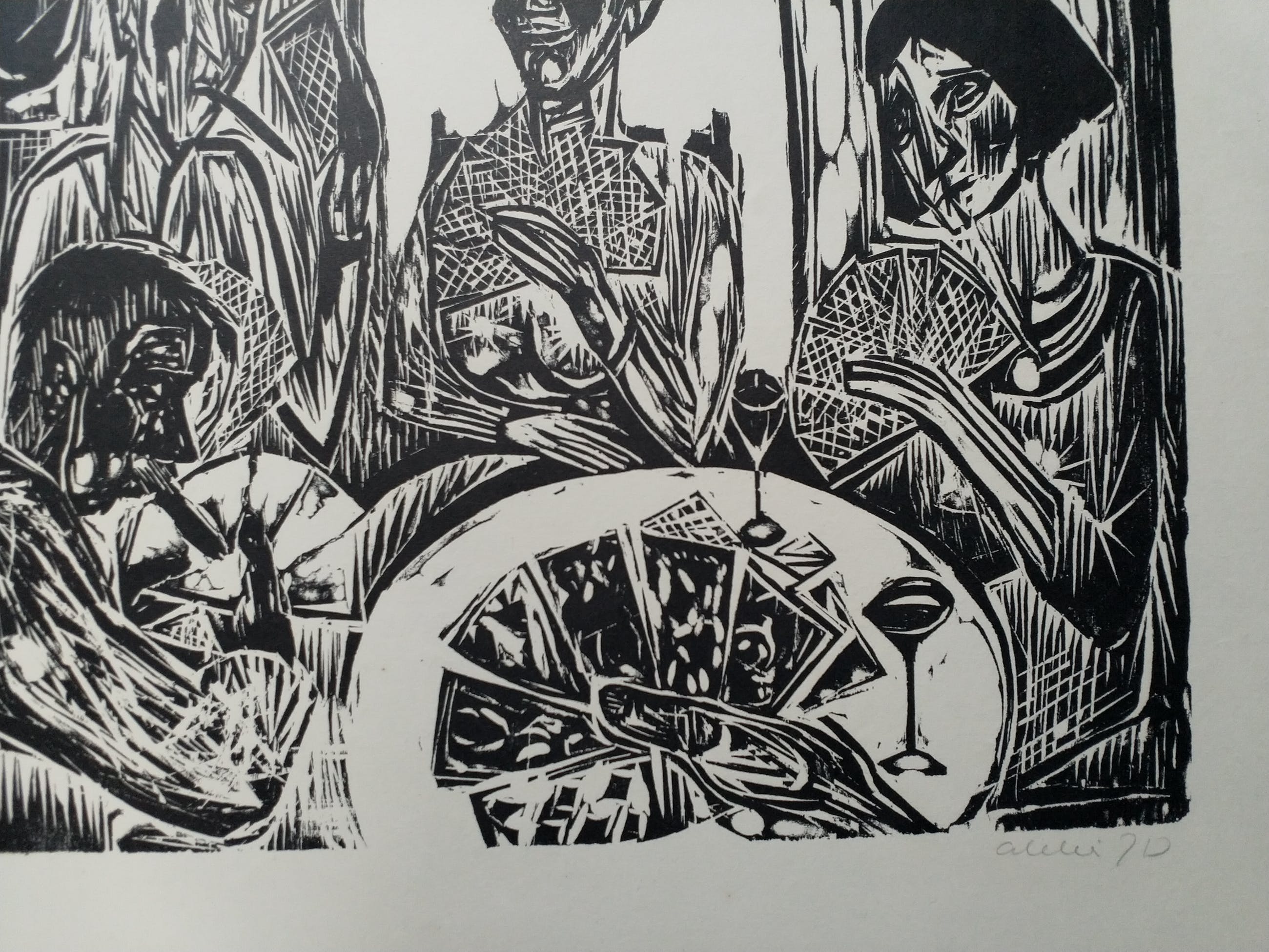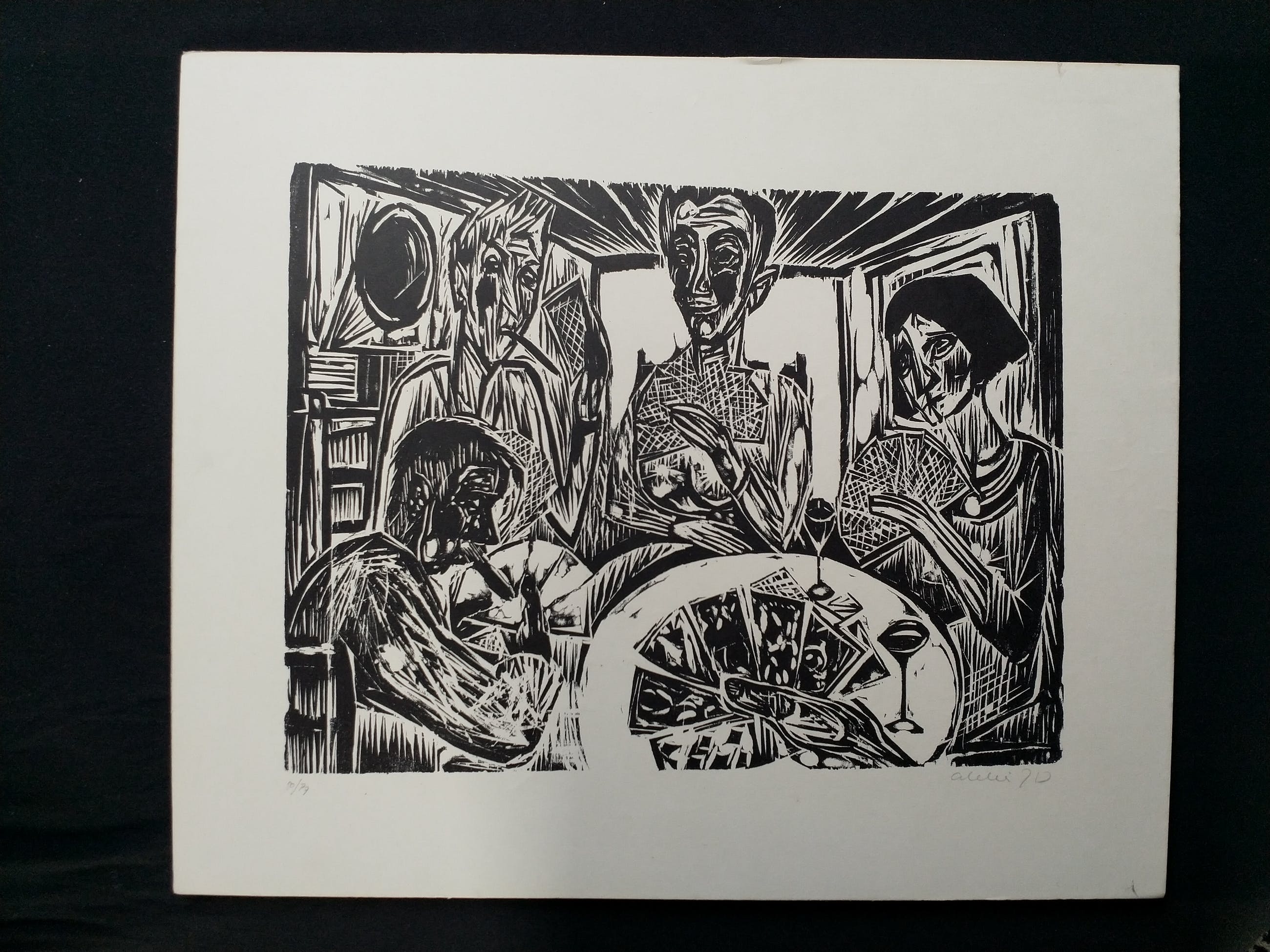 Houtsnede, kaartspelers door Johan Dijkstra, genummerd 80/77 en gesigneerd (atelier J D) in potlood door de kunstenaar. De houtsnede maakt deel uit van het vooroorlogse (ca. 1924) oeuvre van Dijkstra. De afbeelding is 42,5 x 31,5 cm groot en is op een stevige ondergrond gelijmd. Het geheel is 55 x 46 cm. De prent verkeerd in goede staat.