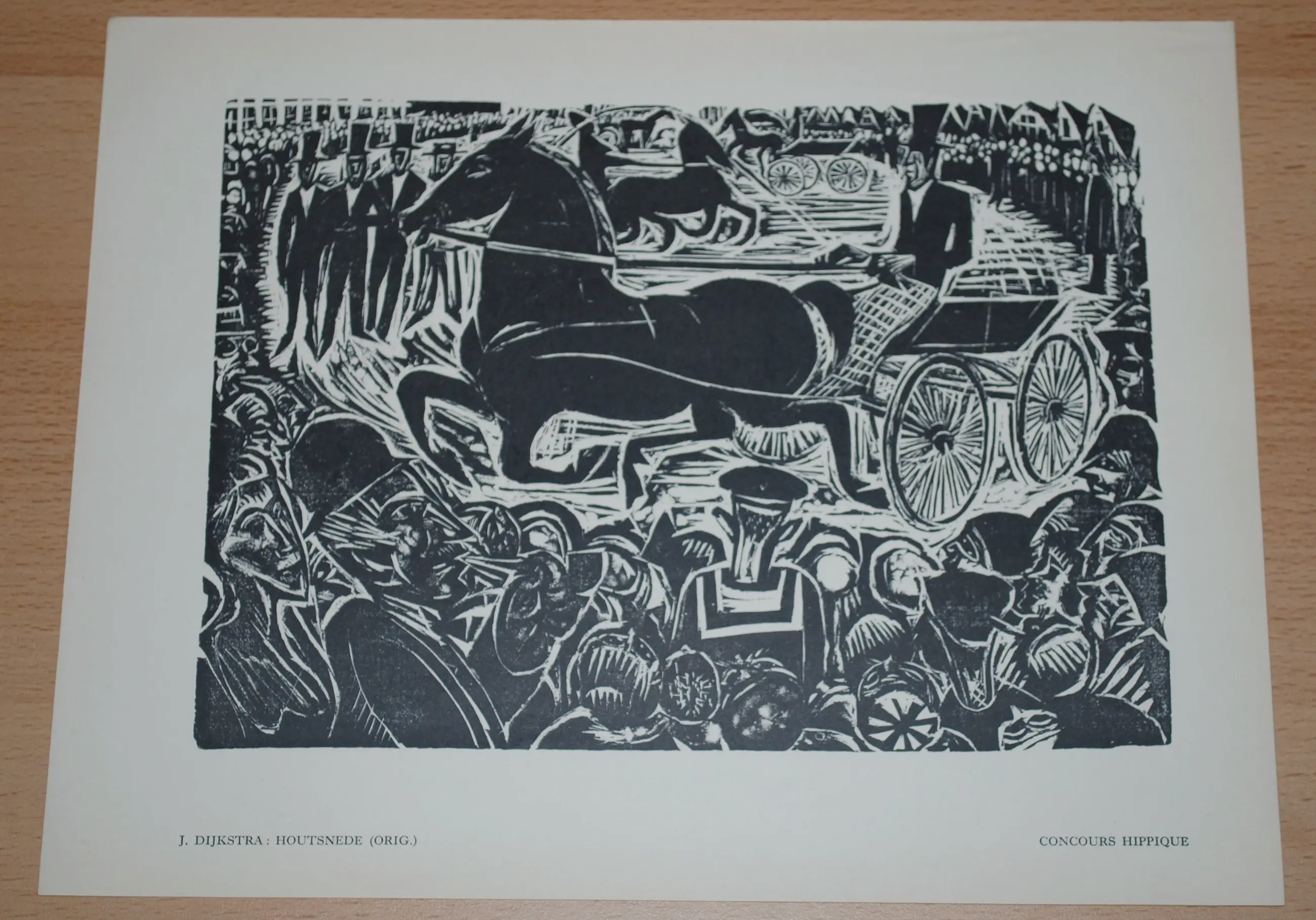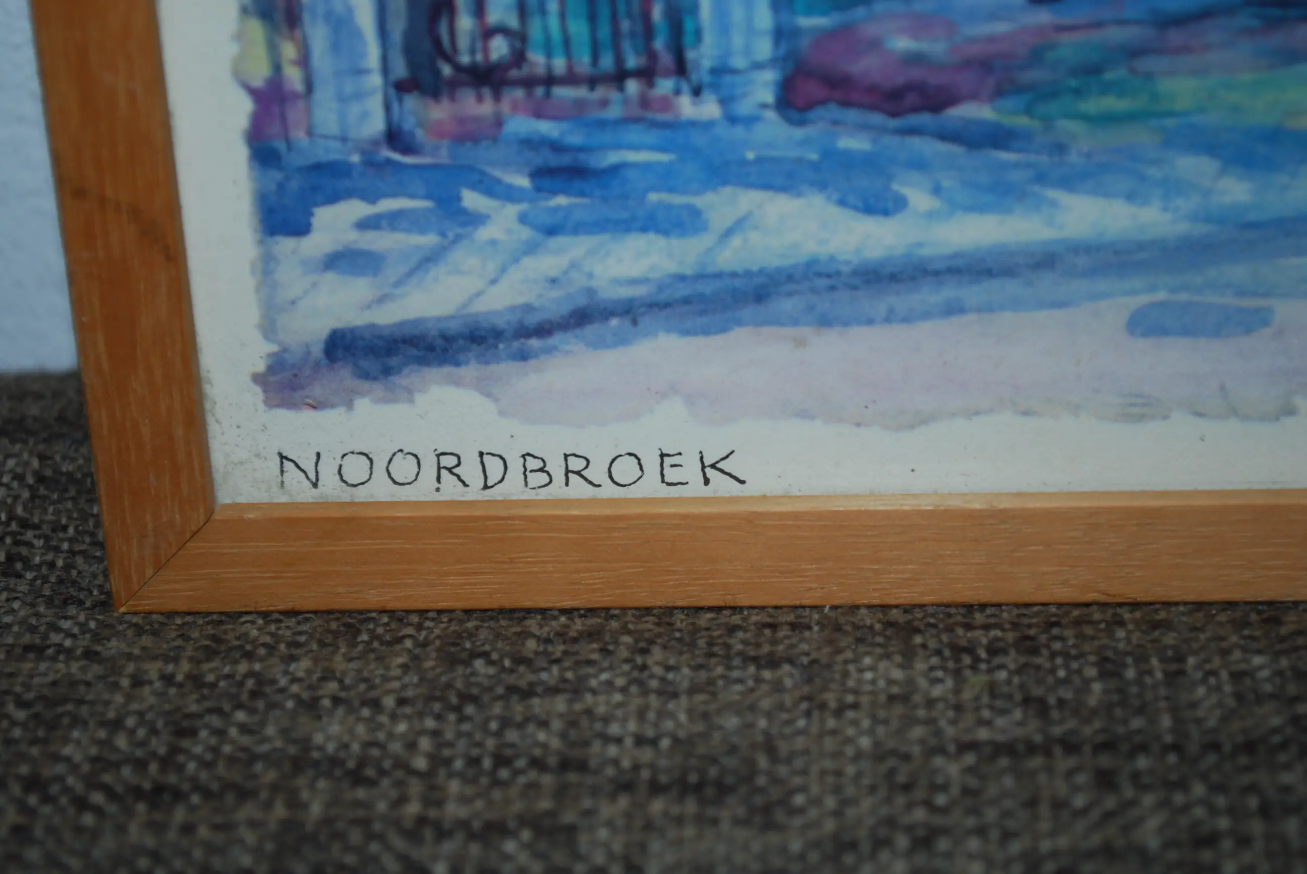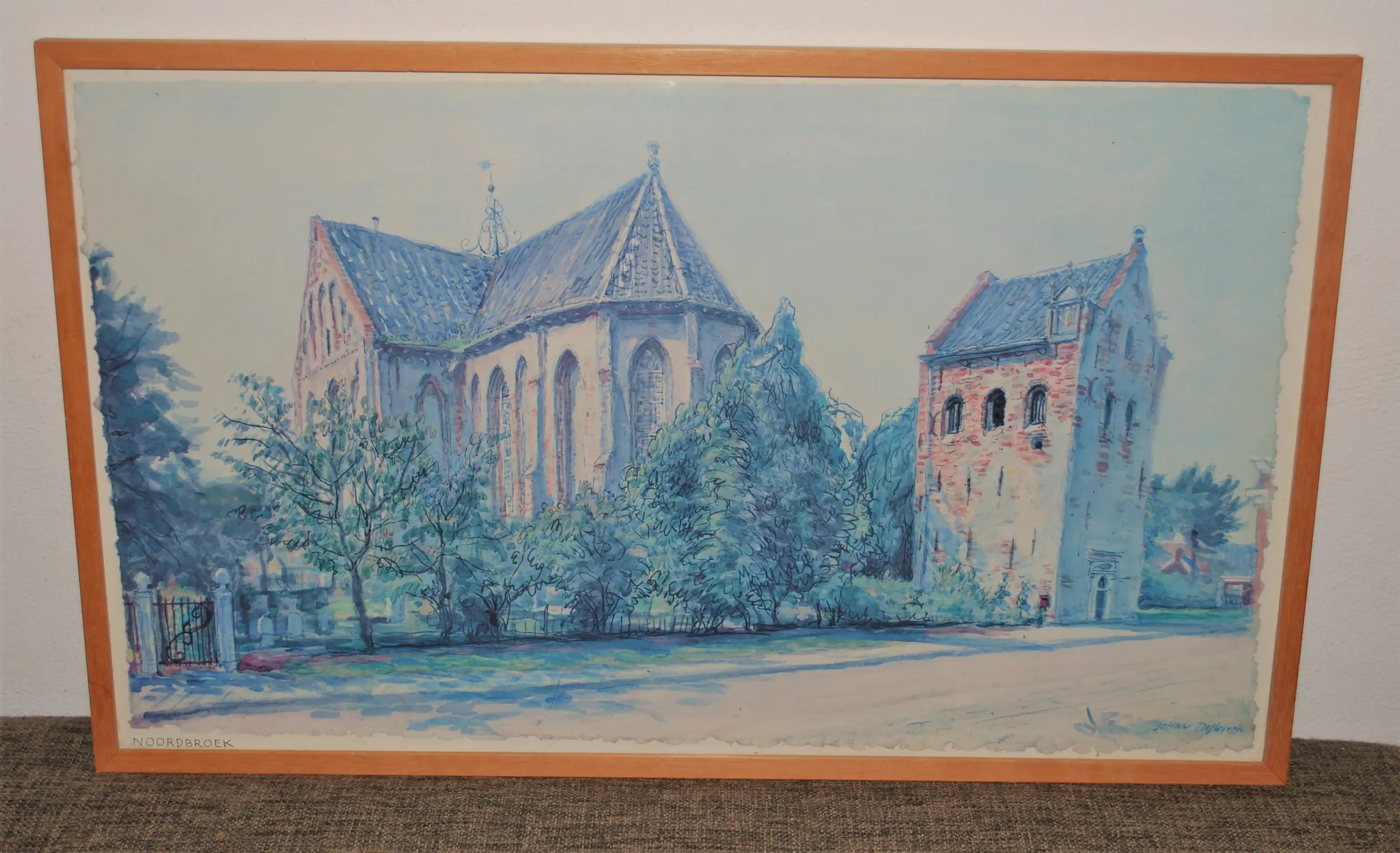 daarbij de offsetlitho Noordbroek, achter glas ingelijst. Verkocht door kunsthandel Ongering in de jaren 50. Lichte verkleuring. In de druk gesigneerd. Buitenmaat 30x50 cm.