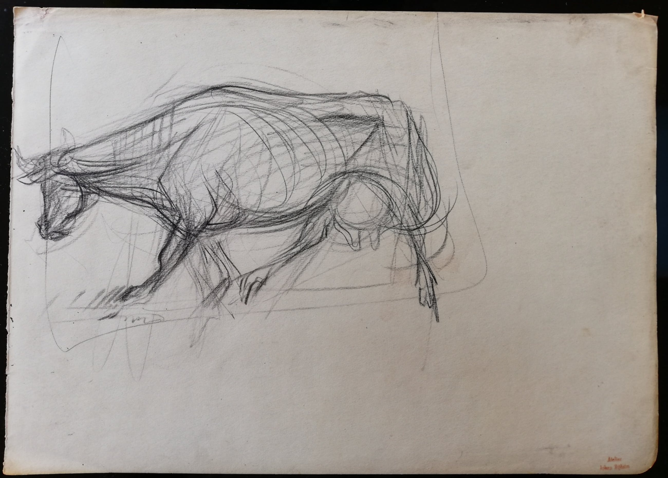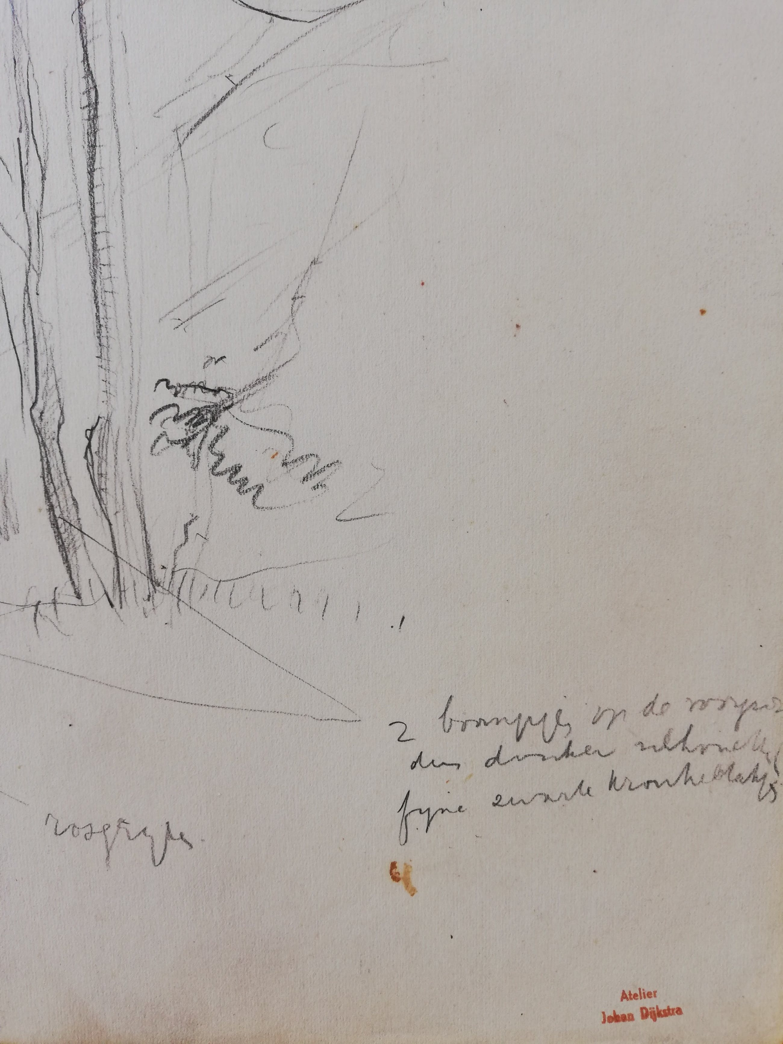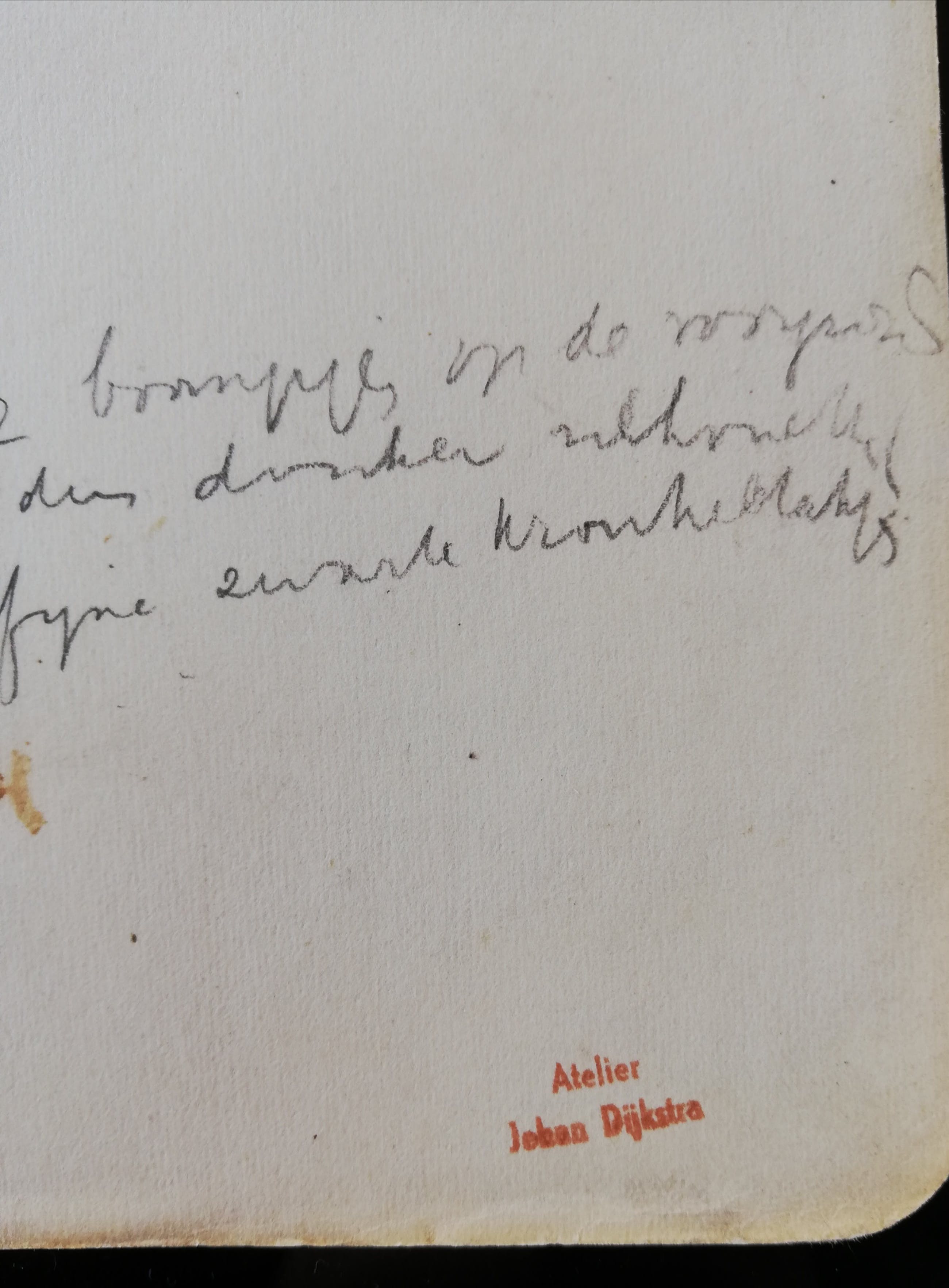 Potlood schets van een koe door Groninger Ploeg kunstenaar Johan Dijkstra. Gesigneerd door middel van het atelierstempel. Op de achterzijde eveneens een schets, minder fraai met enkele aantekeningen. Achterzijde is eveneens voorzien van atelierstempel.