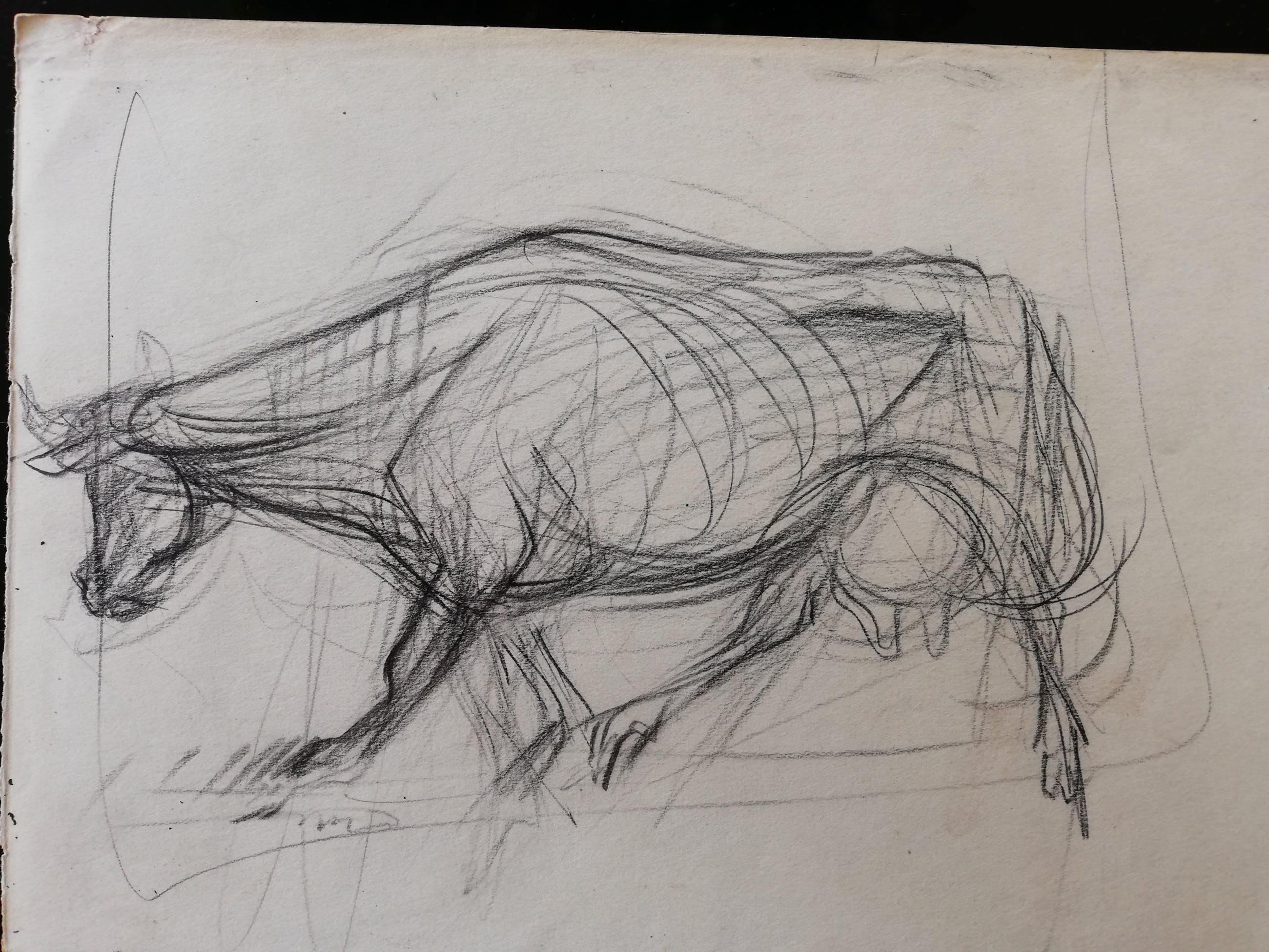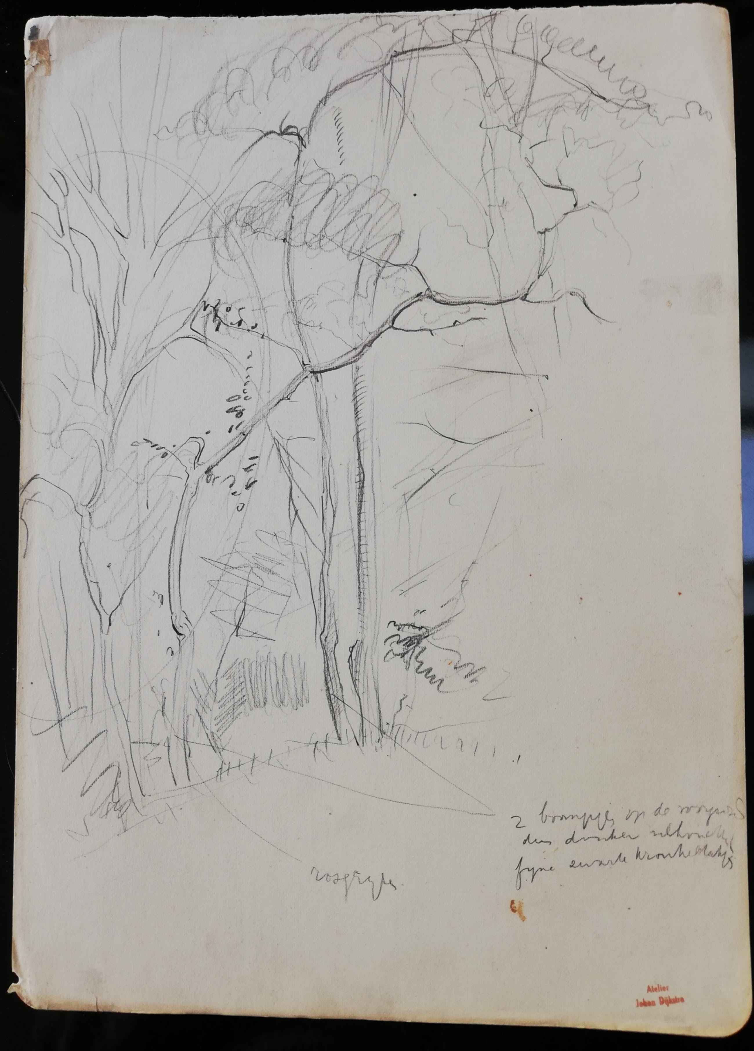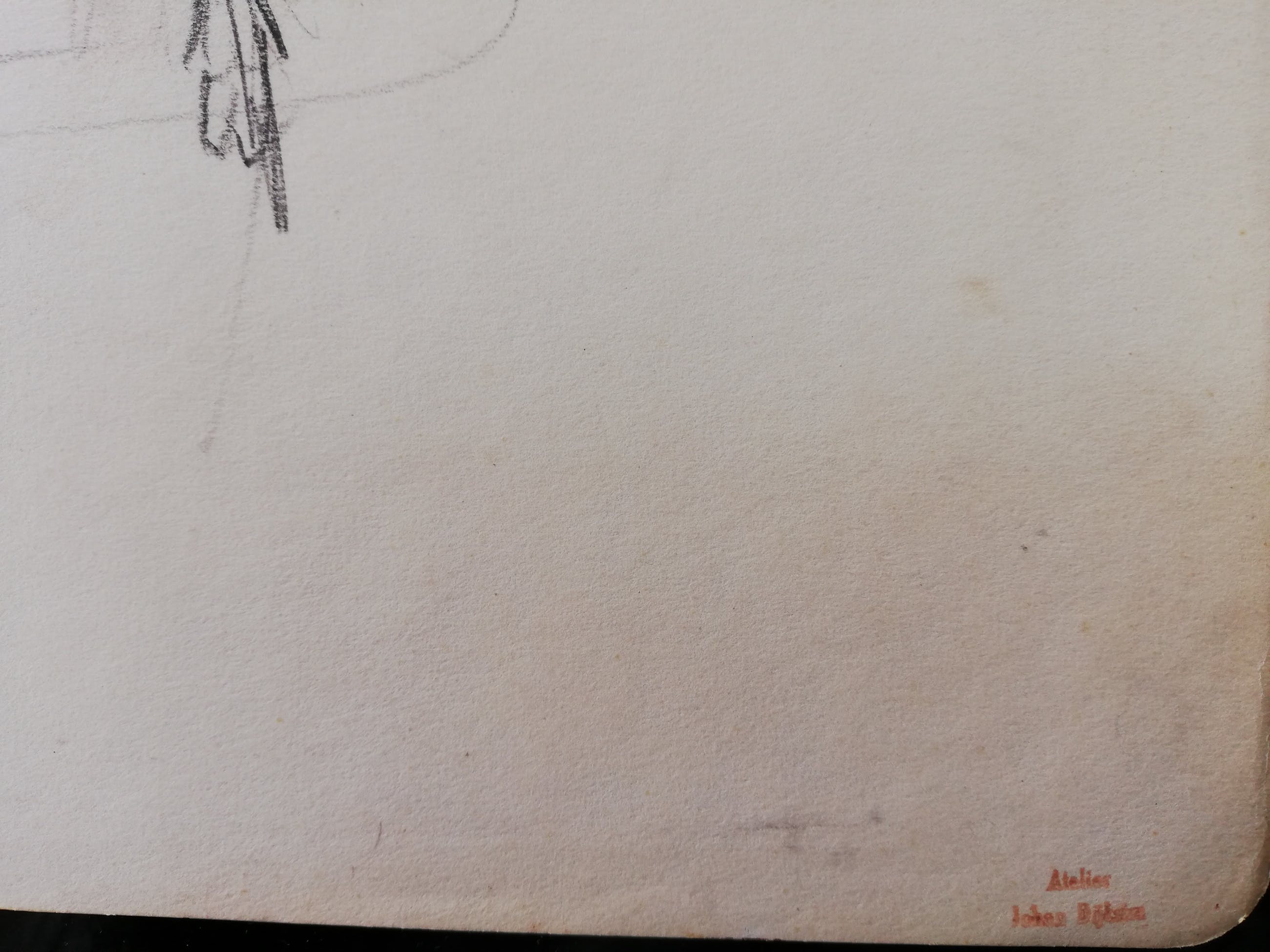 Potlood schets van een koe door Groninger Ploeg kunstenaar Johan Dijkstra. Gesigneerd door middel van het atelierstempel. Op de achterzijde eveneens een schets, minder fraai met enkele aantekeningen. Achterzijde is eveneens voorzien van atelierstempel.
