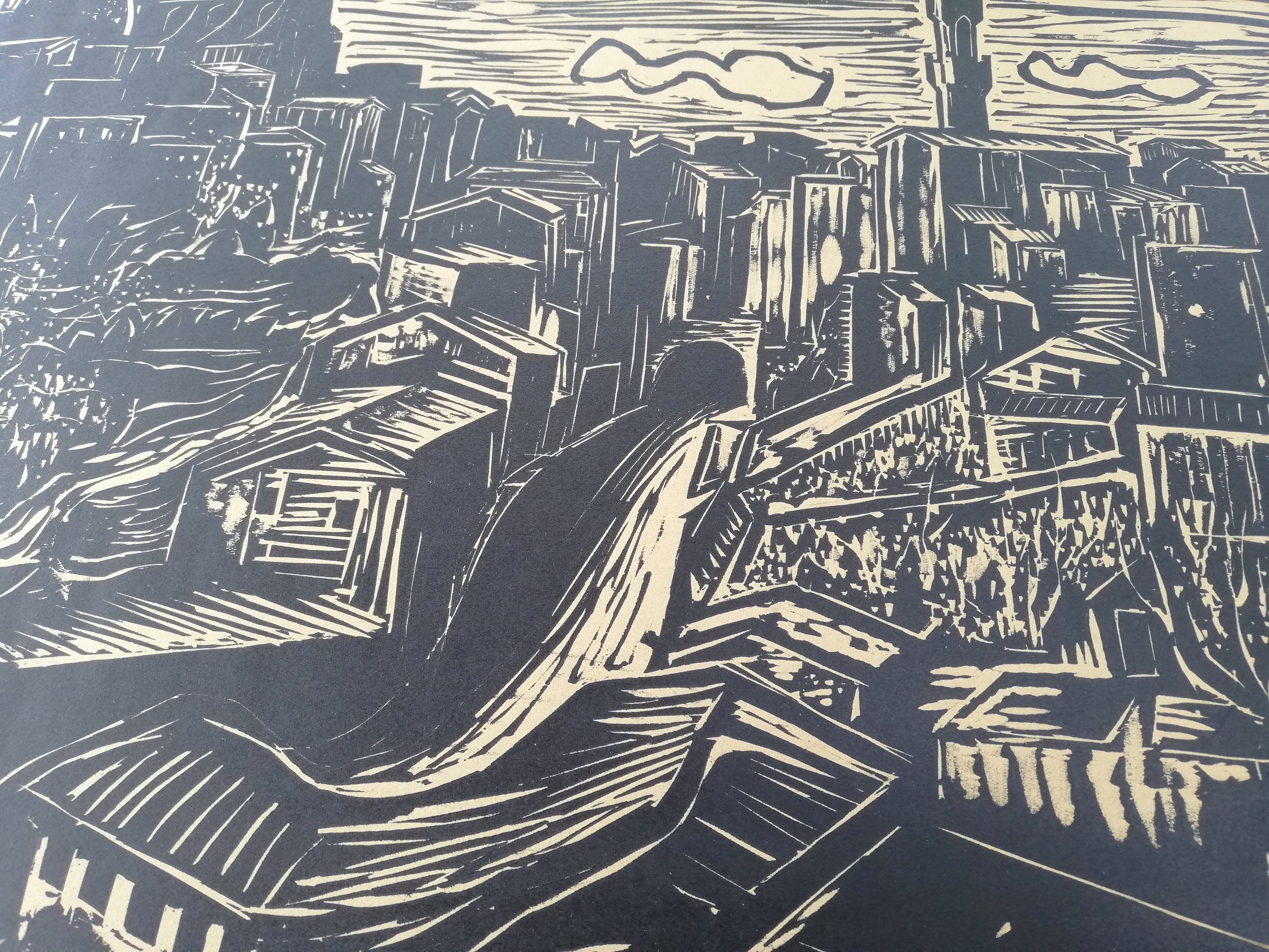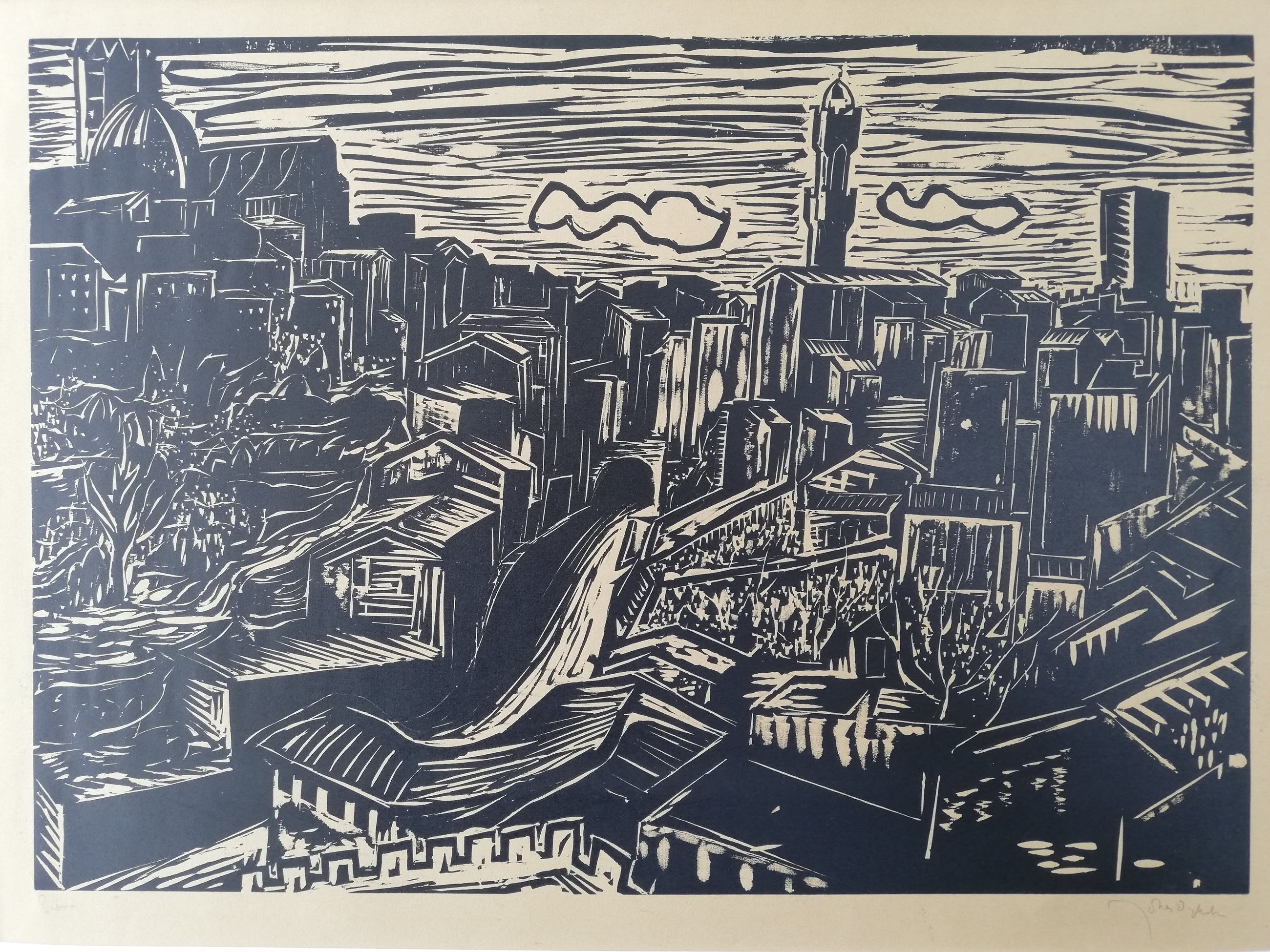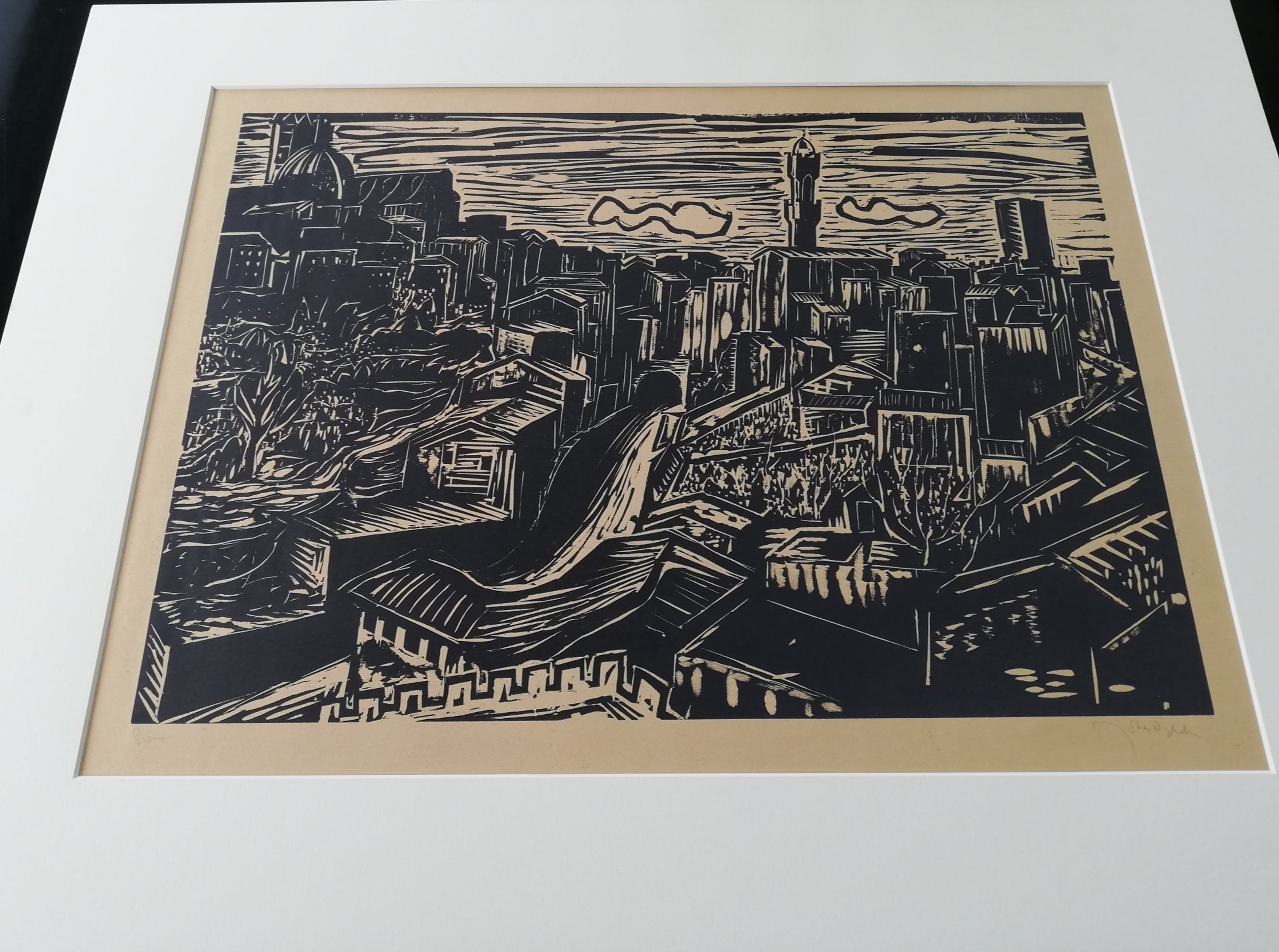 Zeer grote houtsnede op stevig donker papier van Groninger Ploeg voorman Johan Dijkstra. Betreft een voorstelling van de Italiaanse stad Siena. Gesigneerd en getiteld met potlood. Niet genummerd, er zijn enkele exemplaren bekend. Schaars.
