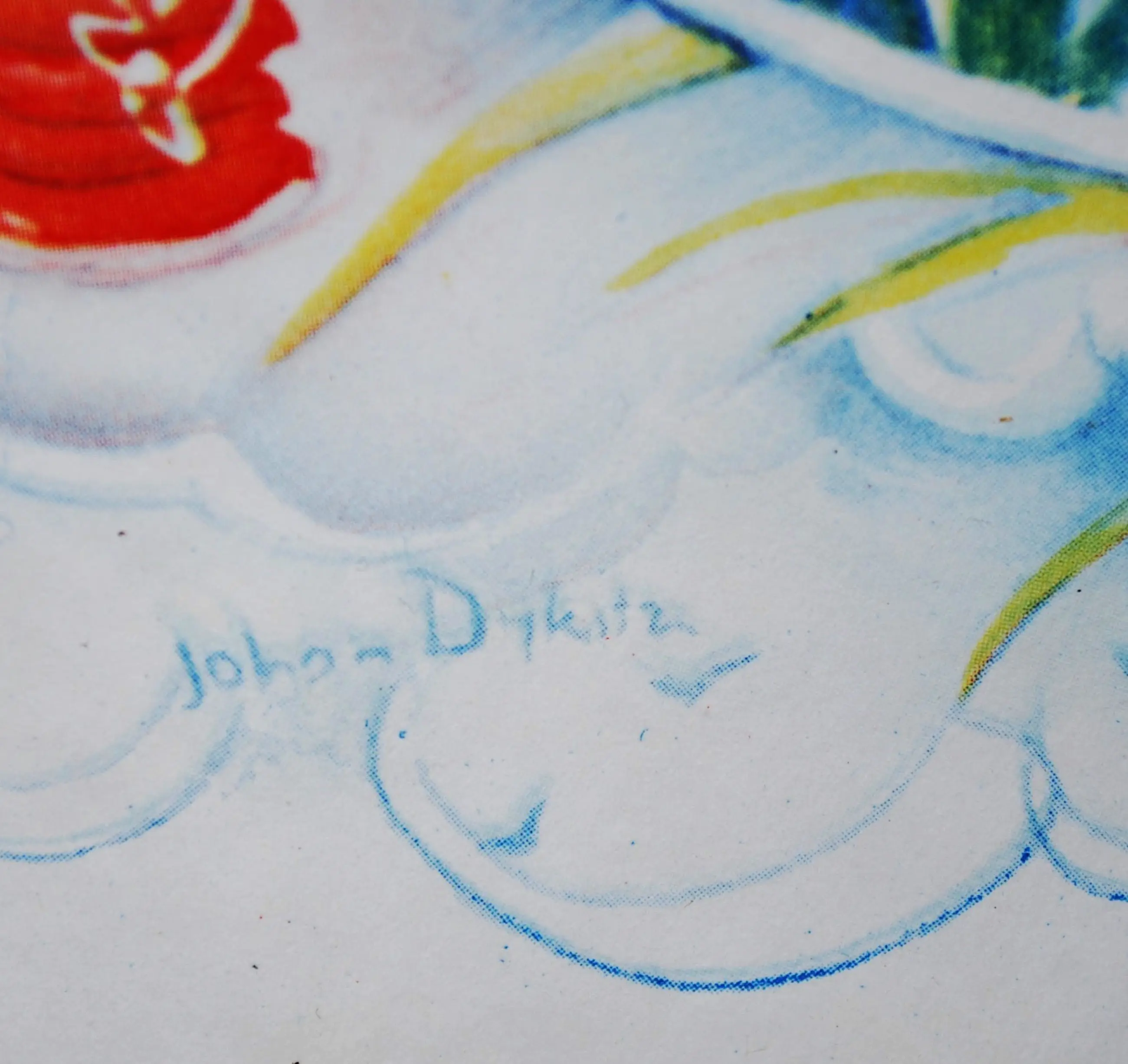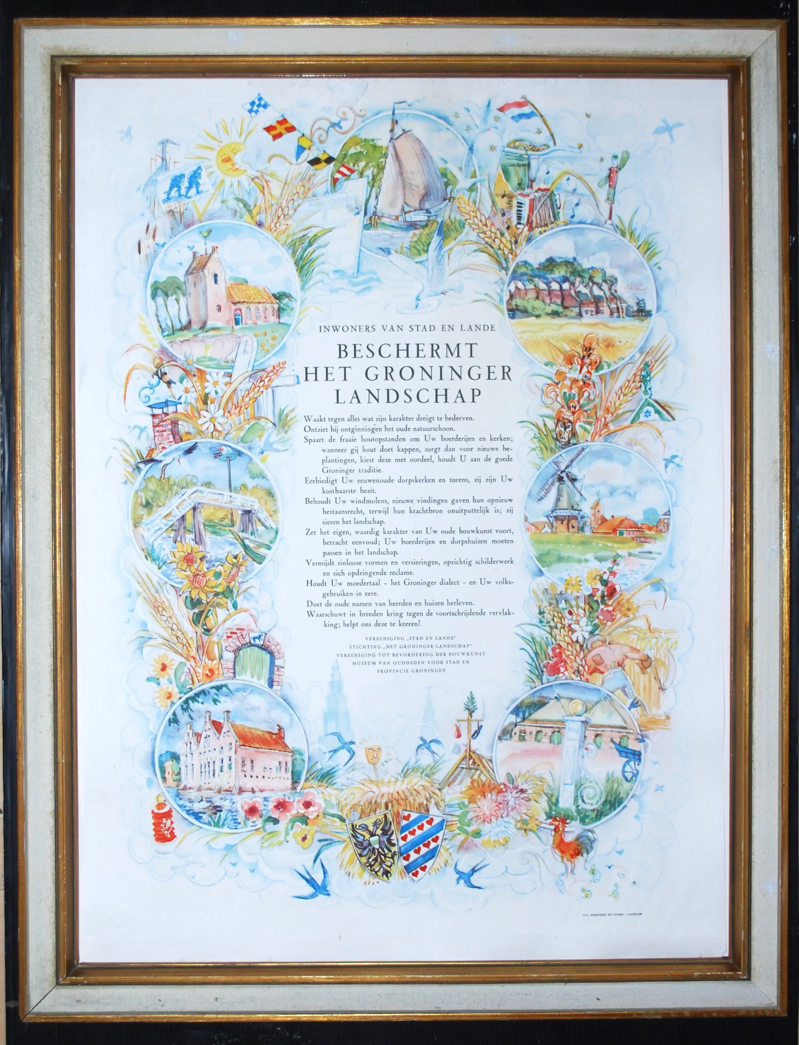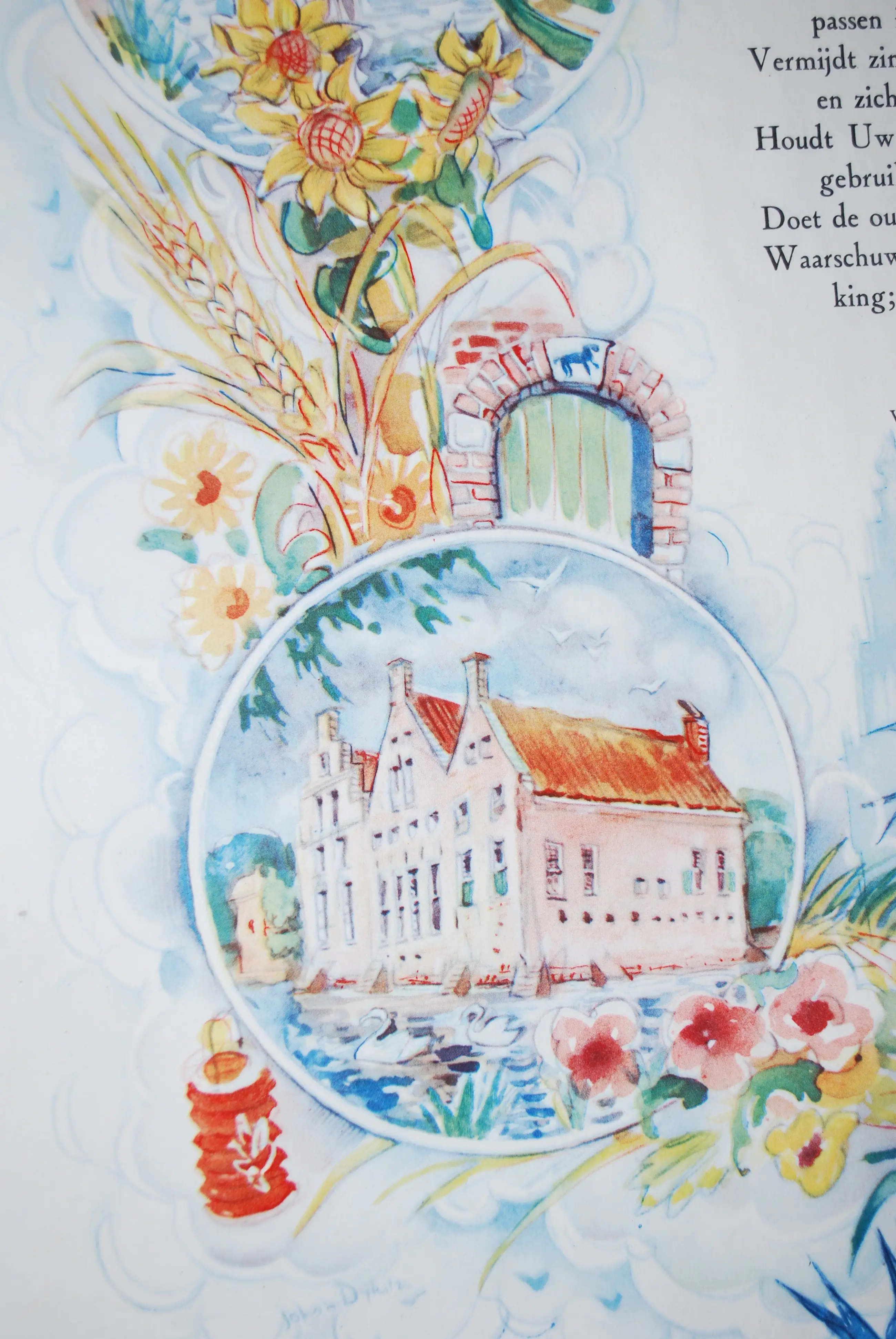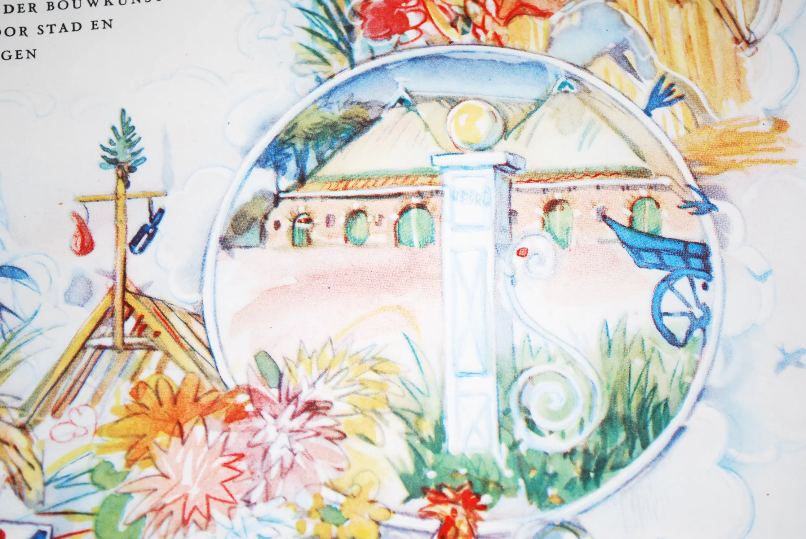 Zelden aangeboden, jaren 50/60. Techniek zal offset zijn. Het is gedrukt op goede kwaliteit dun papier. De bovenrand heeft wat papierherstel. In de druk l.o. gesigneerd.