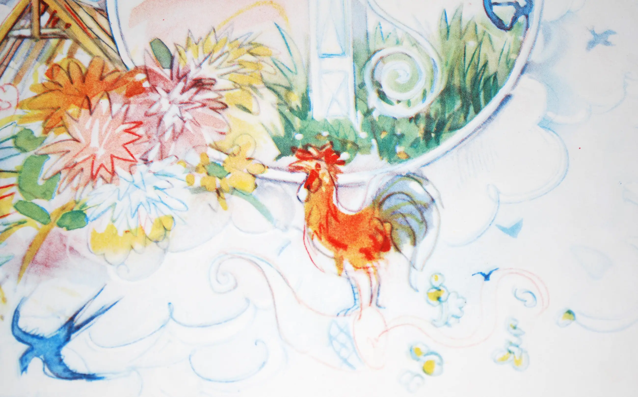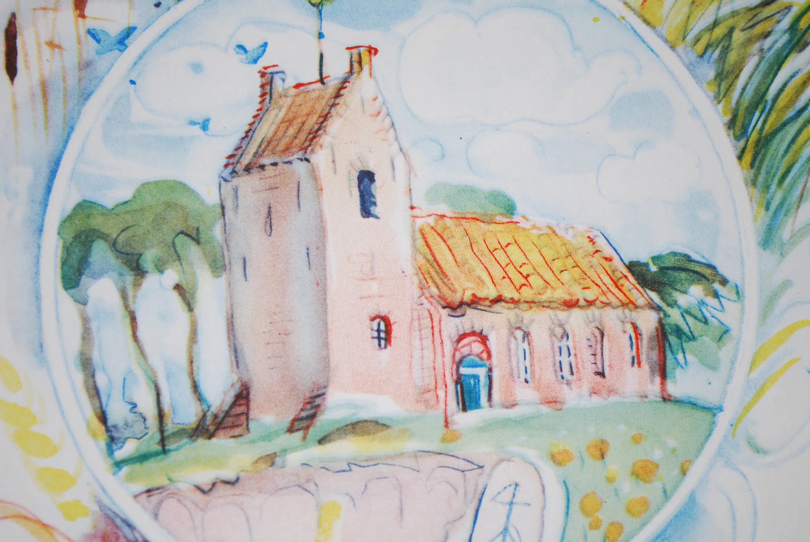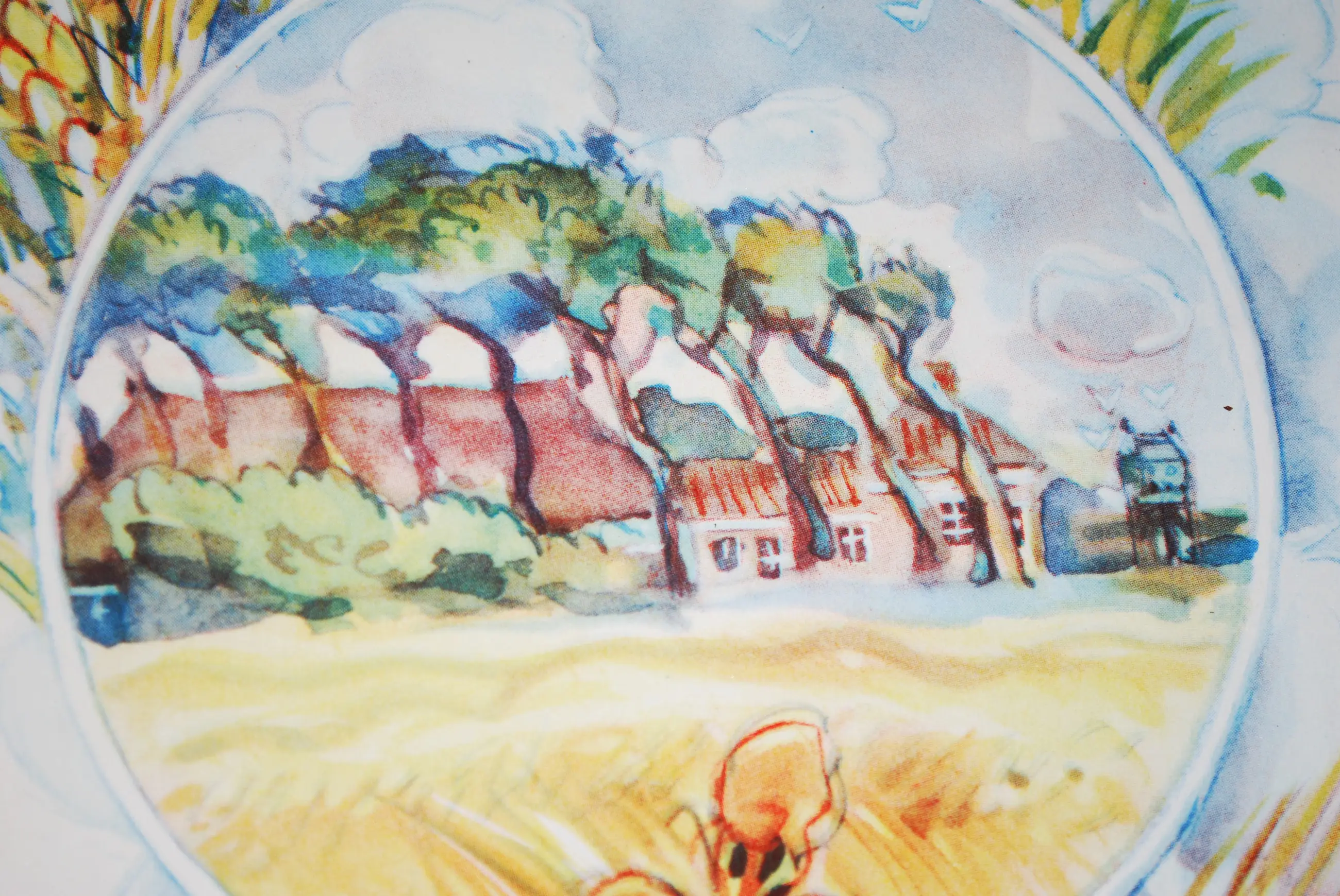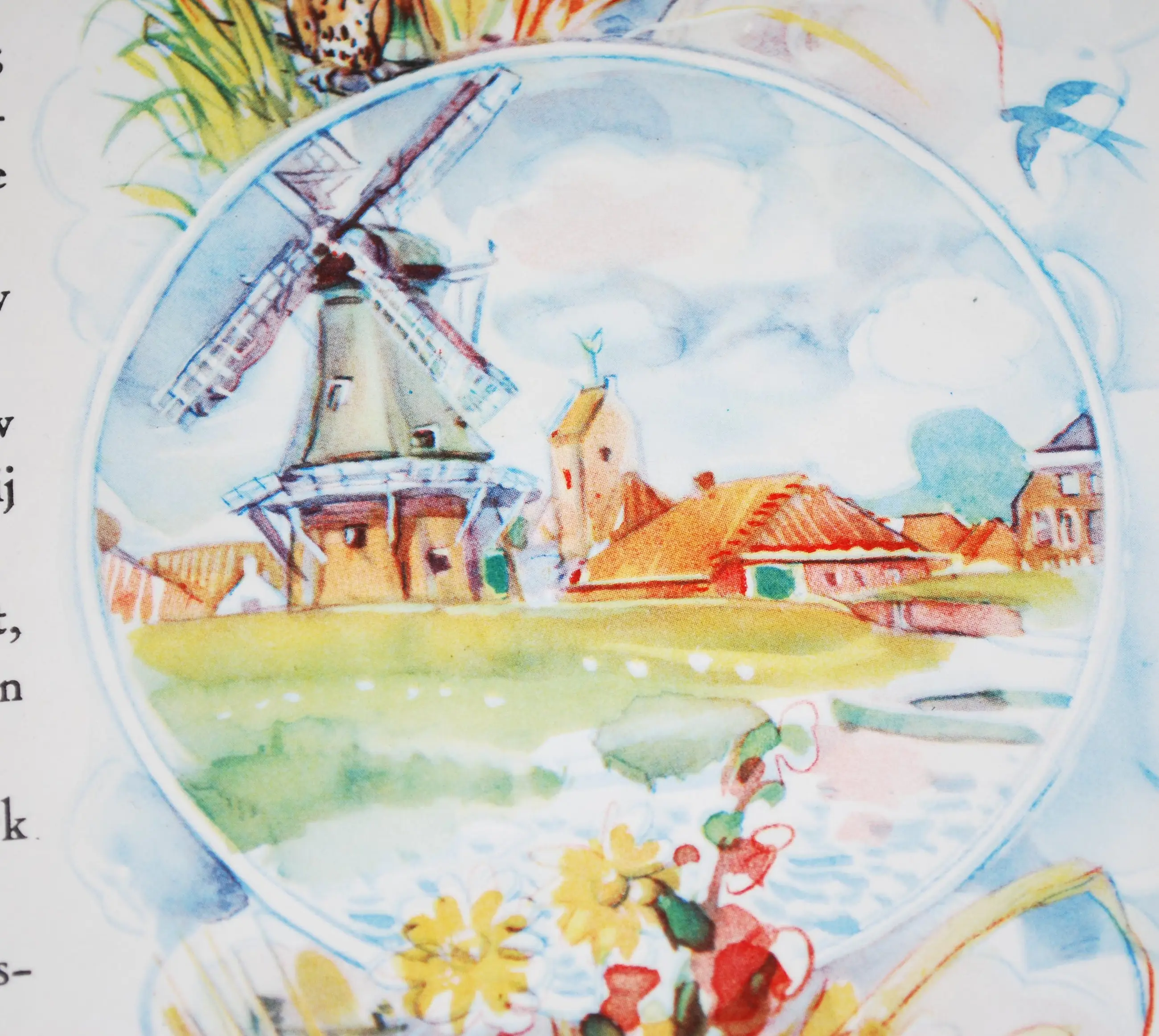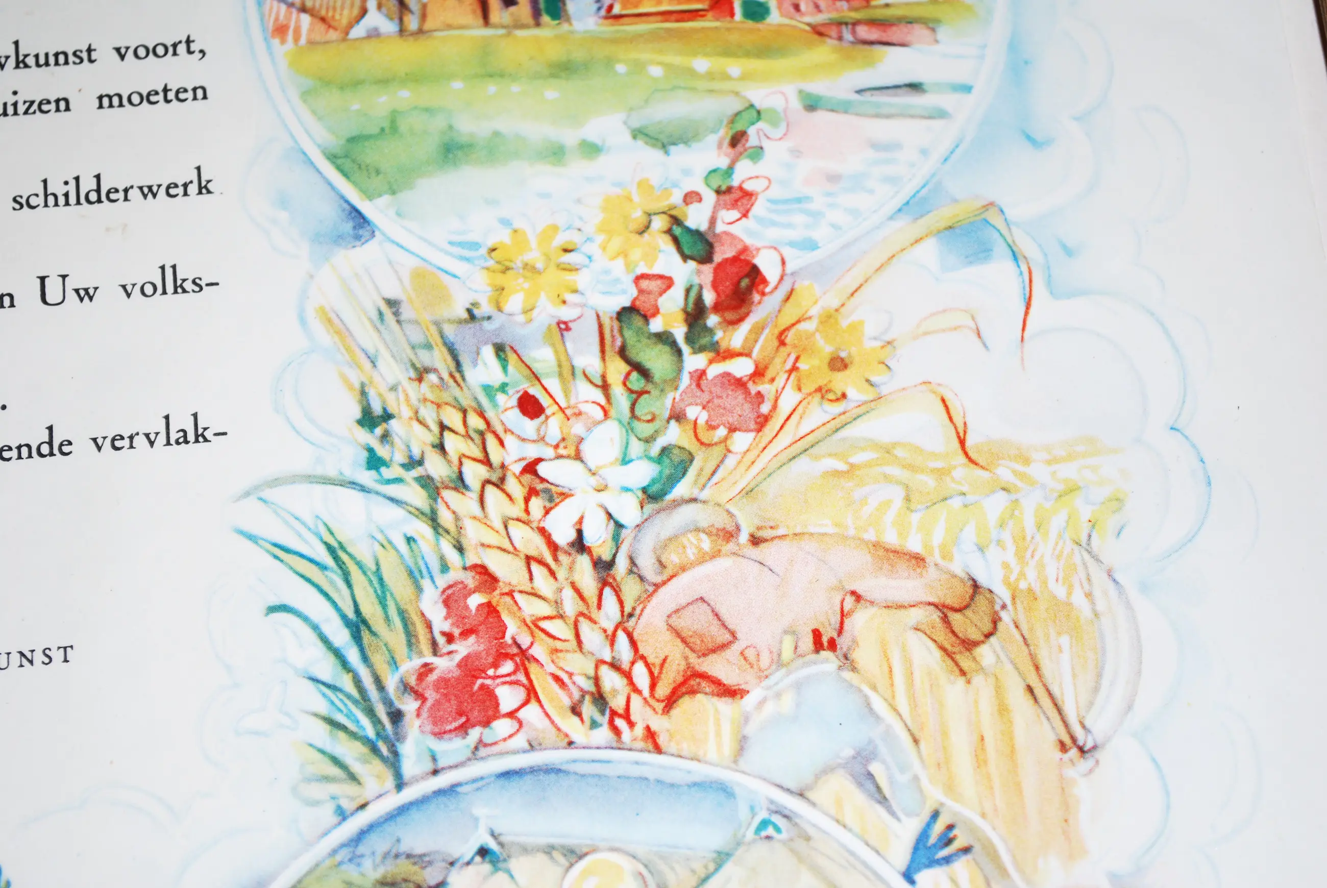 Zelden aangeboden, jaren 50/60. Techniek zal offset zijn. Het is gedrukt op goede kwaliteit dun papier. De bovenrand heeft wat papierherstel. In de druk l.o. gesigneerd.