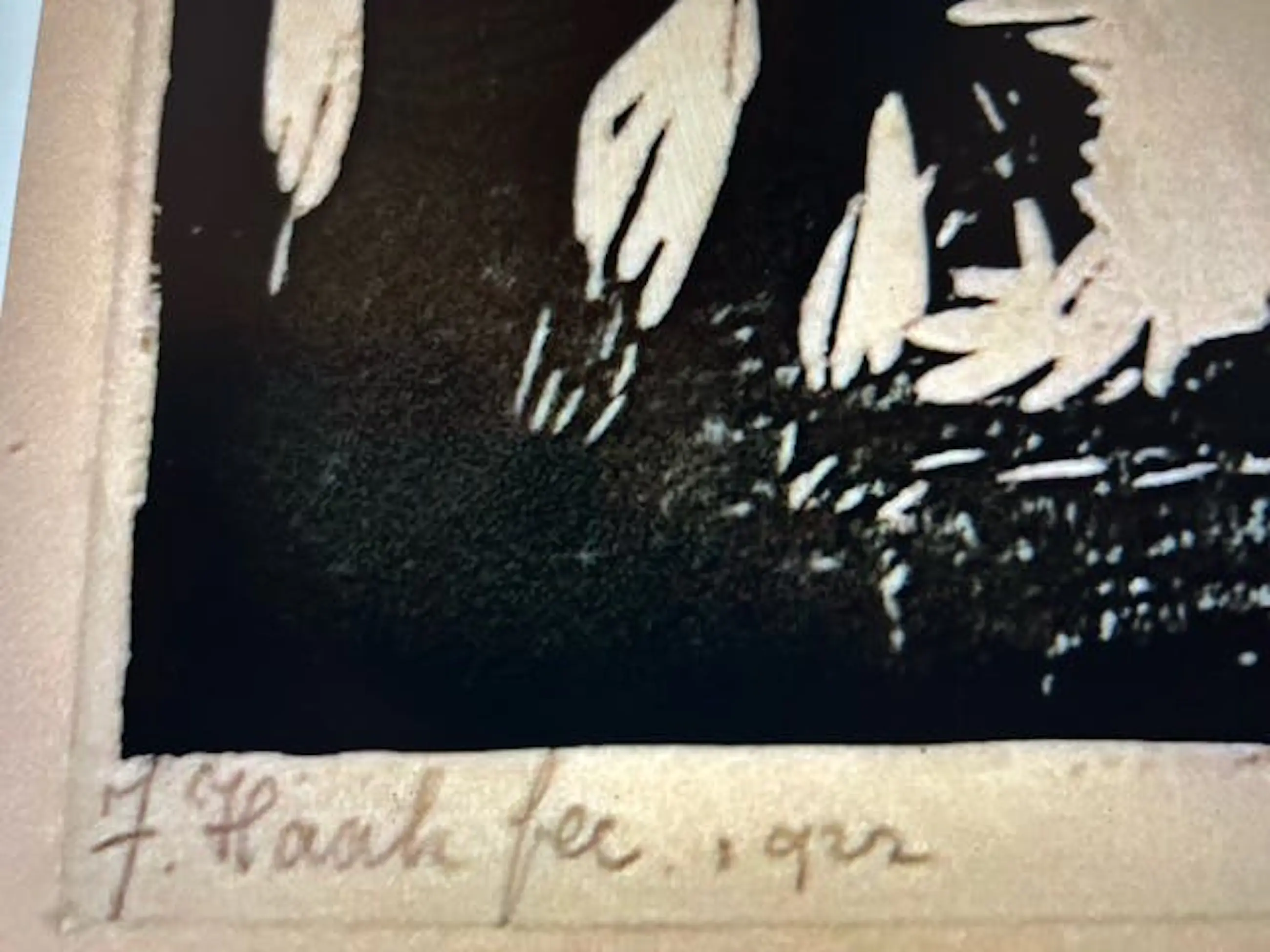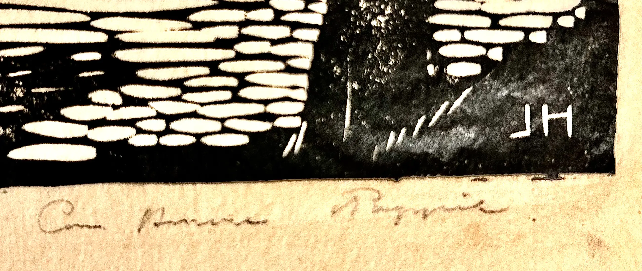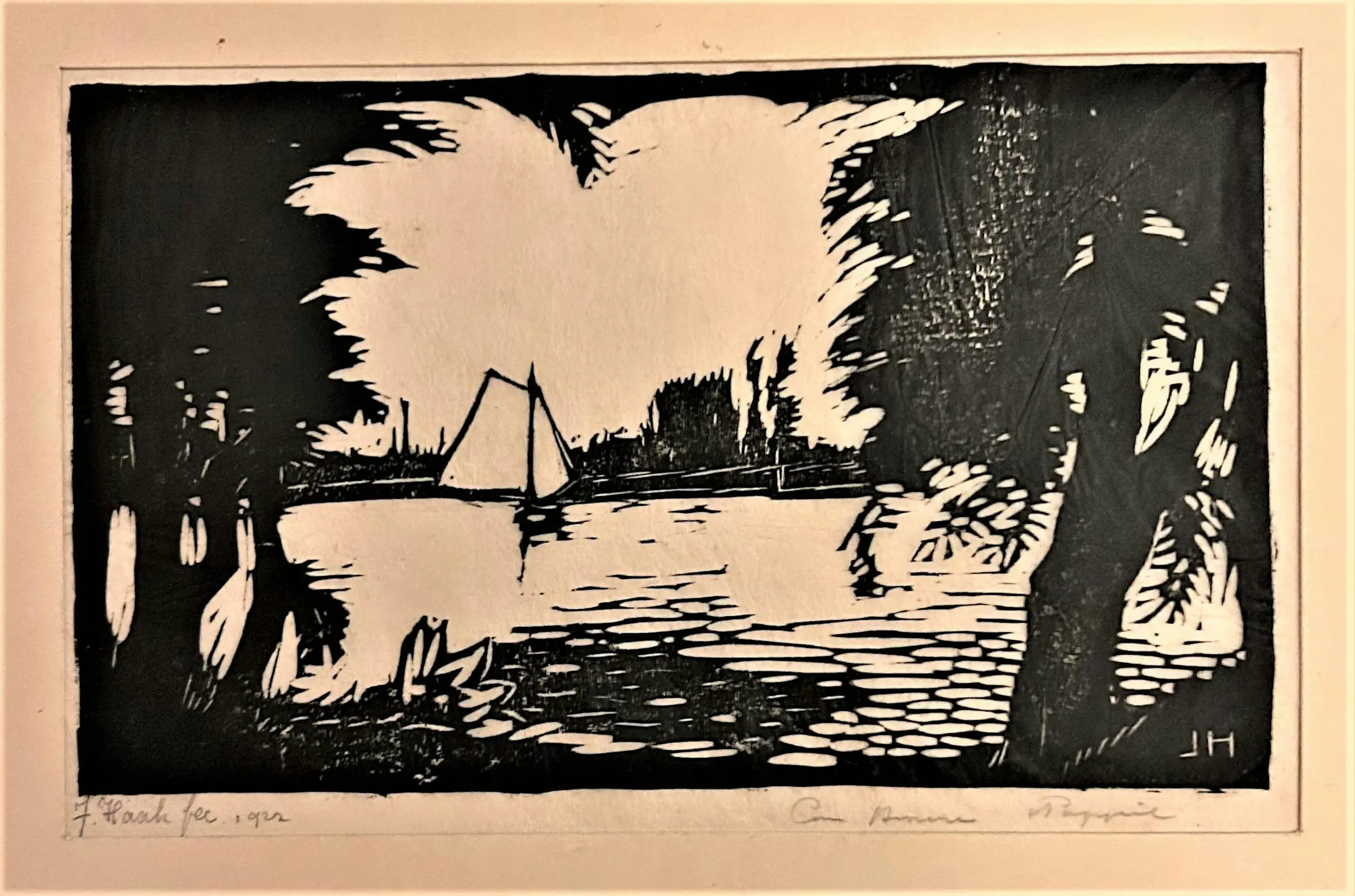 Houtsnede van Johan Haak op papier. Formaat 20,5 x 12, 5 cm zeilschip in landschap Jaartal 1921