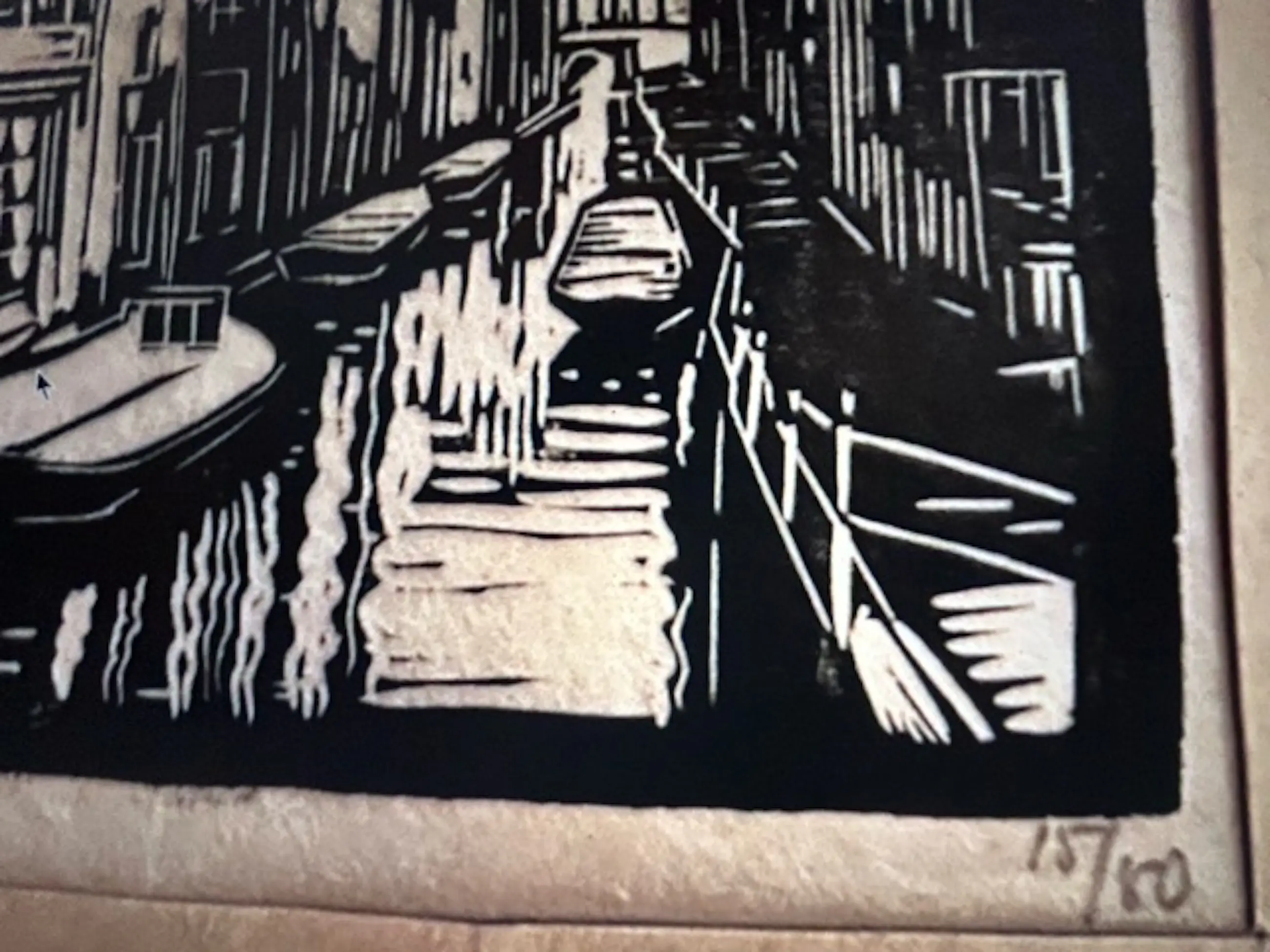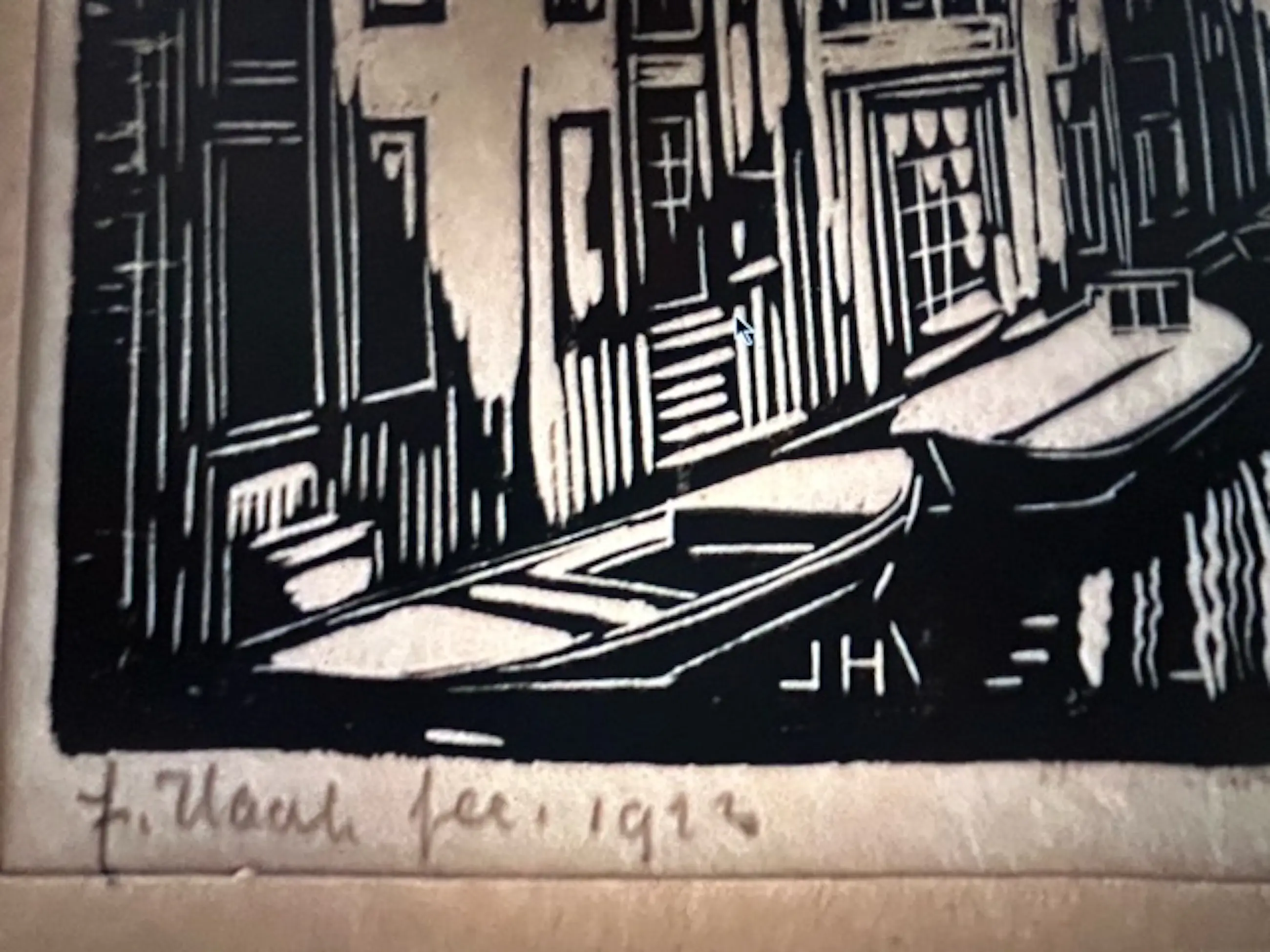 Houtsnede van Johan Haak op papier. Formaat15,5, x 12 cm # 15/50 (Stadsgezicht met gracht en kerk) Jaartal 1922 (of 1914, slecht leesbaar)