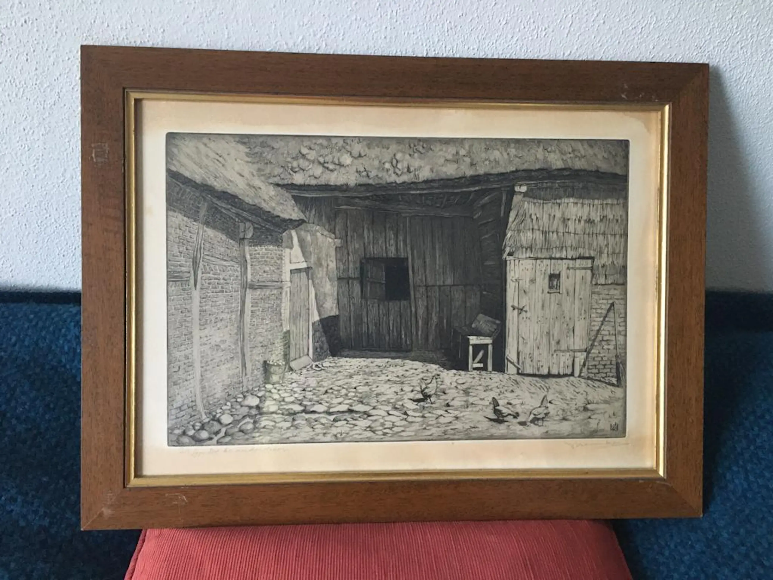 Johan Hemkes is een bekend graficus/tekenaar uit Friesland, geboren in Schalsum 1894, gestorven in Bilthoven 1988. Ets is ingelijst door kunsthandel Van Hulsen, Leeuwarden.