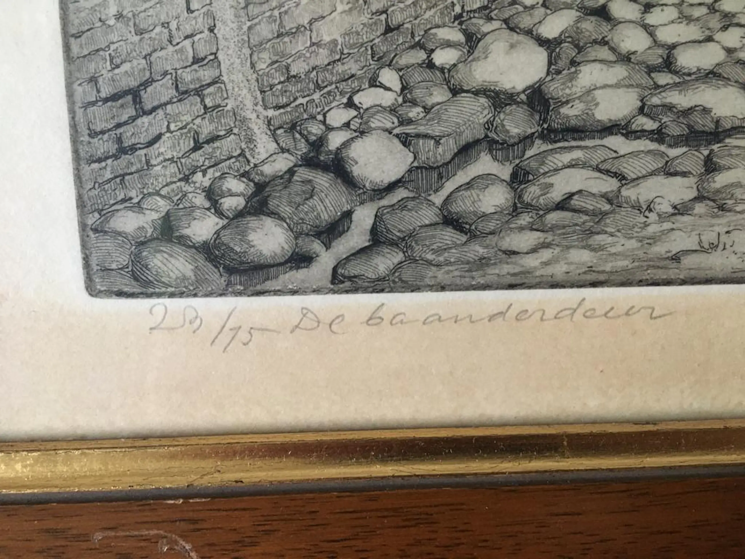 De ets achter glas ziet er prima uit, is niet uit de lijst gehaald (achterkant gesloten). De passe-partout is op sommige plekken licht verkleurd (waarschijnlijk door zuren in het gebruikte karton). De lijst is een beetje beschadigd aan het lakwerk, de gouden binnenrand oogt uitstekend.